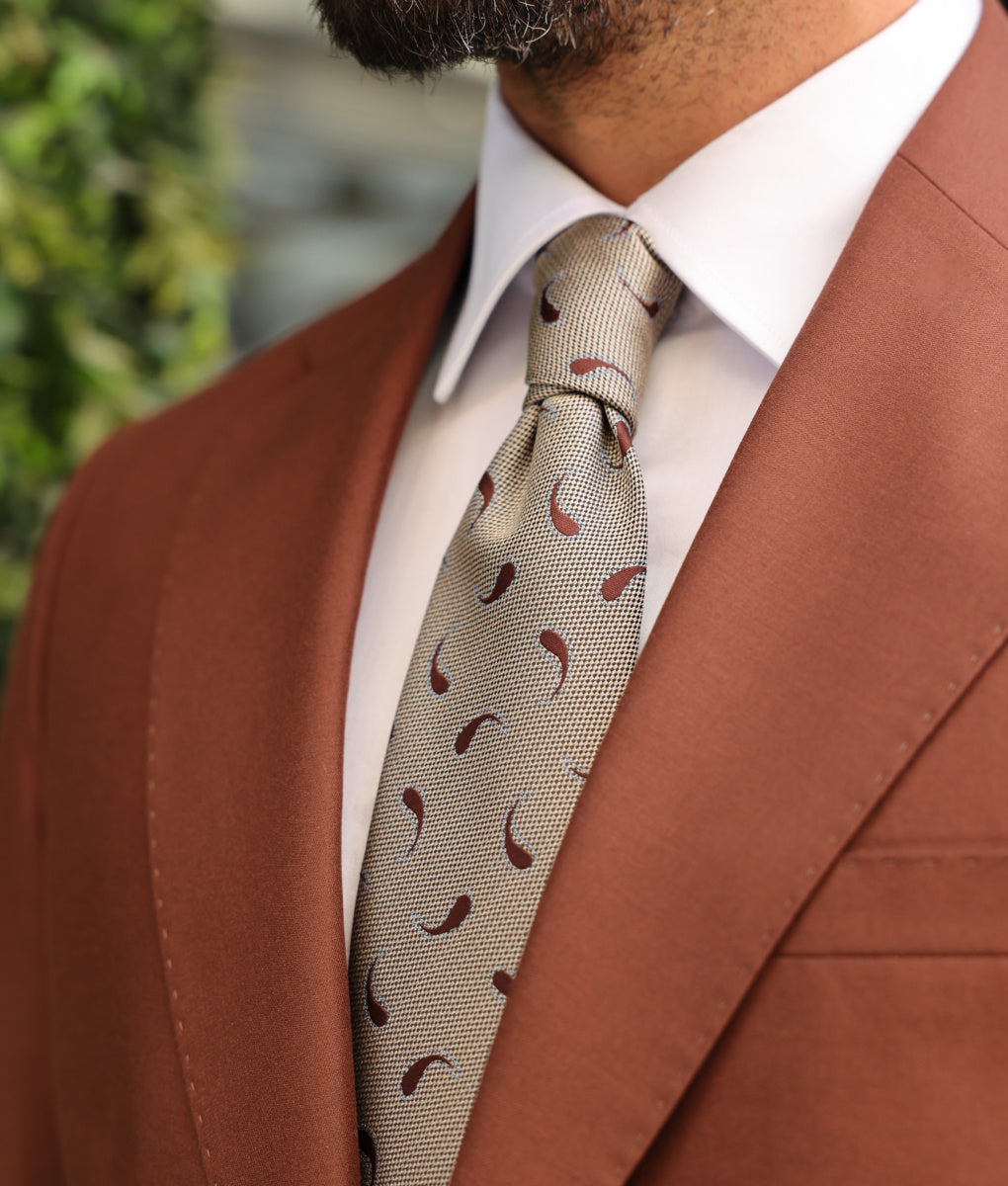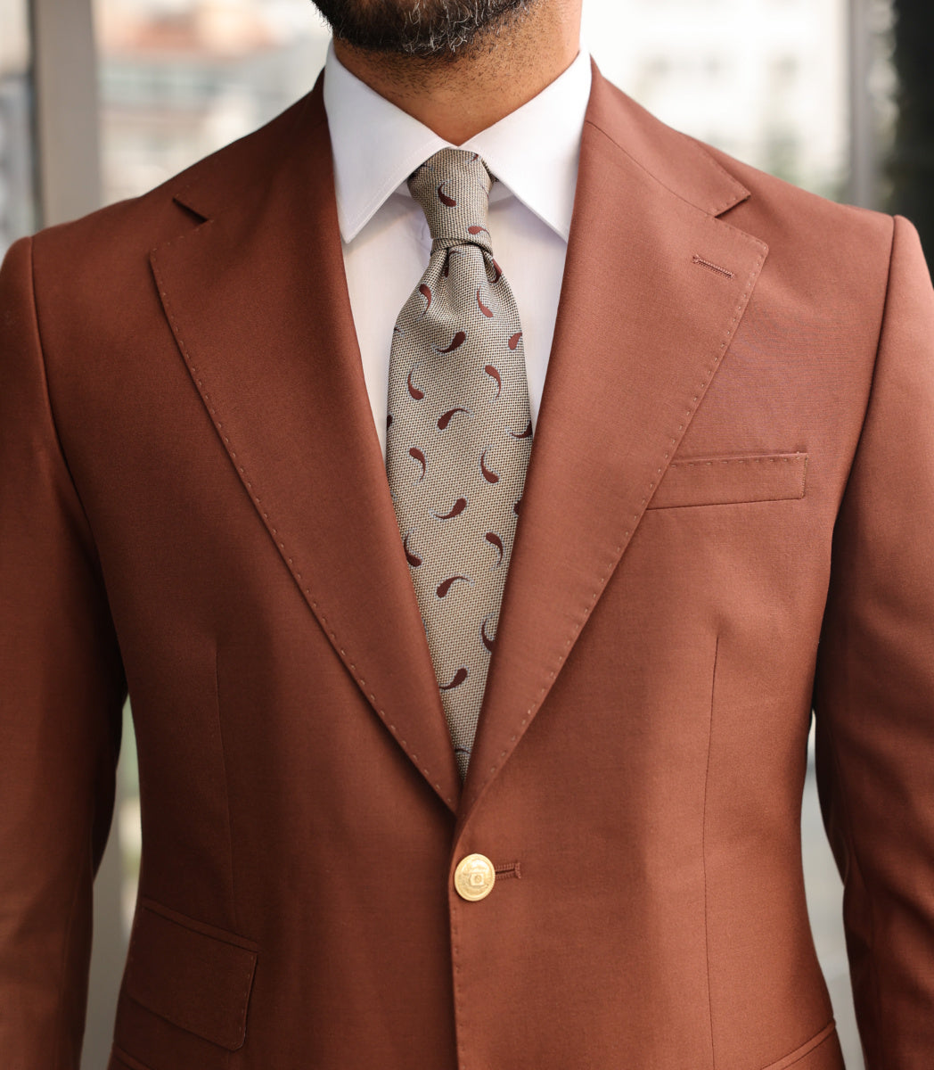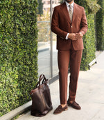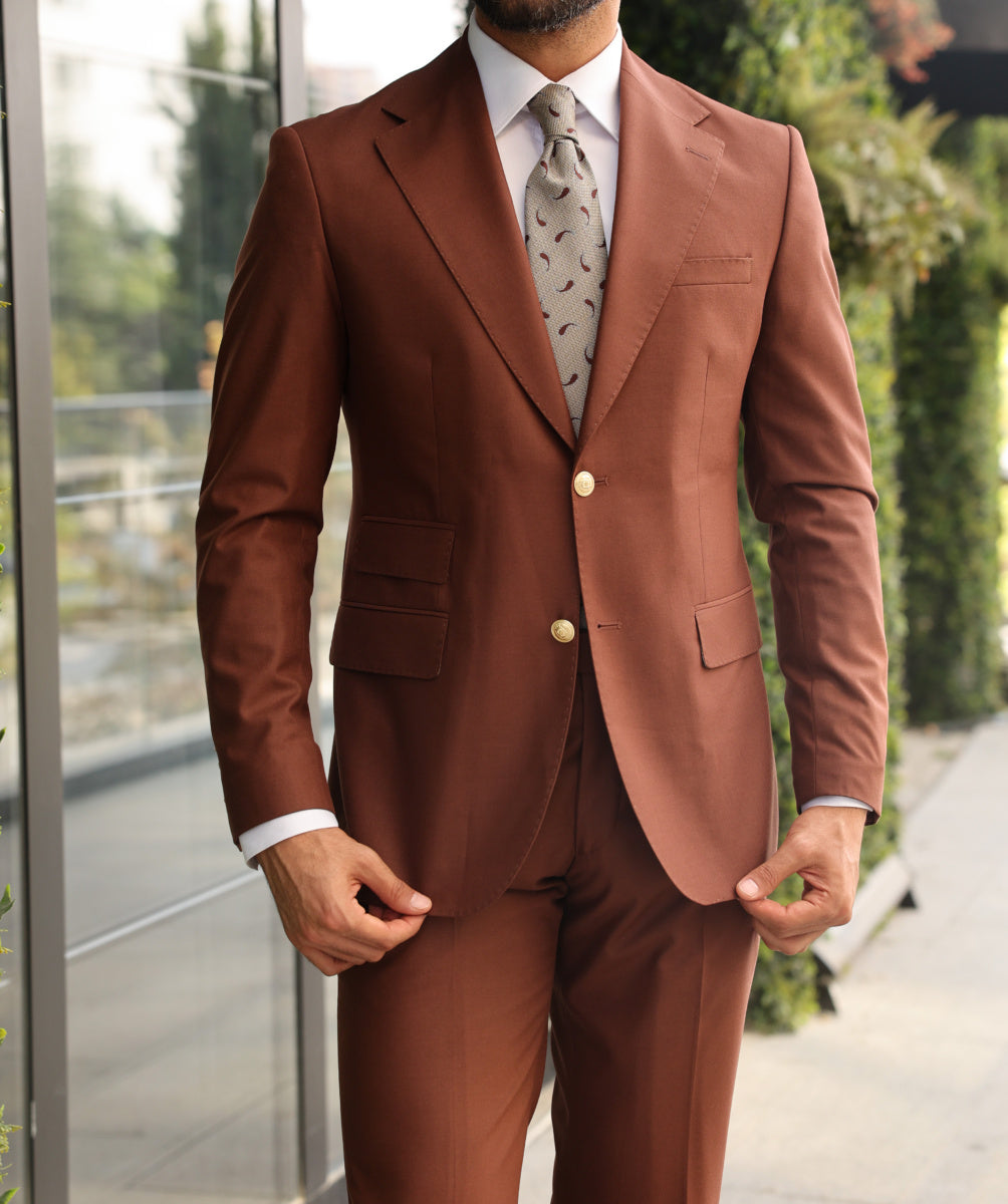 A tailored slim fit brick brown men’s two piece suit with mono lapels is a bold and stylish choice for any fashion-conscious man. The slim fit tailoring creates a modern and sharp silhouette, while the brick brown colour adds a touch of sophistication and individuality. The peak lapels add a touch of formality and style, making this suit perfect for weddings, business meetings, and other formal events.Adorned with decorative gold buttons, the suit exudes opulence and style This suit can be paired with a white or cream dress shirt, brown dress shoes, and a complementary tie to complete a polished and stylish look that exudes confidence and sophistication. Whether dressing for a traditional or modern occasion, this suit is a smart and stylish choice for any fashion-conscious man who wants to stand out in a sea of classic navy and grey suits.
