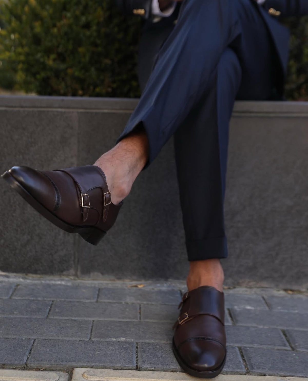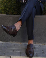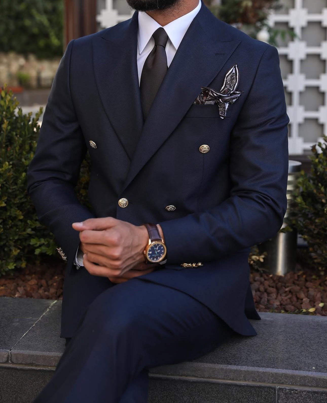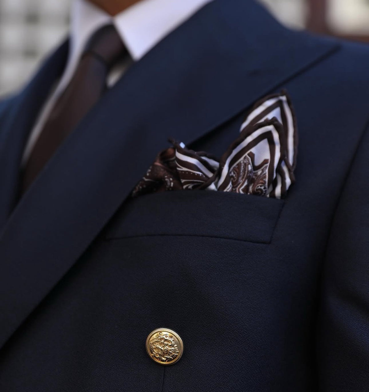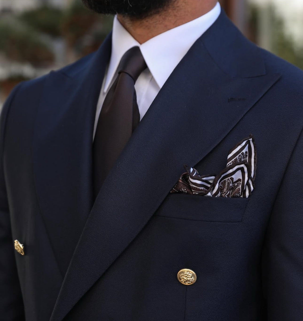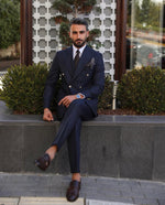 A tailored slim fit royal navy blue double breasted men’s suit with decorative gold buttons and peak lapels is a classic and timeless option for a formal or semi-formal occasion. The deep navy blue colour is versatile and sophisticated, while the slim fit cut and double breasted style offer a sleek and modern look. The decorative gold buttons add a touch of luxury and elegance to the suit, making it a standout choice. Paired with a white dress shirt and black leather dress shoes, this suit is sure to impress.