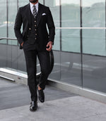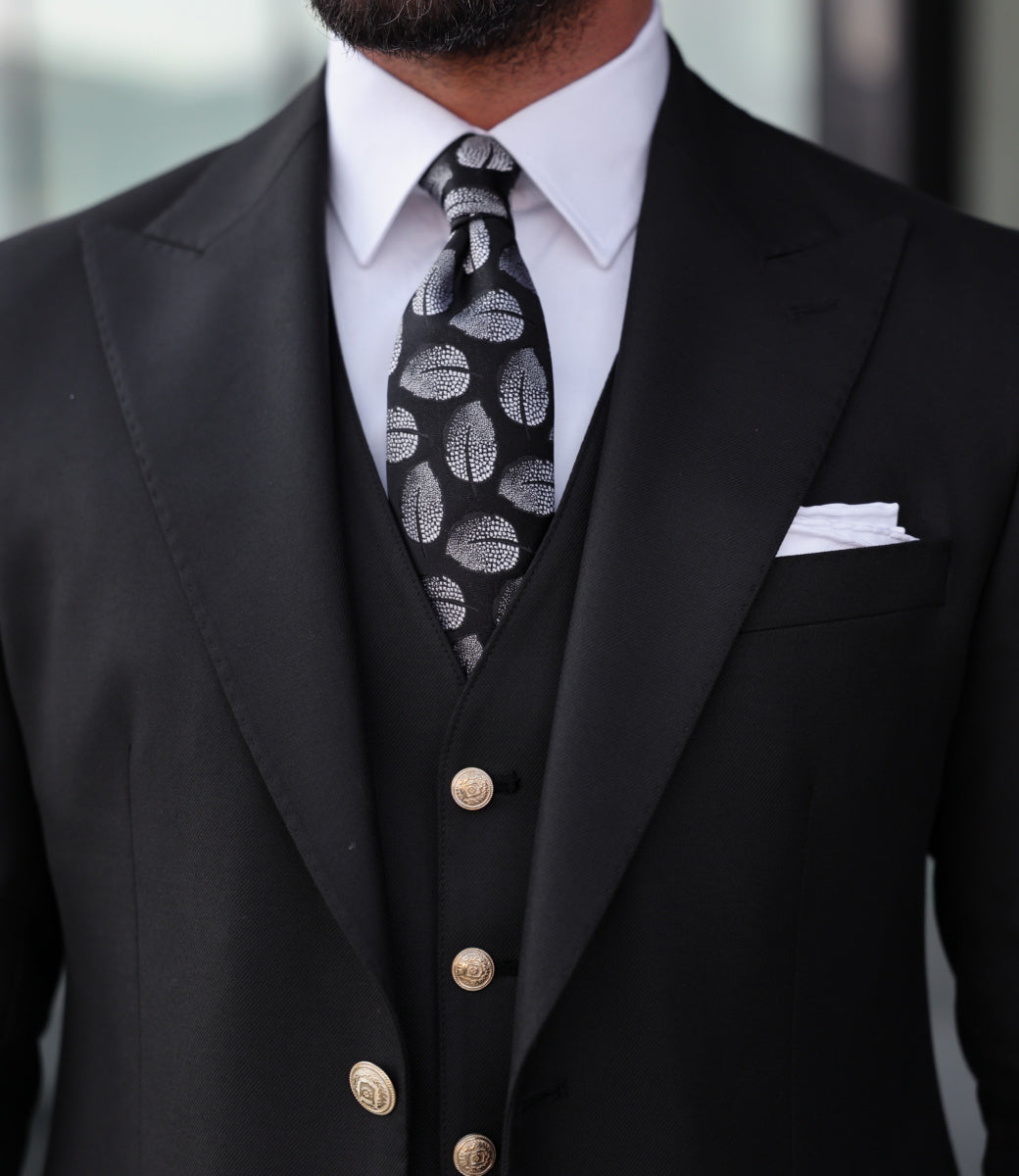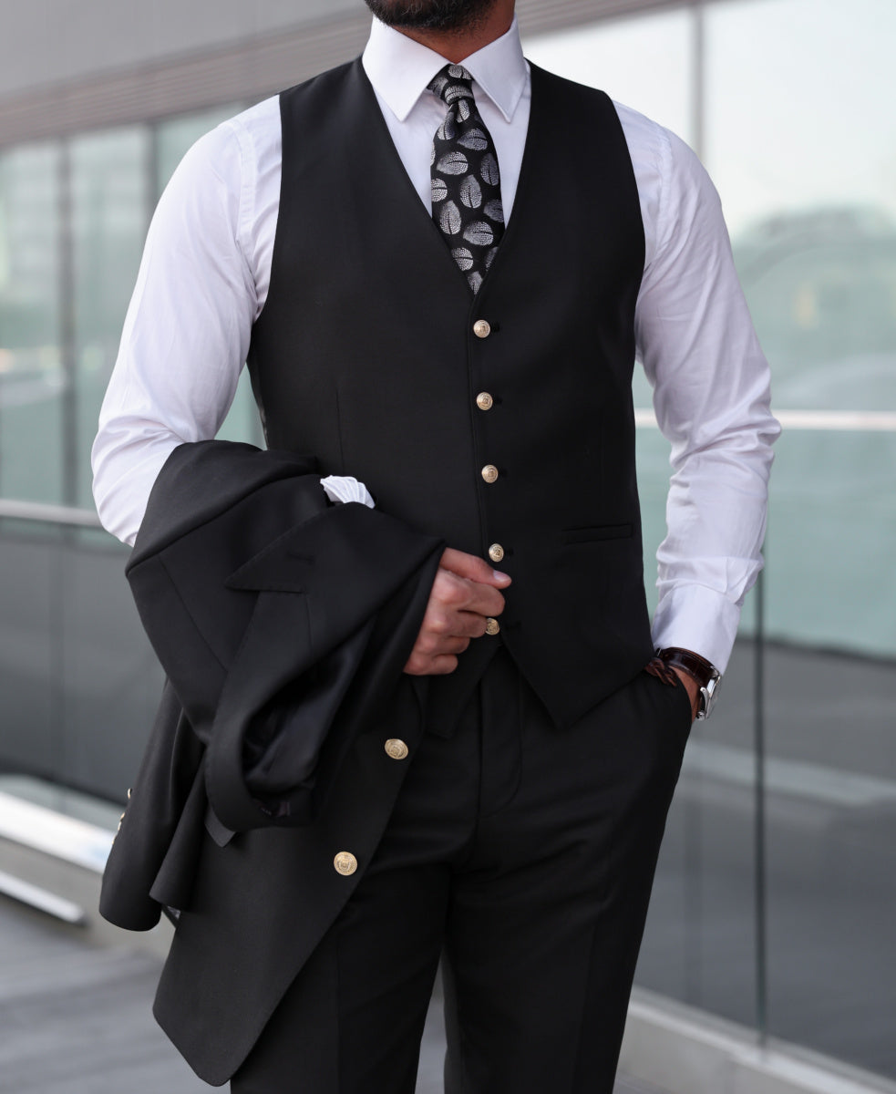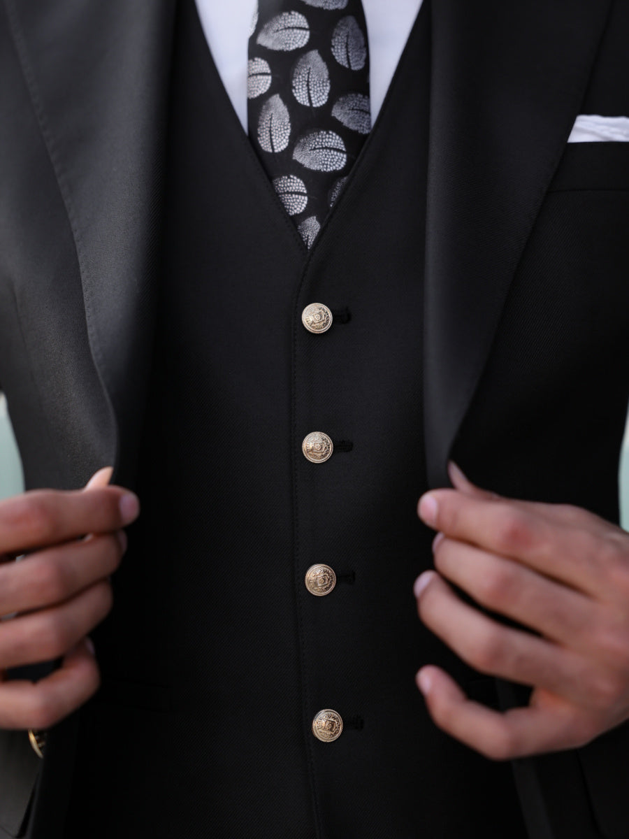 A black three piece suit is a stylish and sophisticated choice for any formal occasion. The black colour is warm and versatile, and the three piece style adds a touch of refinement and polish to the suit. A three piece suit consists of a jacket, waistcoat, and trousers, all expertly tailored to create a cohesive and polished look. The jacket is typically single breasted with peak lapels and a two button closure, while the waistcoat features a V-neck and button front. Adorned with decorative gold buttons, the suit exudes opulence and style The trousers are tailored with a slim fit and a flat front for a modern silhouette. Whether paired with a crisp white shirt and dress shoes, or dressed down with a casual button-up and sneakers, a black three piece suit is sure to make a stylish statement.