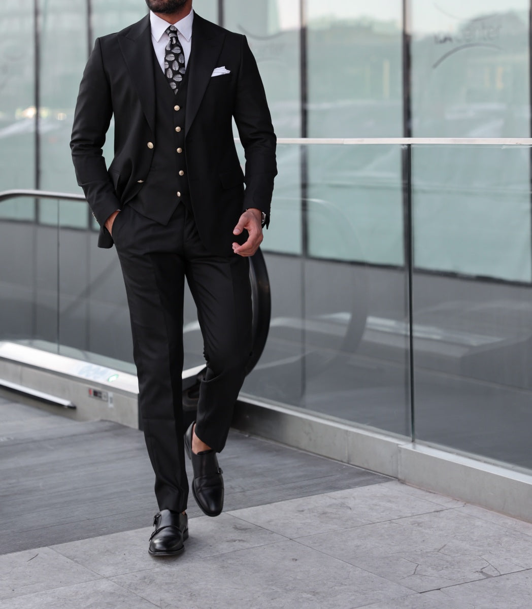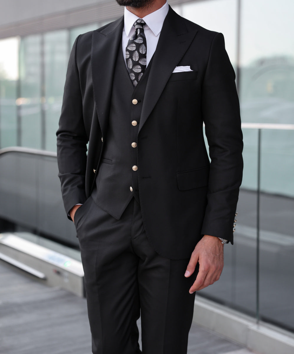 SLIM FIT BLACK THREE PIECE MEN’S SUIT WITH PEAK LAPELS WITH decorative gold buttons.