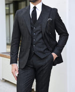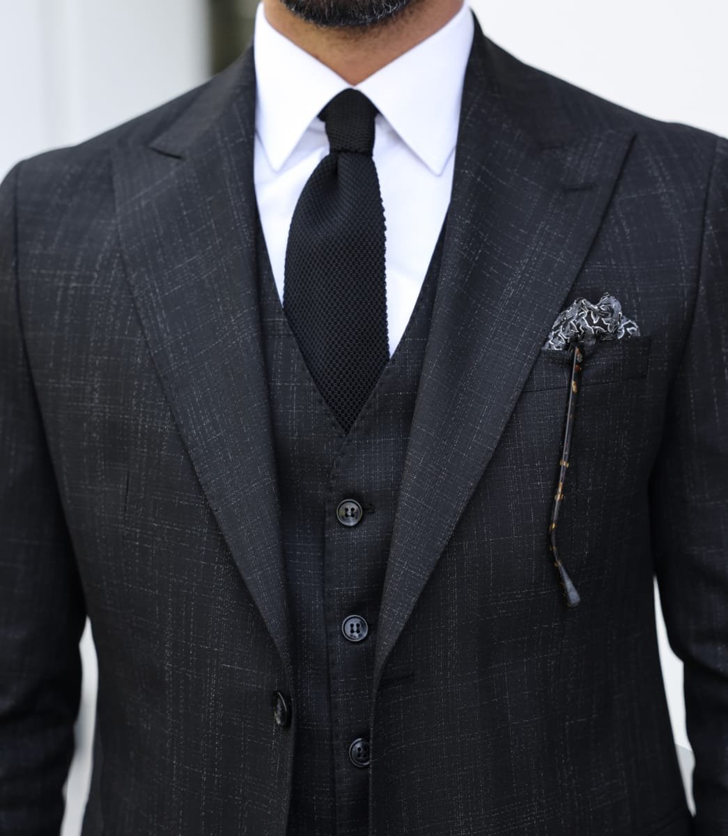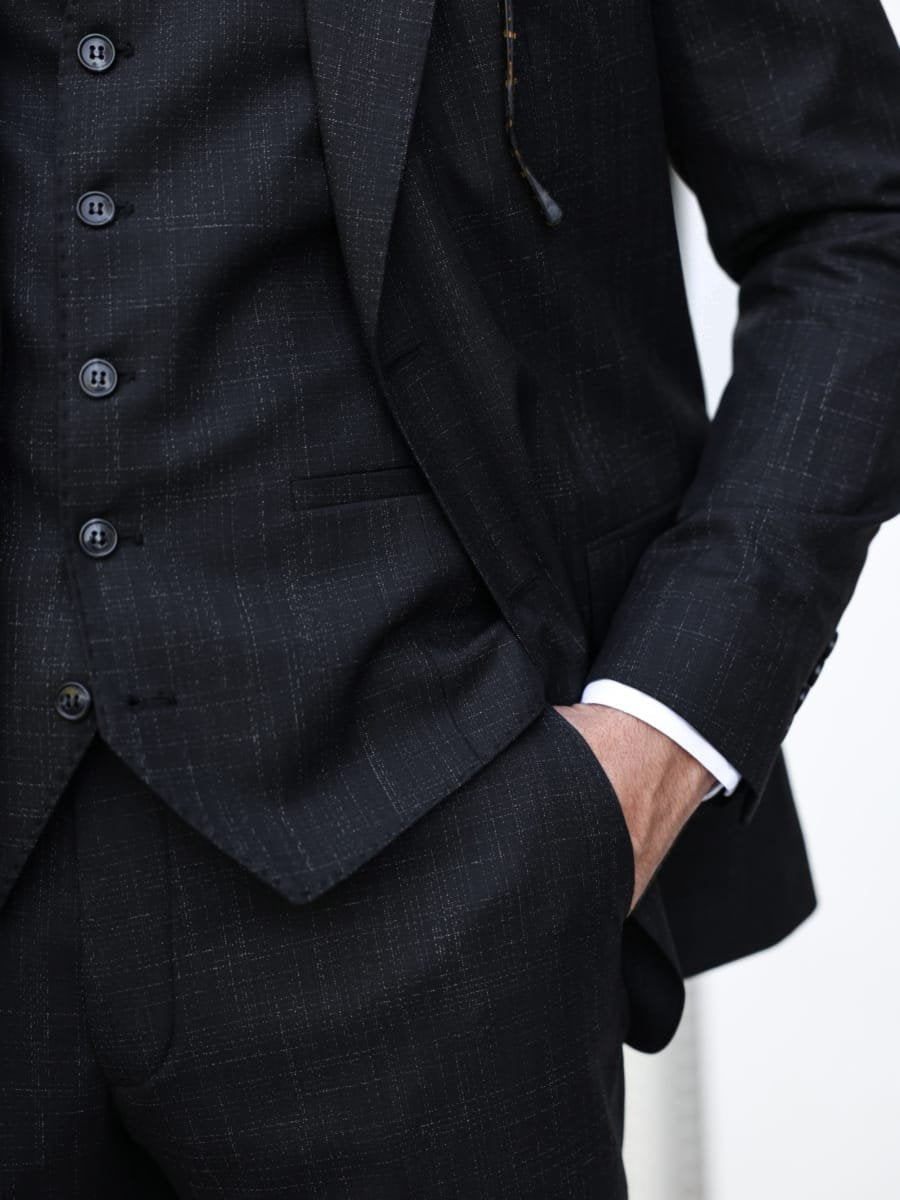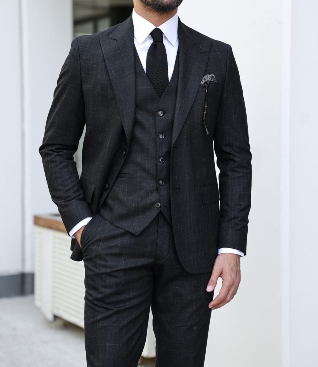 A slim fit men’s sketched checked black three-piece suit with peak lapels is a stylish and sophisticated choice for any formal occasion. The all-black colour creates a sleek and modern look, while the peak lapels add a touch of elegance. The slim fit of the suit creates a streamlined silhouette, giving a sharp and modern appearance. The three-piece design includes a jacket, waistcoat, and trousers, adding an extra touch of sophistication to the outfit. Pair it with a white dress shirt and black leather shoes for a classic and timeless look, or add a pop of colour with a bold tie or pocket square. This suit is perfect for anyone looking to make a statement at a formal event.