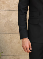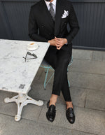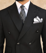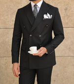 Tailored slim fit all black double breasted men’s suit with peak lapels