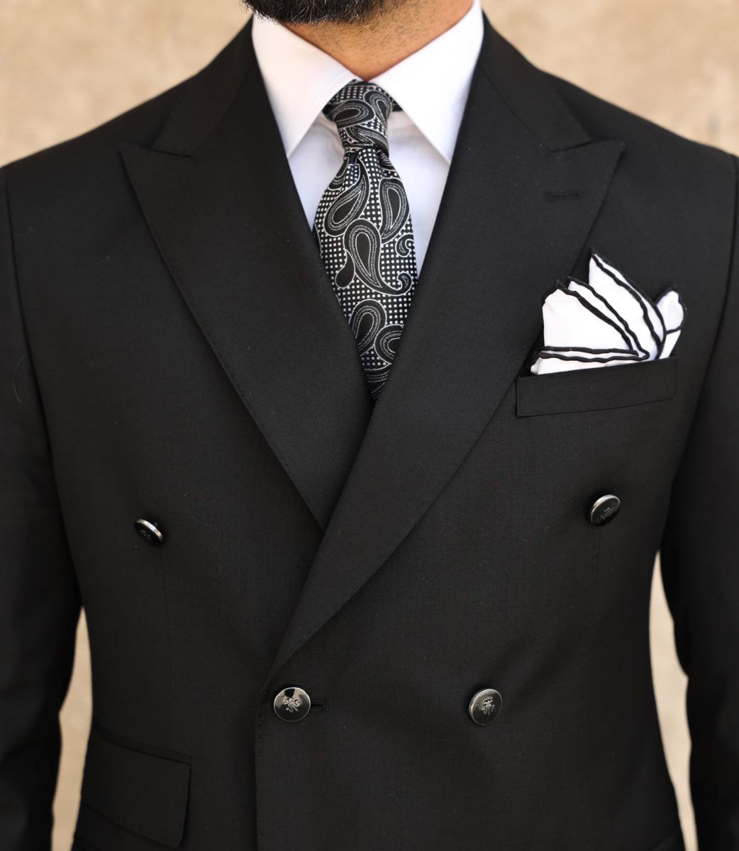 A tailored slim fit all-black double-breasted men’s suit with peak lapels is a timeless and sophisticated choice for formal events or professional occasions. The slim fit silhouette creates a modern and streamlined look, while the double-breasted design and peak lapels add a touch of traditional elegance. Pair it with a crisp white dress shirt, a black silk tie, and black dress shoes for a sleek and polished finish. It’s important to ensure that the suit fits perfectly for a flawless appearance.