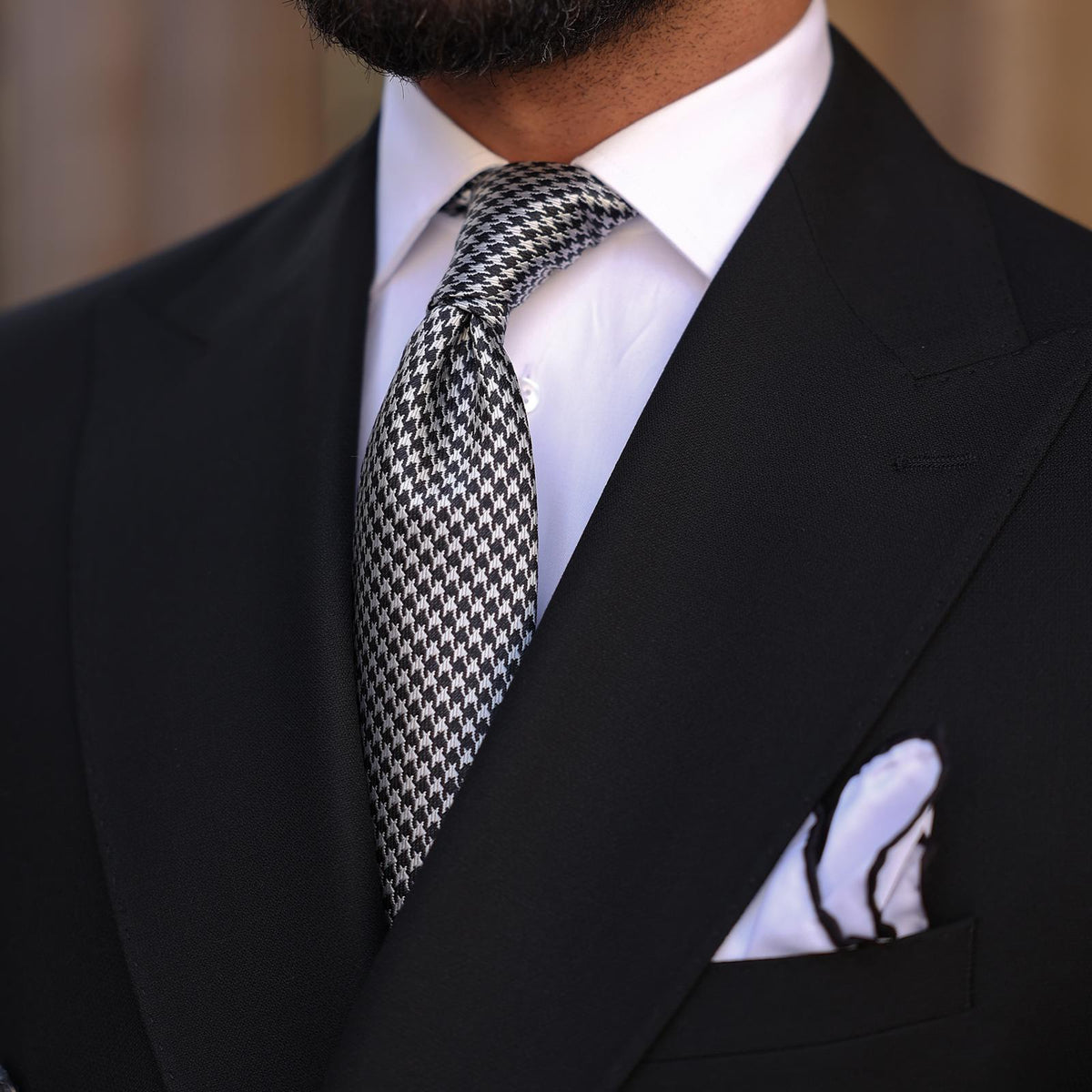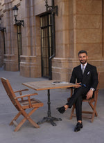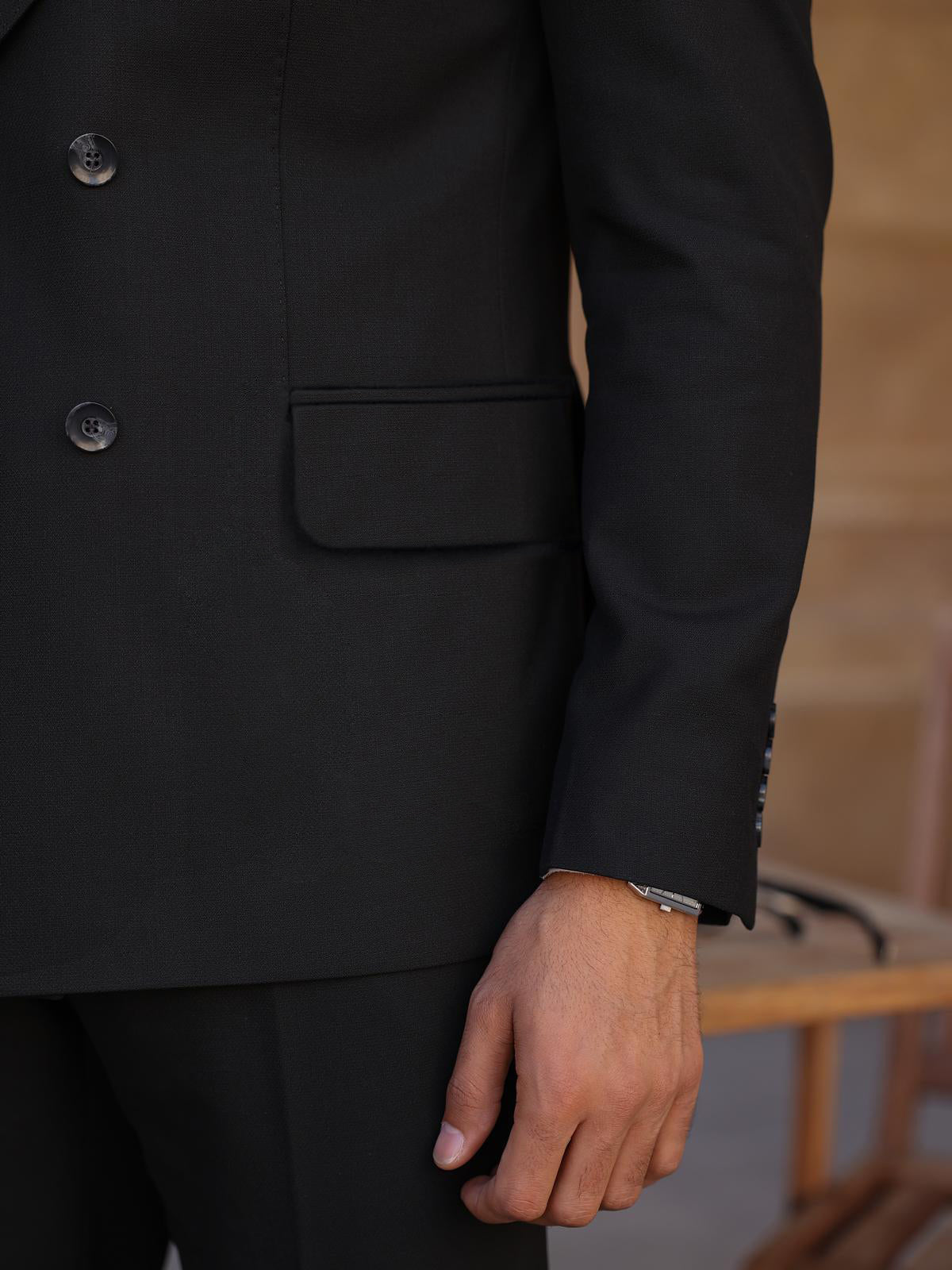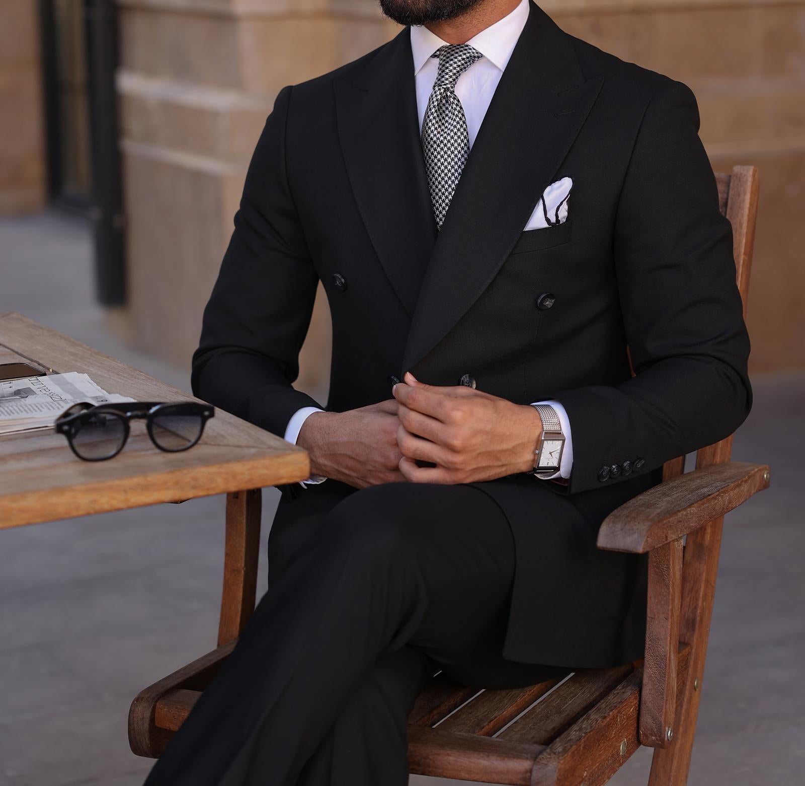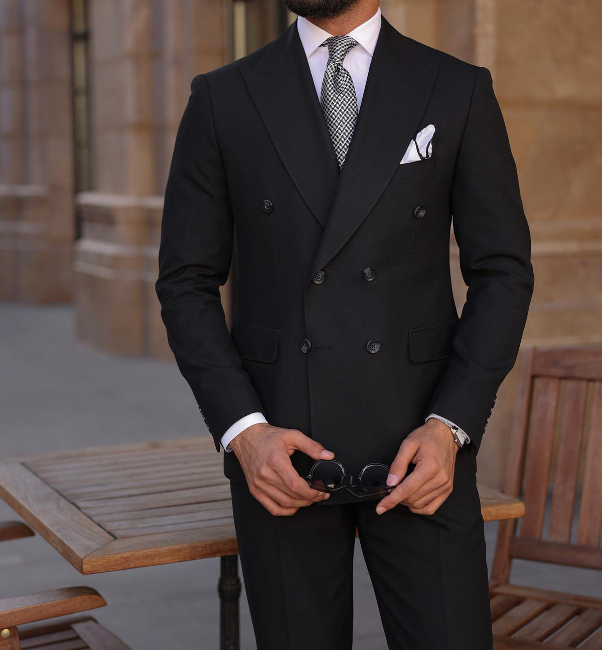Step into refined elegance with a tailored slim fit black double-breasted men’s suit. The alluring black hue adds a unique twist to traditional suiting, while the double-breasted design and peak lapels exude sophistication. Perfect for upscale events or formal occasions, this suit effortlessly blends modern aesthetics with classic charm. Its precise tailoring ensures a sleek silhouette that flatters your physique. The structured jacket, adorned with peak lapels, complements the streamlined trousers for a balanced ensemble. Embrace the versatility of black, allowing you to create various shirt and tie combinations. Make a memorable impression with this meticulously crafted men’s suit, showcasing your distinct style.