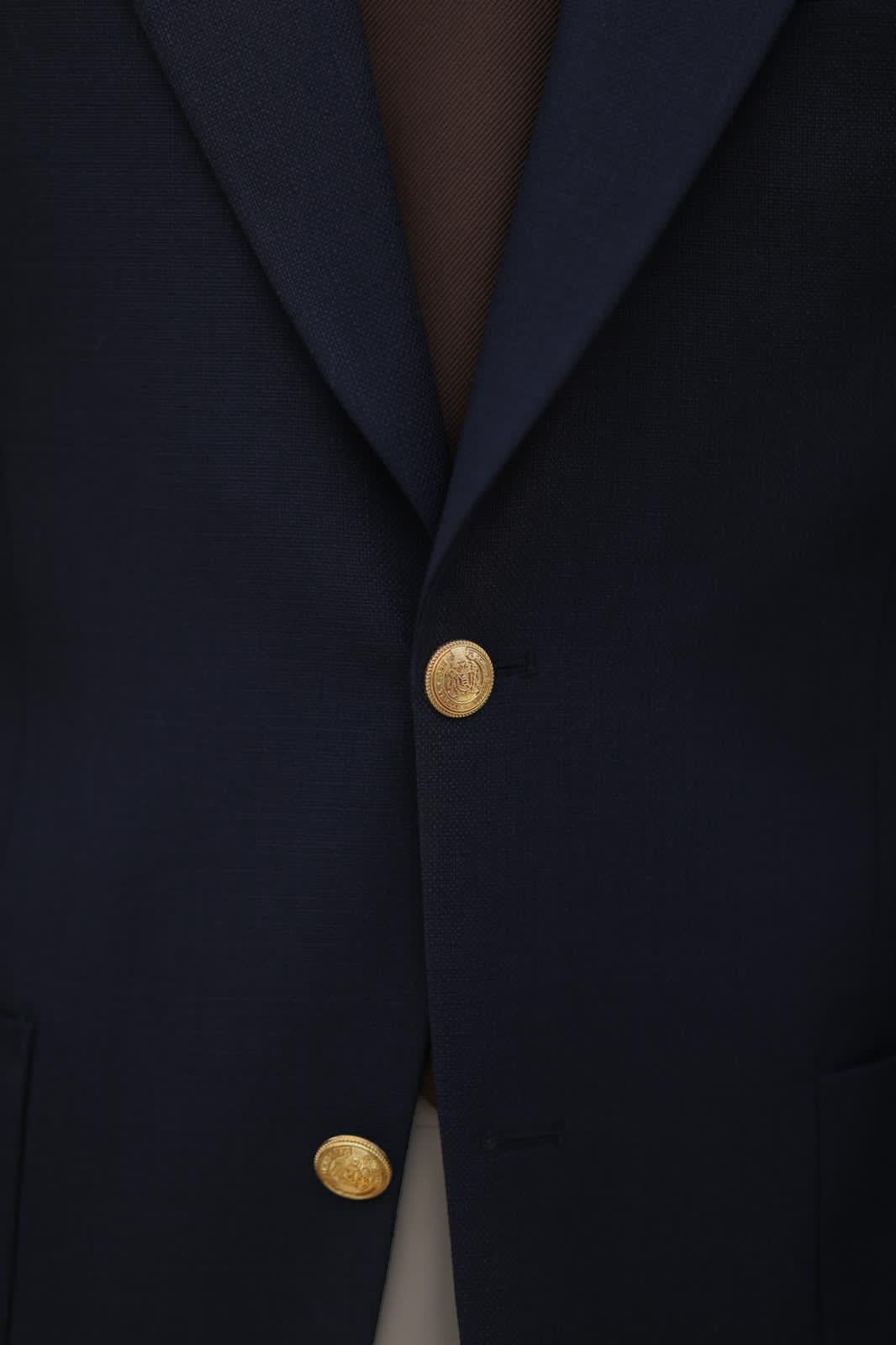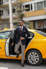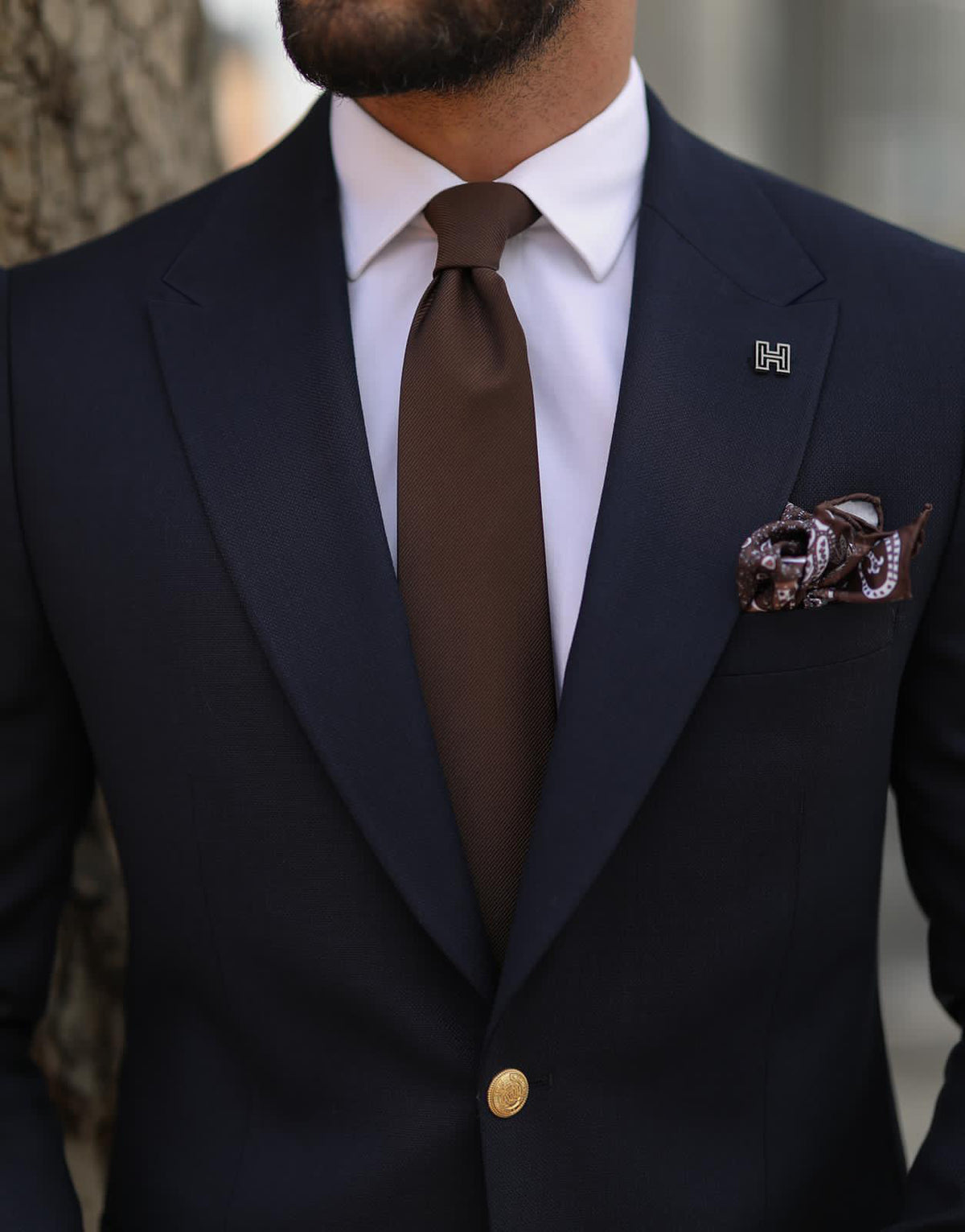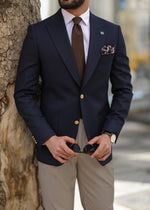 A dark blue plain blazer paired with latte trousers is a classic and stylish combination for any occasion. The dark blue plain blazer adds a touch of texture and pattern to the outfit, while the latte trousers provide a sleek and sophisticated base. Adorned with decorative gold buttons, the suit exudes opulence and style. This combination is perfect for both casual and formal occasions, and can be dressed up or down with the right accessories and shoes.