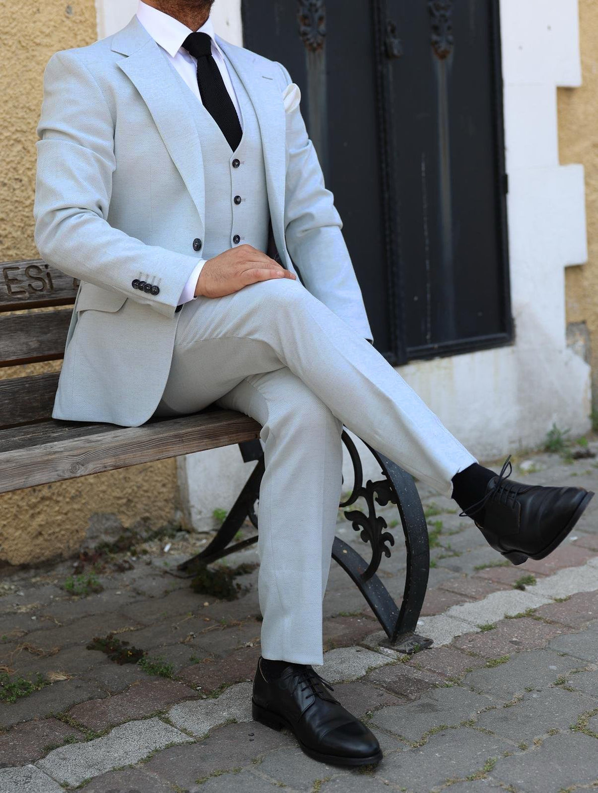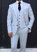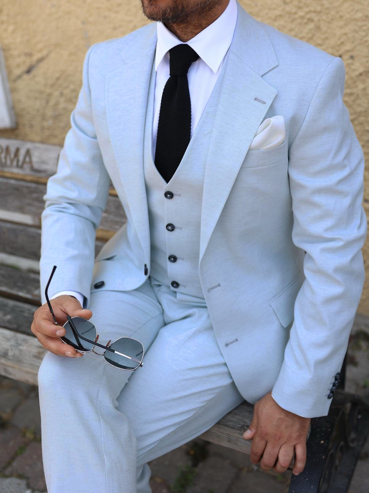 A stone herringbone three piece suit is a formal attire consisting of a jacket, pants, and waistcoat (also known as a vest) in a colour scheme that combines ice blue and a herringbone pattern. . The three pieces of the suit can be worn together for a formal occasion or dressed down with individual pieces paired with other items for a more casual look. The ice blue colour of the suit is warm and rich, while the herringbone pattern adds a touch of interest and personality to the outfit. Ice blue is a versatile color that can be paired with a variety of shirt and tie combinations for a sophisticated and stylish appearance.