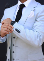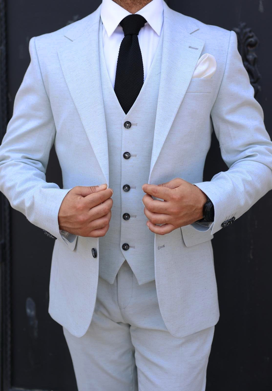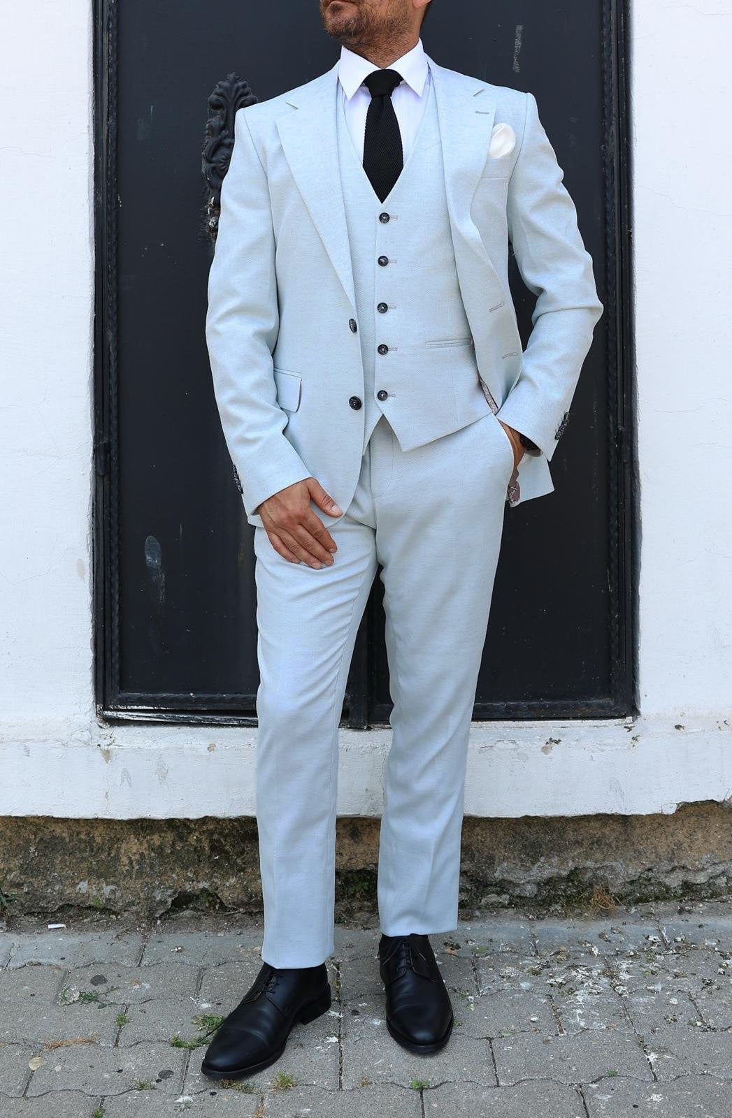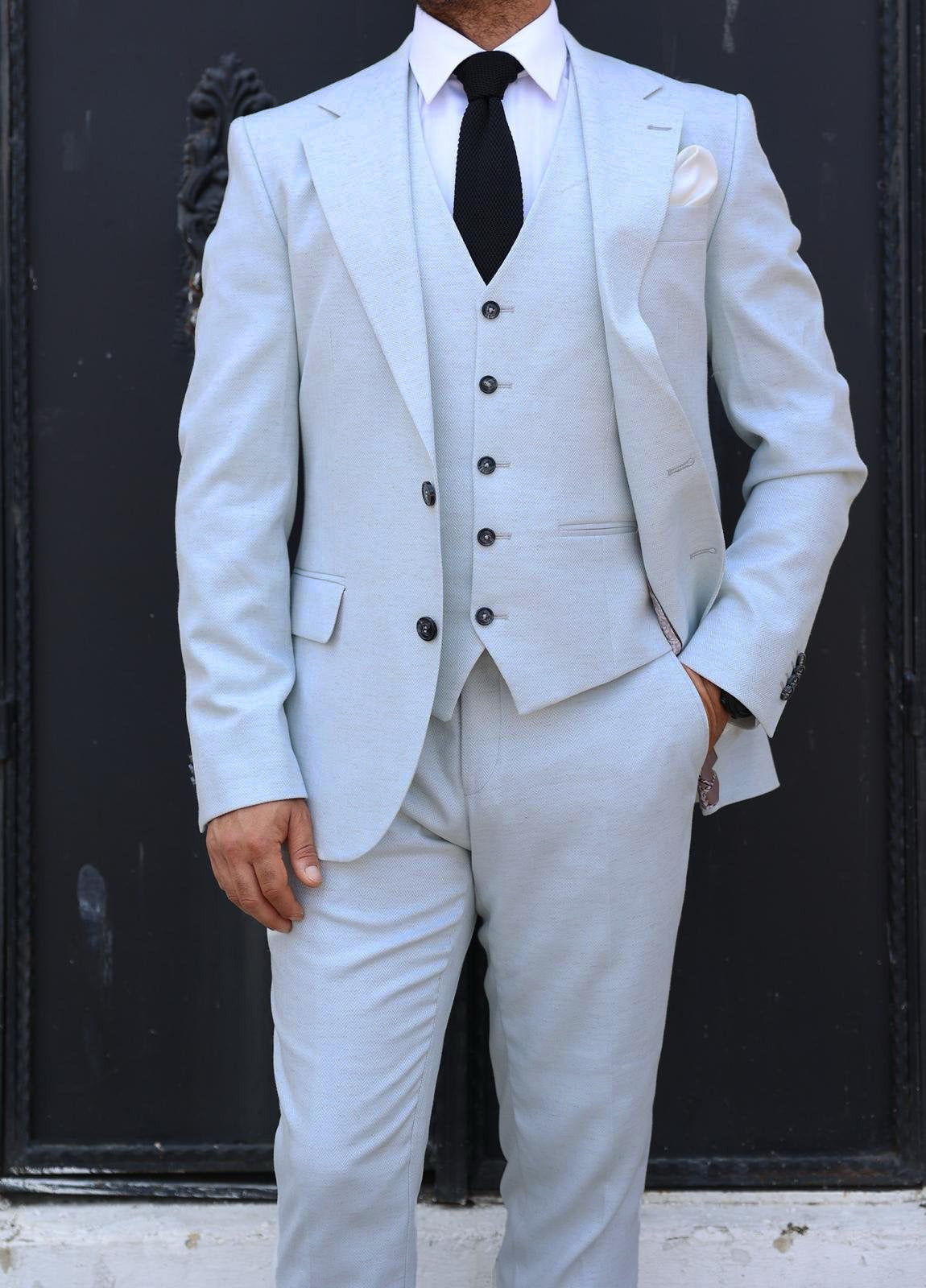 Slim fit ice blue stone herringbone men’s three piece suit with notch lapels