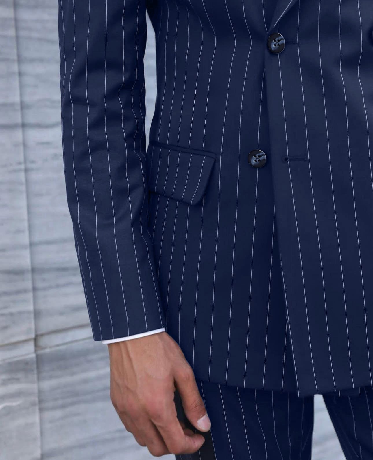 A double-breasted suit with peak lapels is a timeless classic, and this steel blue pinstripe version is no exception. The tailored slim fit creates a sharp, modern silhouette that is sure to impress in any formal setting.