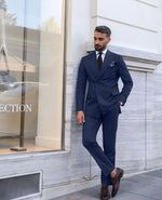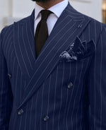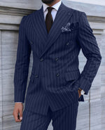 Tailored slim fit pinstripe steel blue double breasted men’s suit with peak lapels