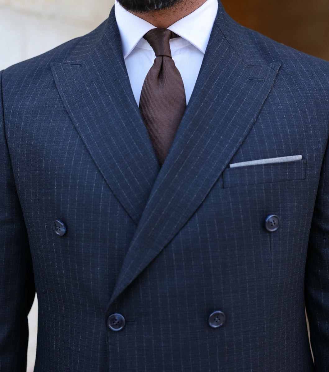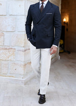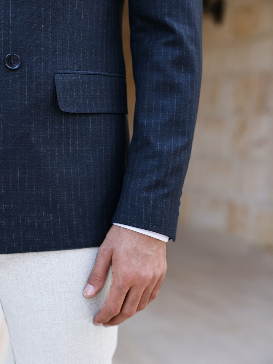 Slim fit double breasted dark blue pinstriped with white trousers men’s suit with peak lapels