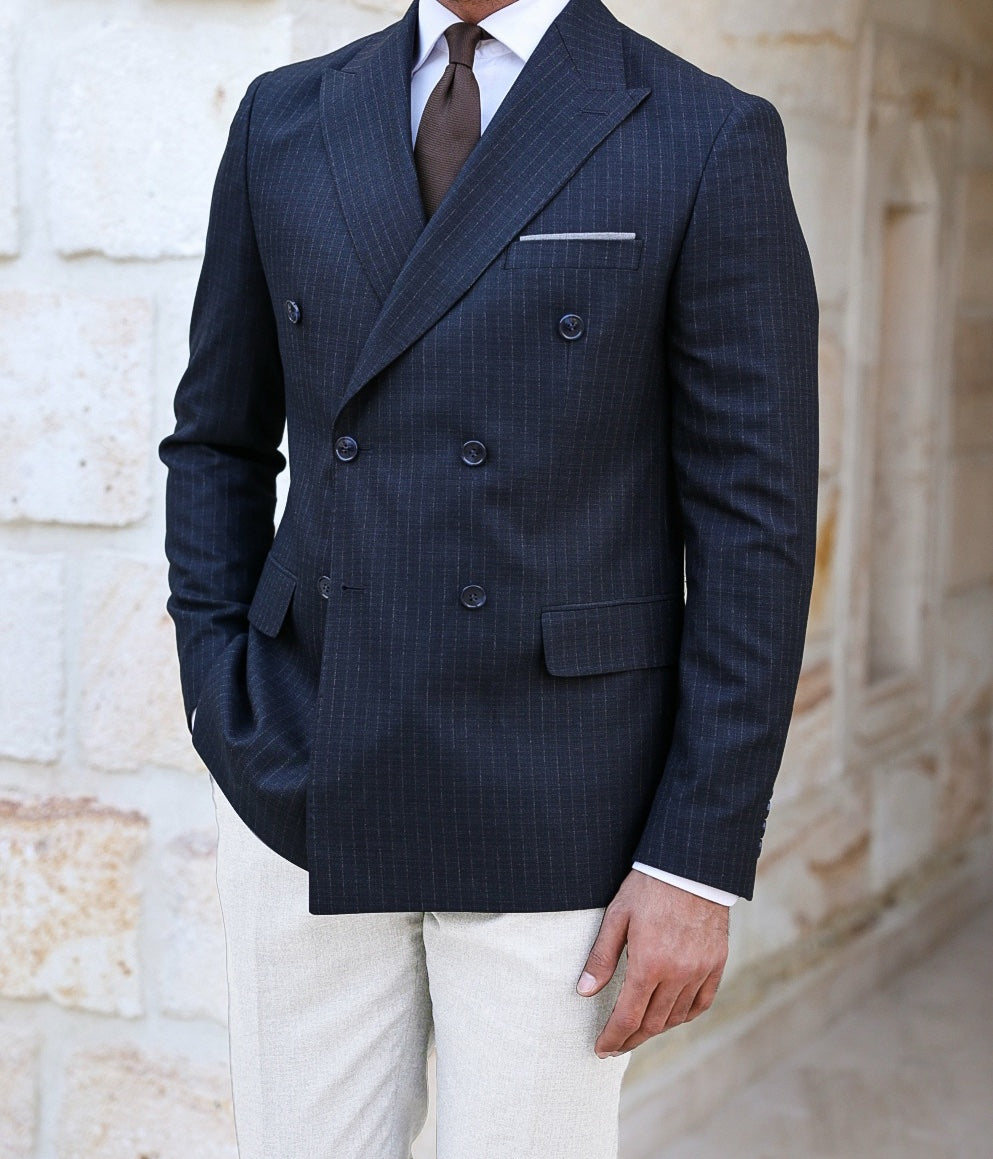 A dark blue pinstriped double breasted blazer paired with white trousers can create a stylish and sophisticated look for formal or business attire. The double breasted style of the blazer, with its overlapping front flaps and two rows of buttons, adds a touch of formality and elegance to the outfit. The pinstripes give the blazer a classic and timeless look, while the white trousers provide a sleek and polished finish. You can choose to wear a white dress shirt and a dark tie for a more formal look, or opt for a light-coloured shirt and a patterned tie for a more casual occasion. This combination of a dark blue pinstriped double breasted blazer and white trousers is versatile and can be dressed up or down depending on the occasion.