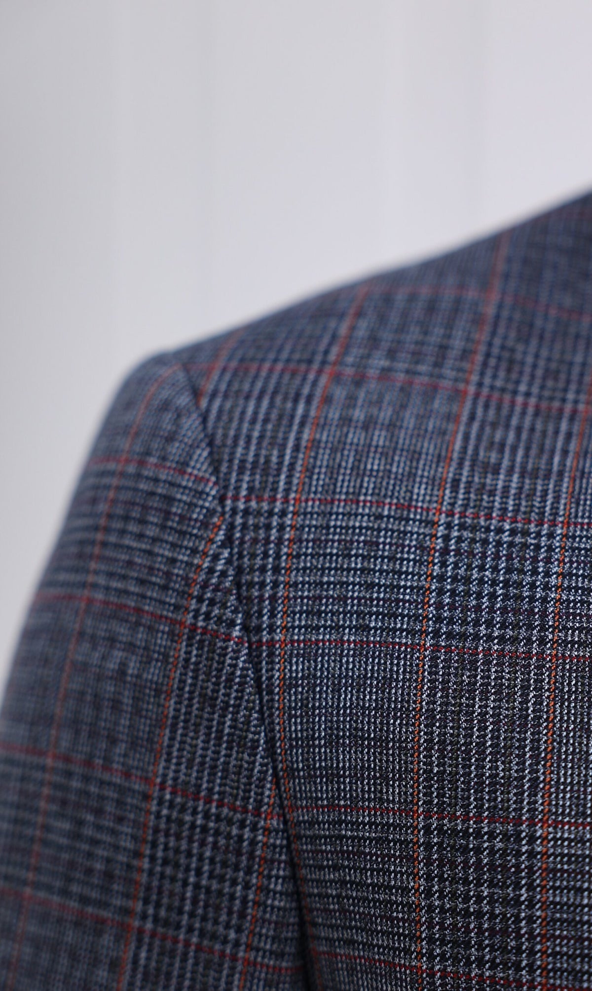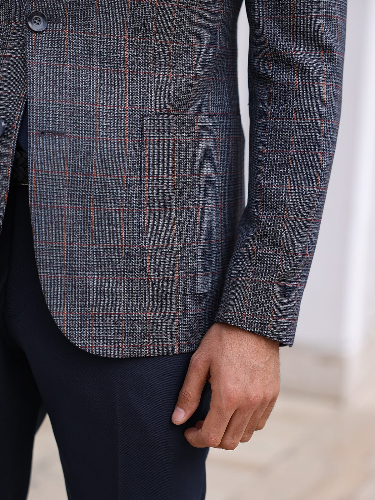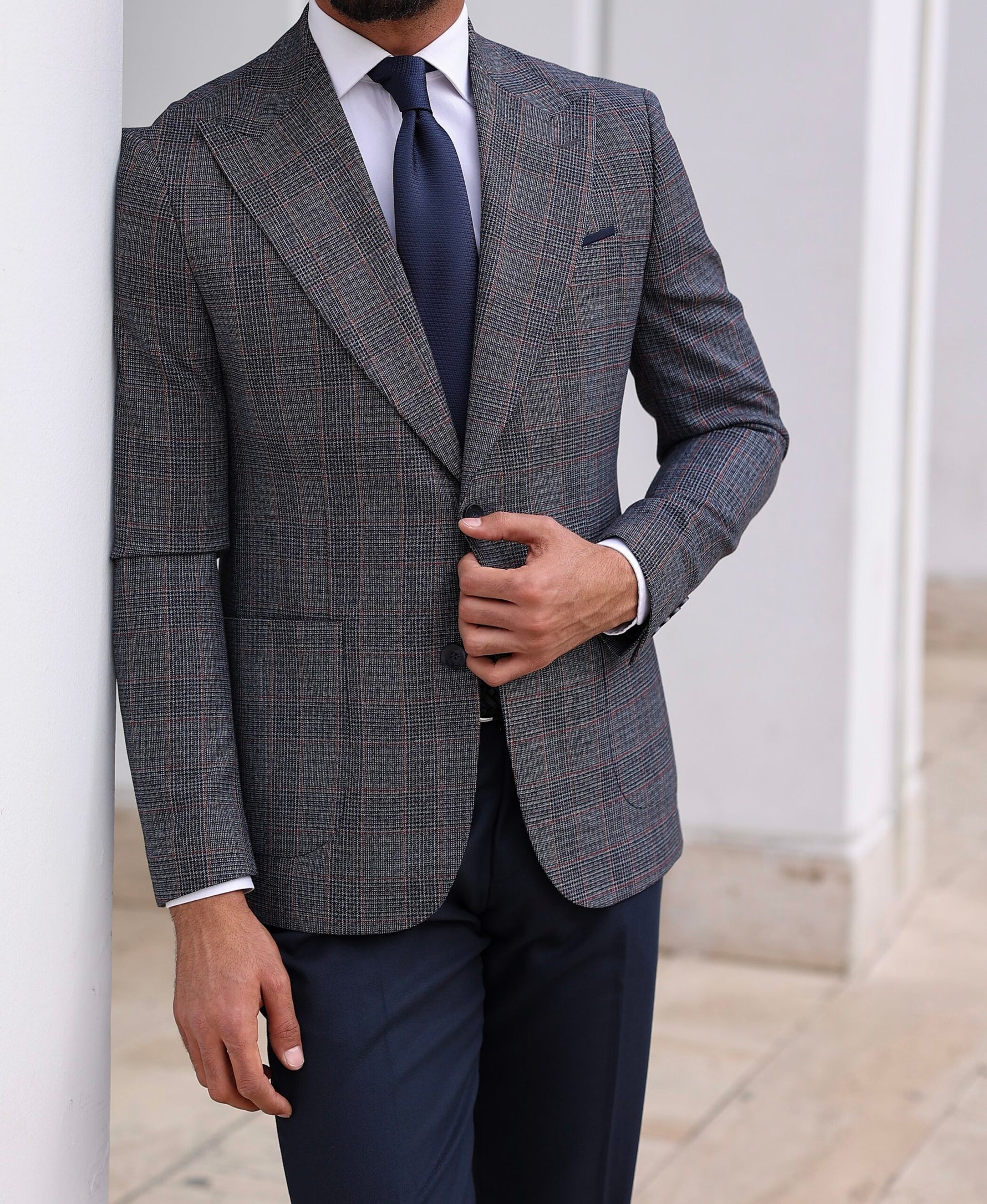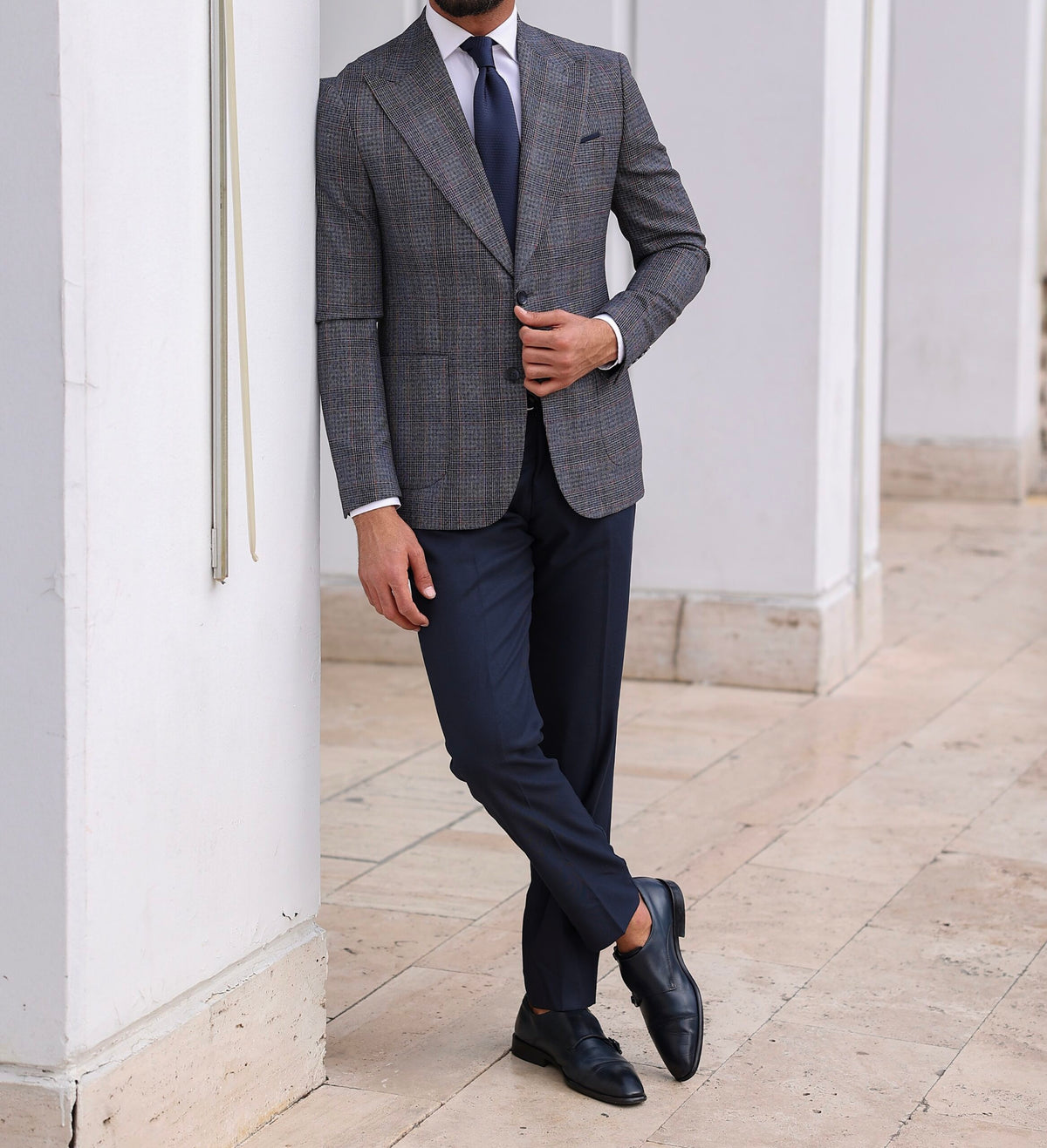 A navy checked blazer paired with navy trousers can make for a stylish and cohesive outfit. The navy colour palette creates a unified look that is both classic and chic. This combination can work well for both formal and casual occasions, depending on the specific style of the blazer and trousers and how they are accessorized.