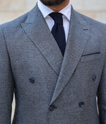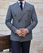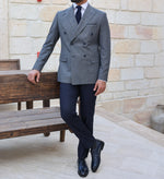 tailored slim fit blue and grey checked with blue trousers mixed double breasted men’s suit with peak lapels