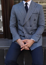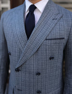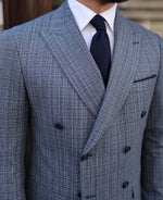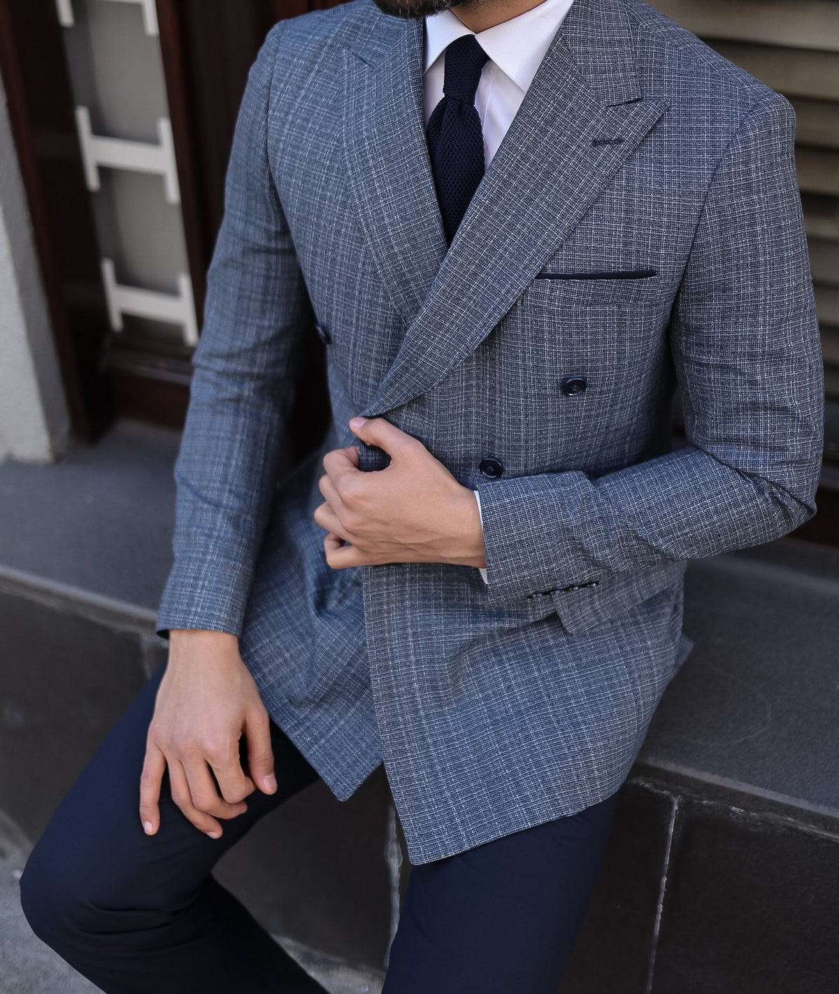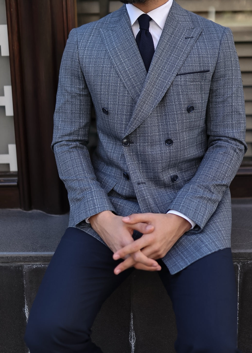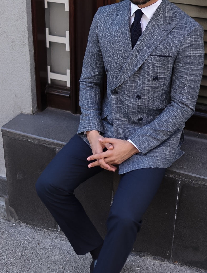 A navy blue checked double breasted blazer with plain navy trousers is a stylish and sophisticated outfit that is perfect for a variety of occasions. The navy blue colour is a deep, muted shade that is both classic and contemporary, and pairs well with a variety of other colours.