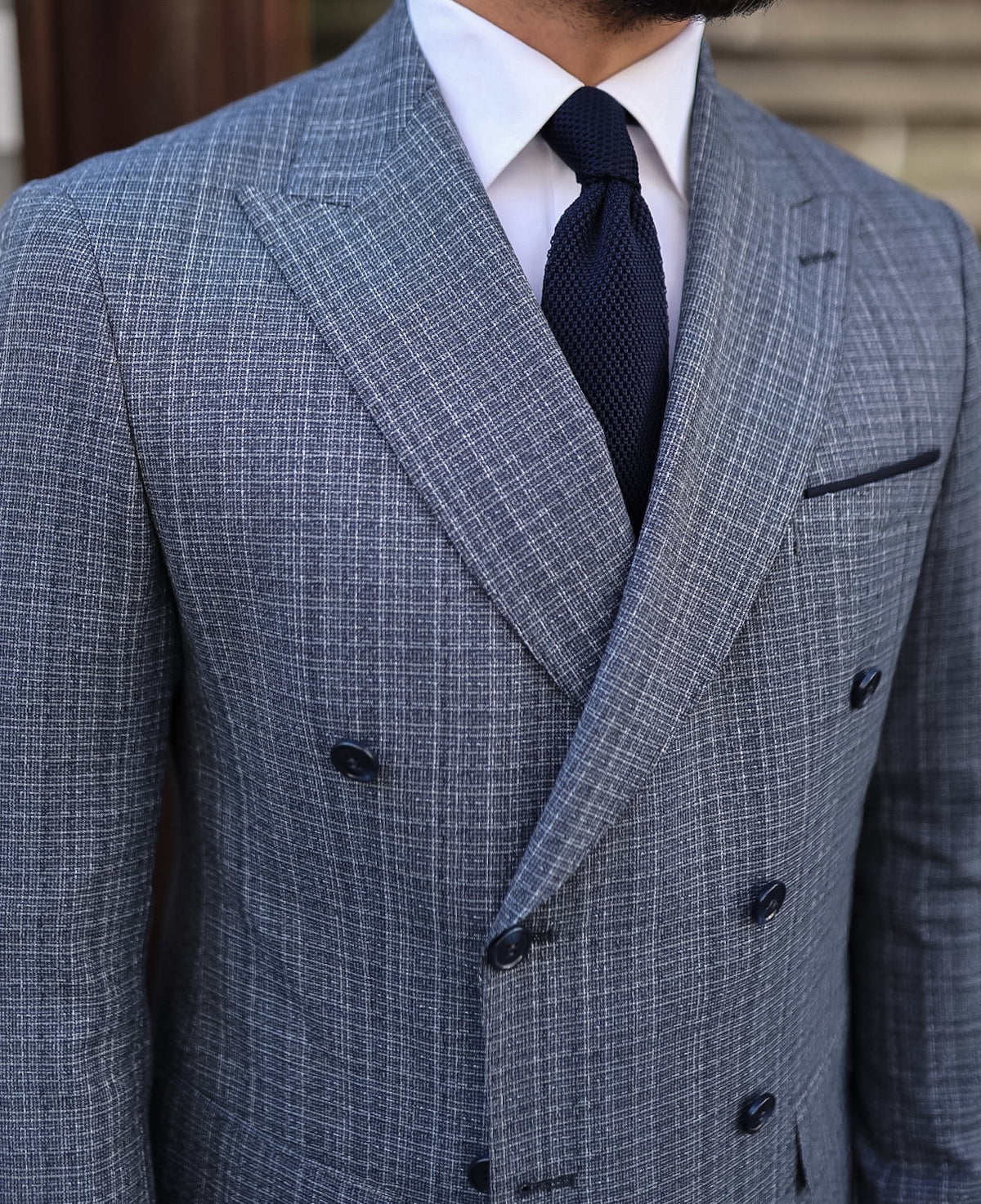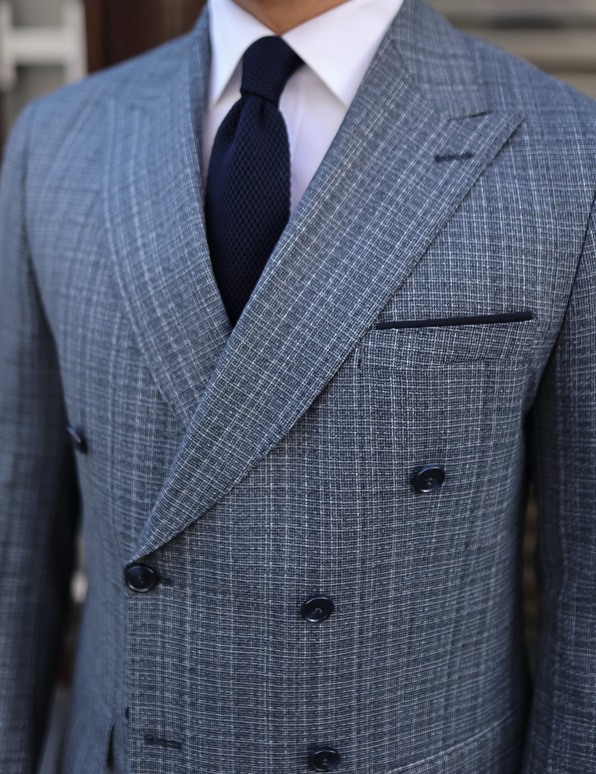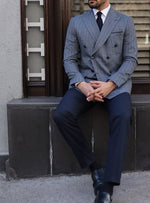 Slim fit navy paired with navy trousers mixed double breasted men’s suit with peak lapels