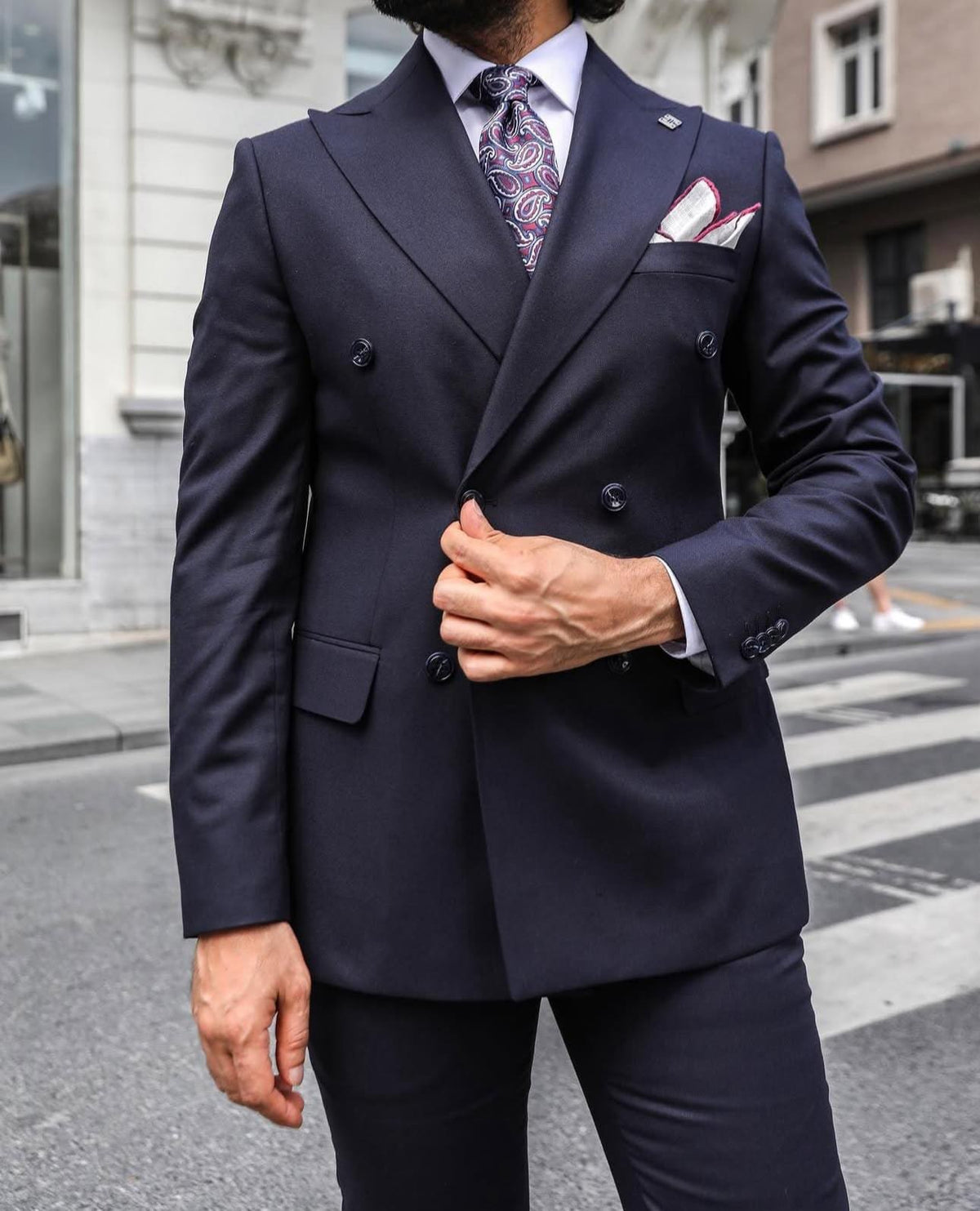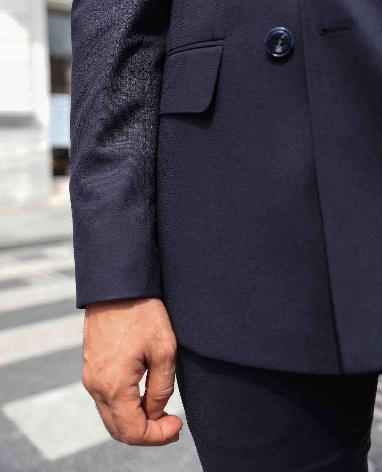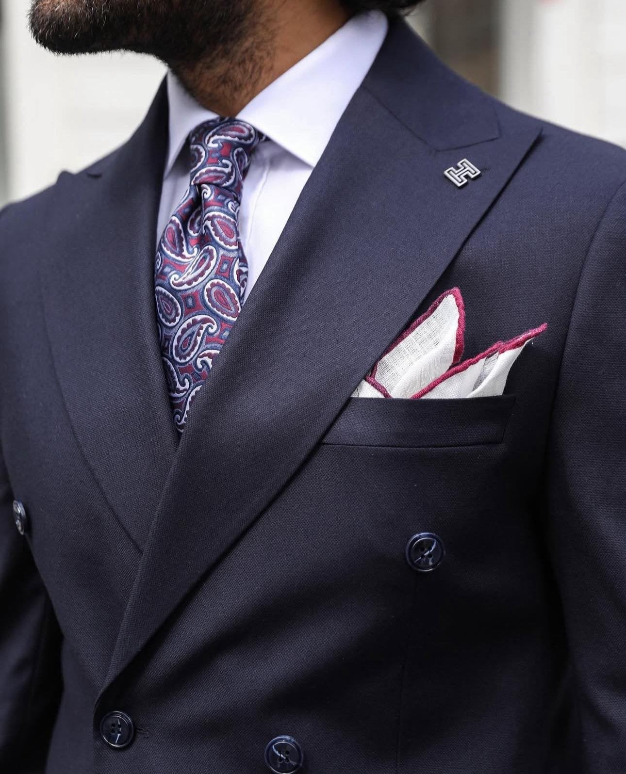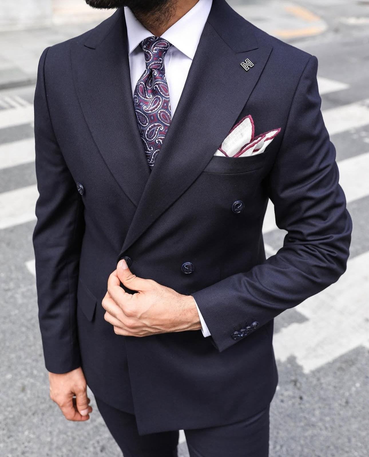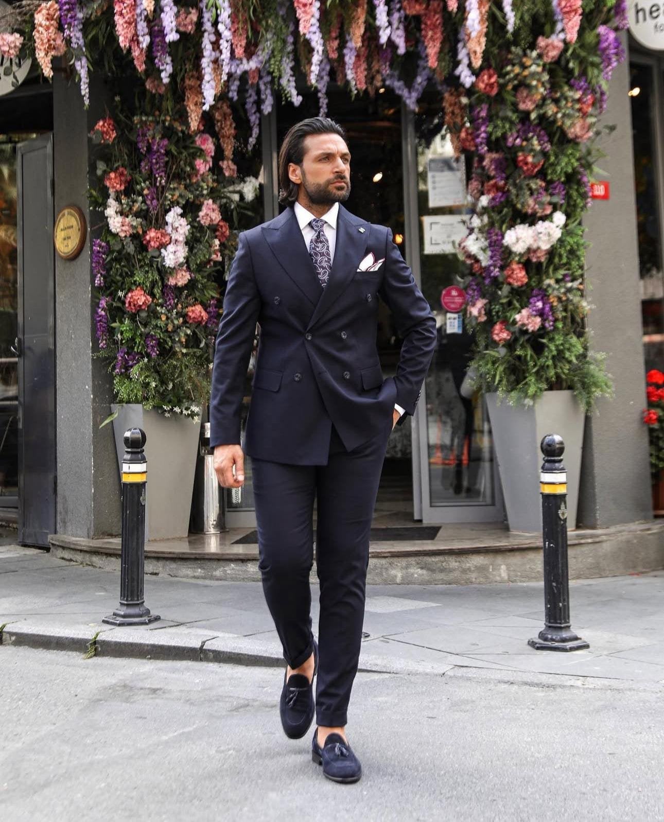 A tailored slim fit dark blue double-breasted men’s suit with peak lapels is a timeless and stylish choice for formal events or business settings. The dark blue colour offers a classic and versatile look, while the double-breasted design and peak lapels add a touch of traditional elegance. Pair it with a white dress shirt, a patterned tie, and black dress shoes for a sophisticated finish. It’s important to ensure that the suit fits perfectly for a sharp and polished appearance.