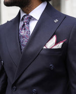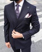 Tailored slim fit dark blue double breasted men’s suit with peak lapels
