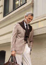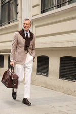 A latte brown checked blazer paired with white trousers is a classic and stylish combination for any occasion. The latte brown checked blazer adds a touch of texture and pattern to the outfit, while the white trousers provide a sleek and sophisticated base. This combination is perfect for both casual and formal occasions, and can be dressed up or down with the right accessories and shoes.