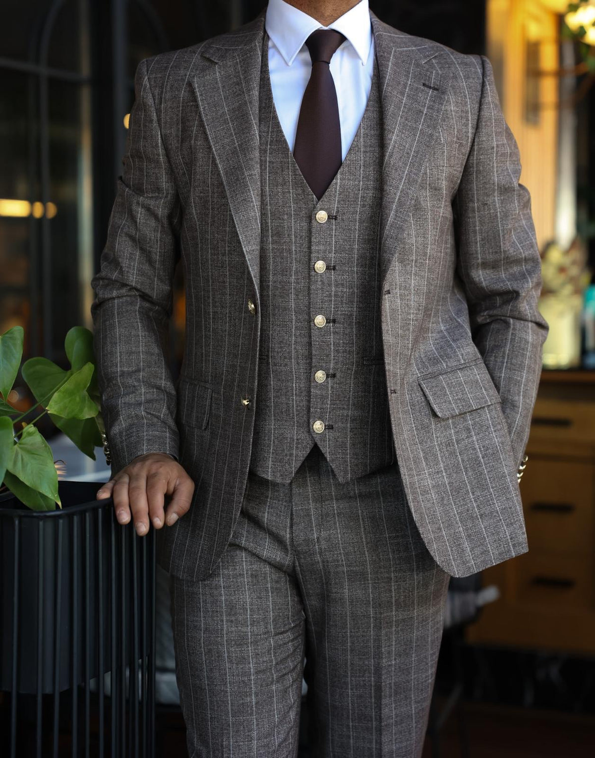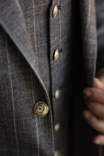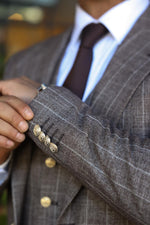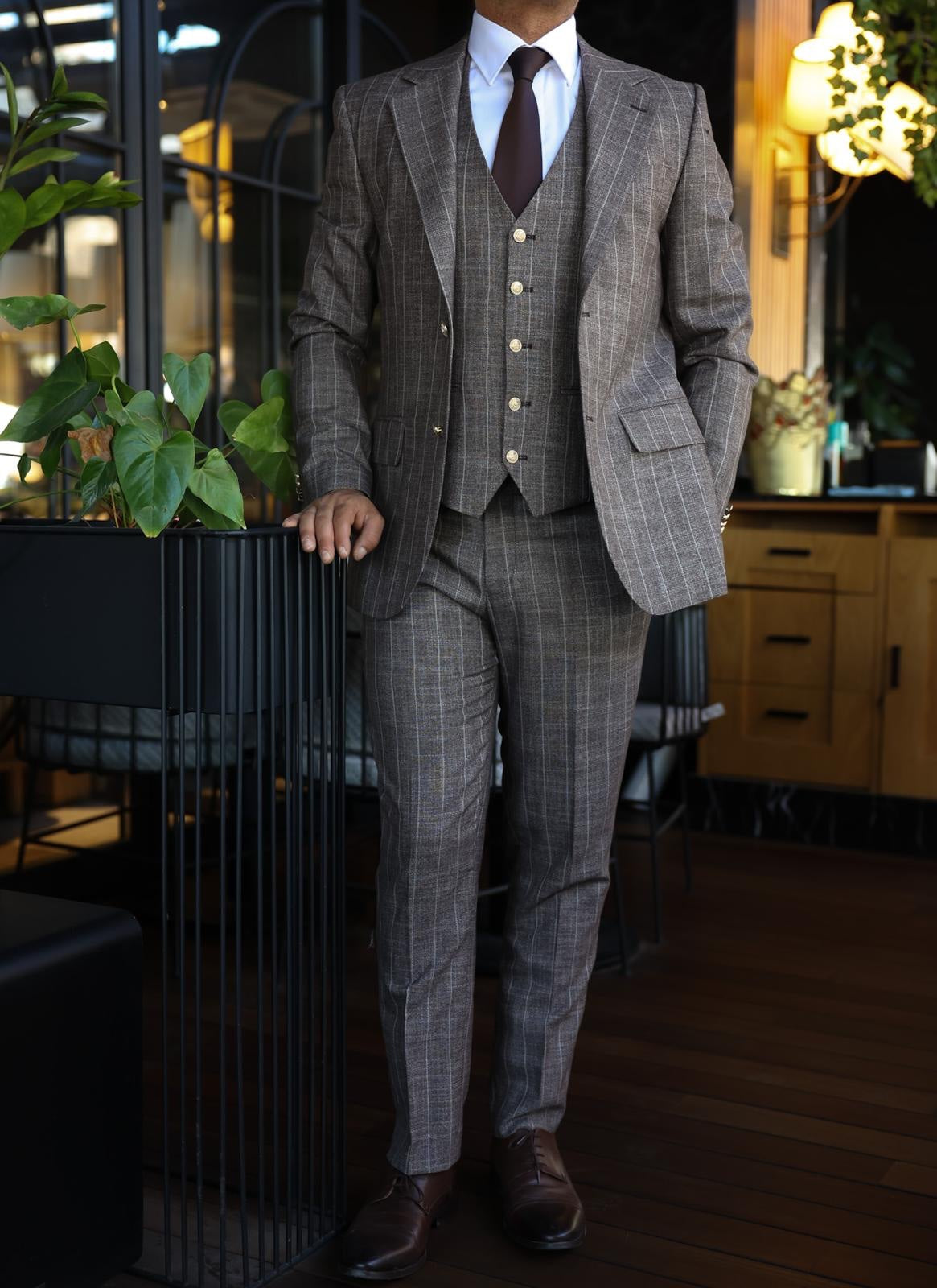 The tailored slim fit latte brown three piece pinstriped men’s suit exudes refined sophistication. The latte brown colour adds a touch of elegance and versatility to the suit, making it suitable for various occasions. The pinstriped design and peak lapels elevate the overall aesthetic, creating a sleek and stylish look. Adornedwith decorative silver buttons, the suit exuded opulence and style. This suit is a perfect choice for those seeking a timeless and polished ensemble that exudes confidence and class.