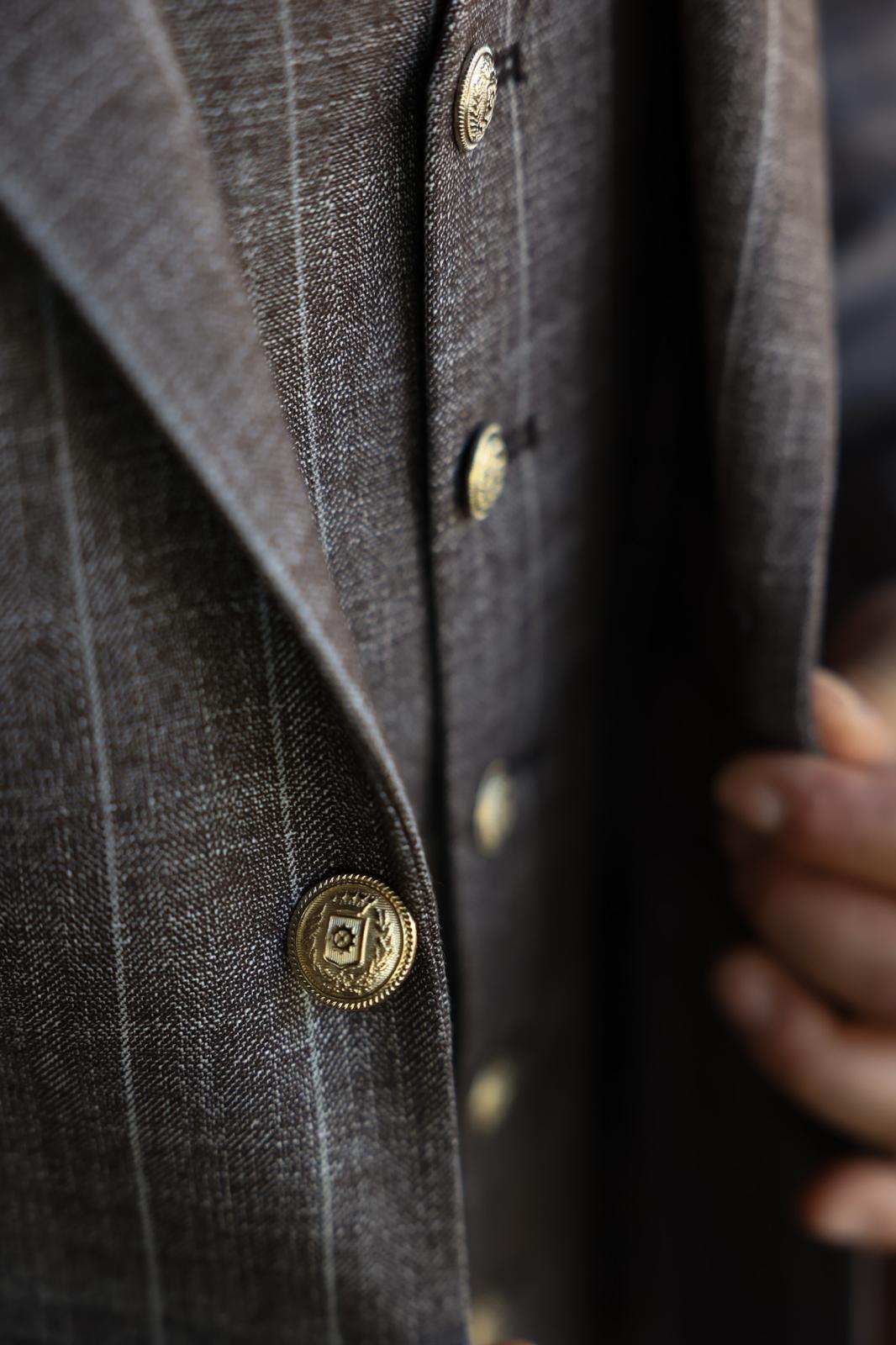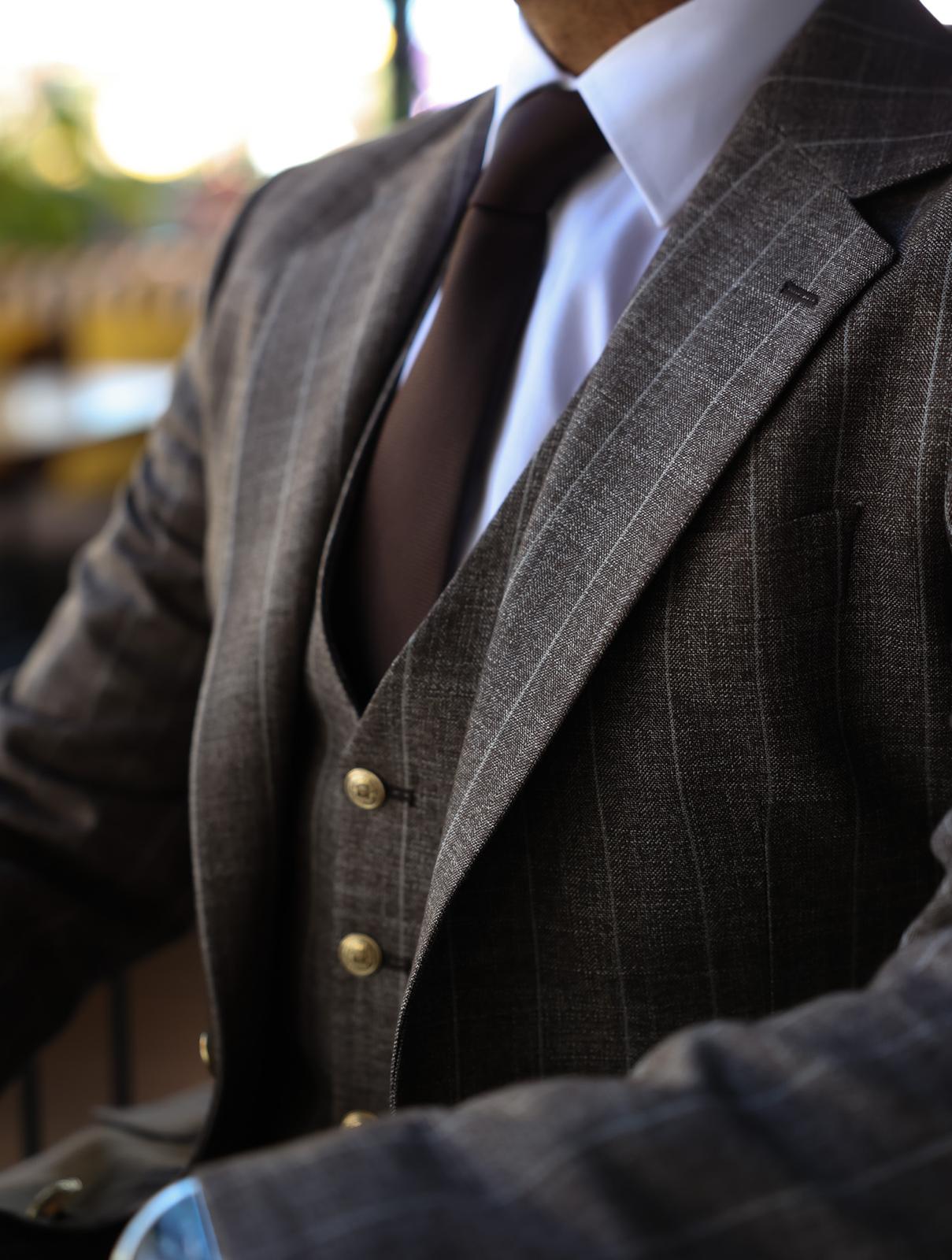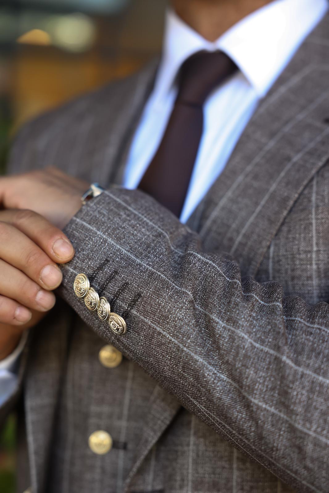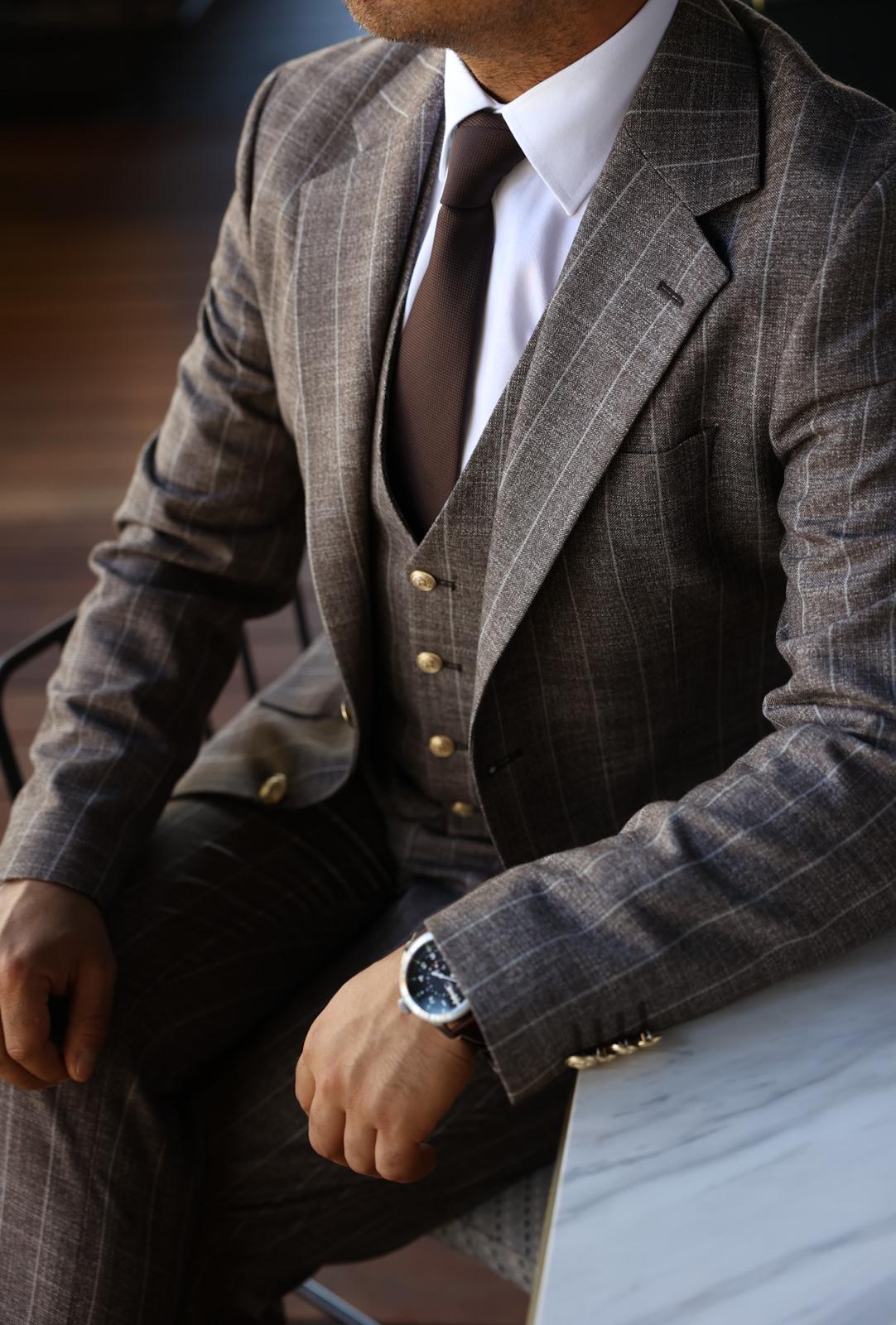 Slim fit latte brown men’s three piece suit with peak lapels and with decorative gold buttons