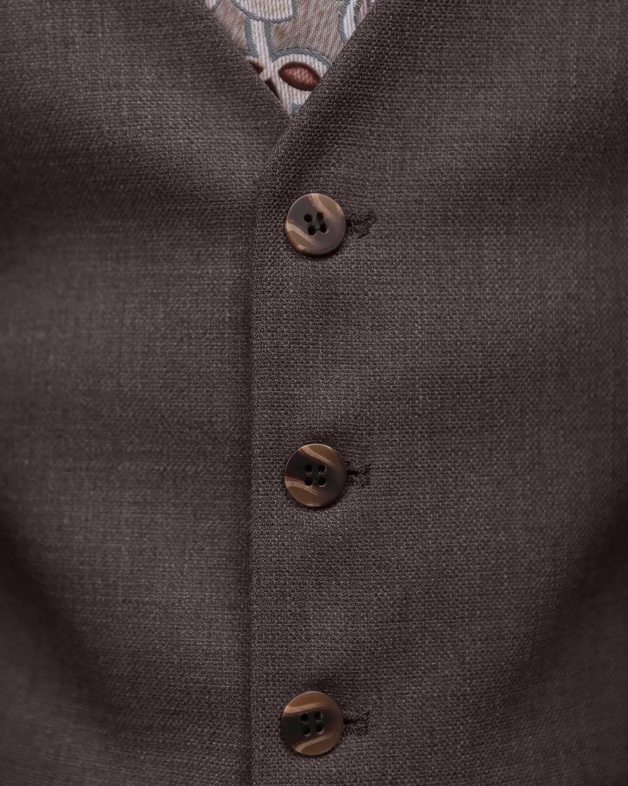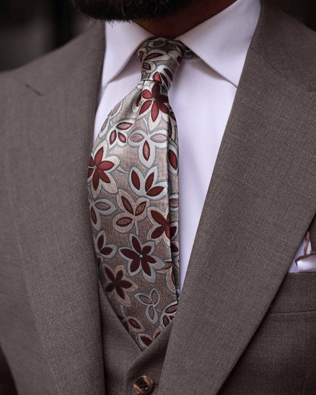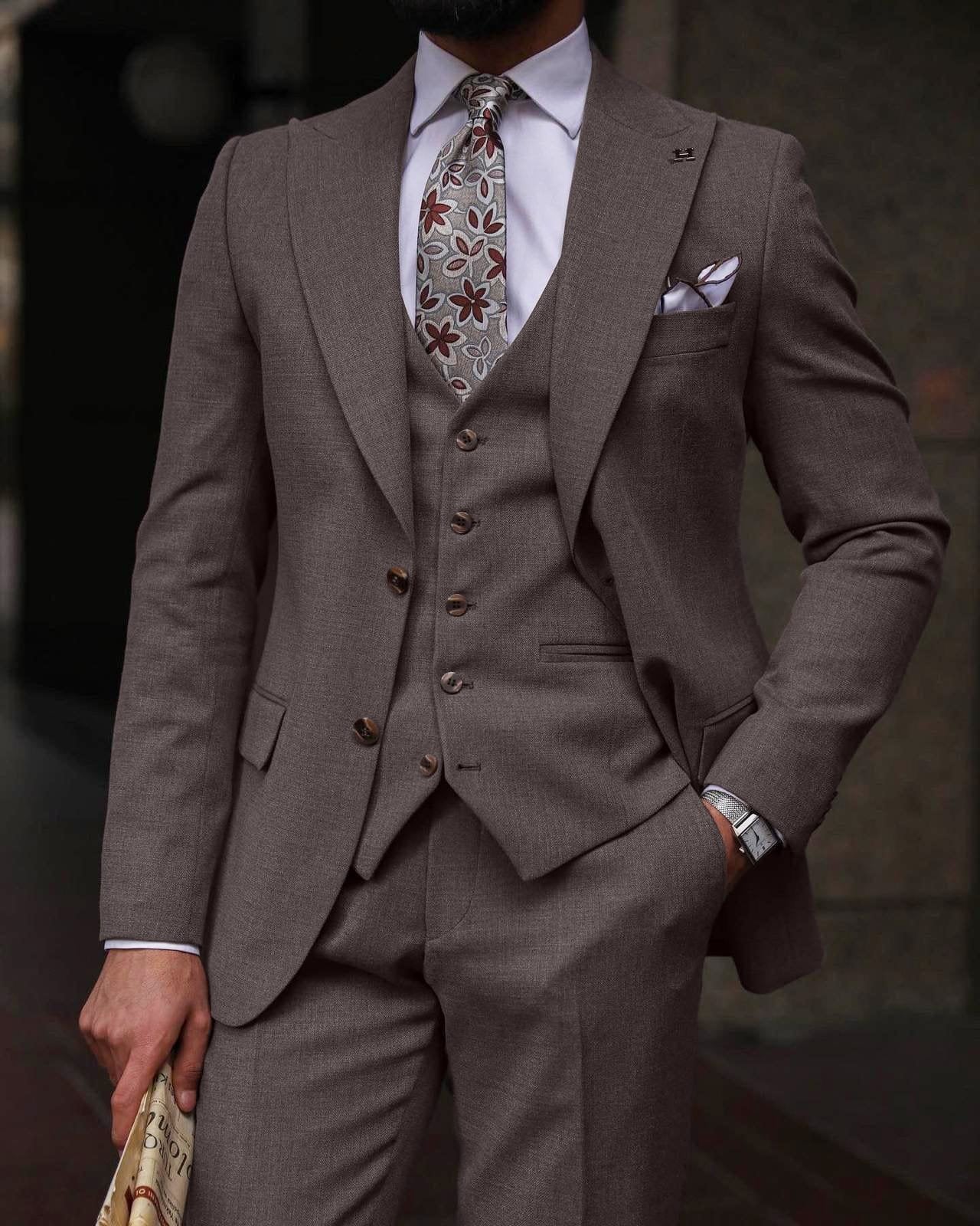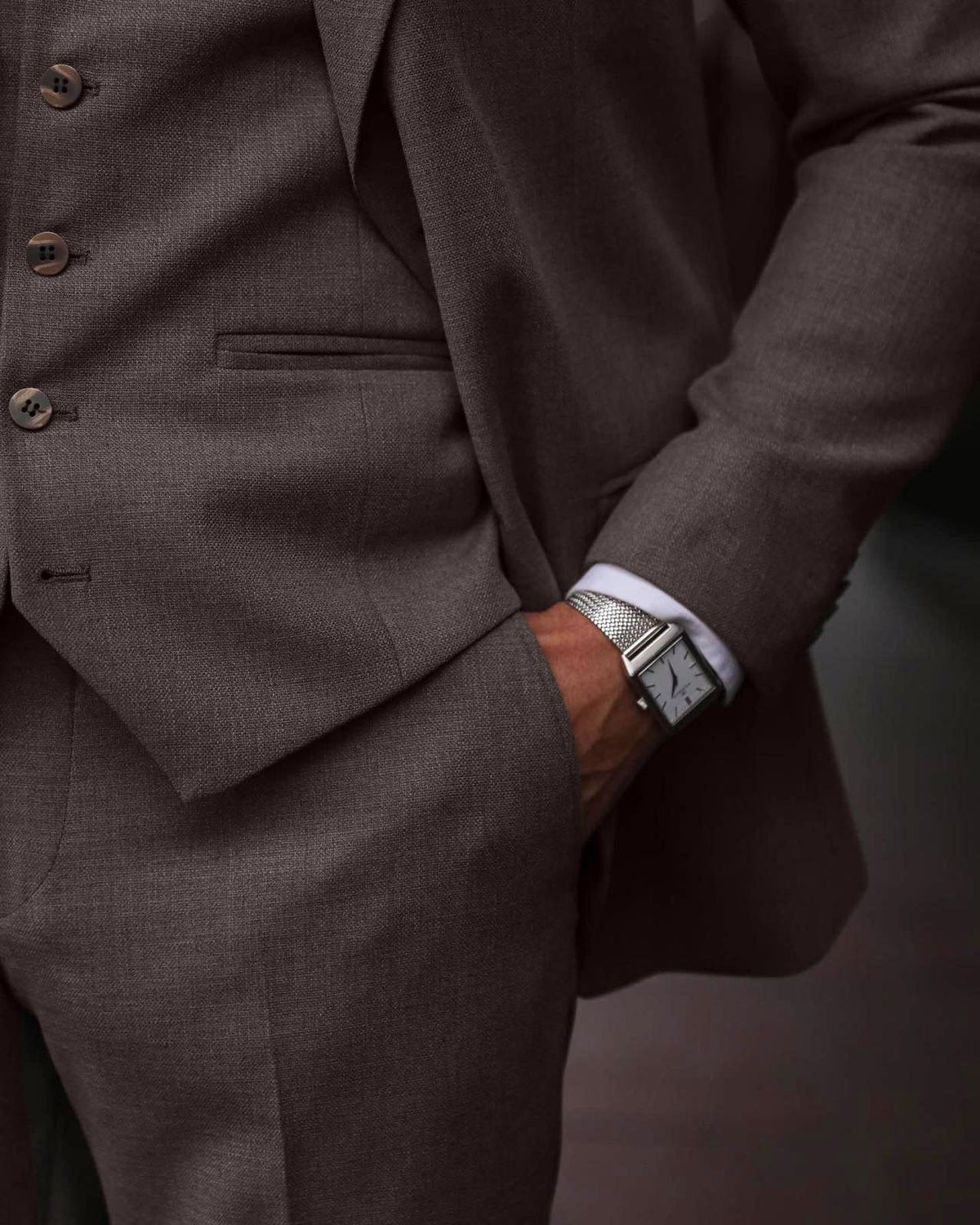 A taupe brick three piece suit is a stylish and sophisticated choice for any formal occasion. The taupe brick colour is warm and versatile, and the three piece style adds a touch of refinement and polish to the suit. A three piece suit consists of a jacket, waistcoat, and trousers, all expertly tailored to create a cohesive and polished look. The jacket is typically single breasted with notch lapels and a two button closure, while the waistcoat features a V-neck and button front. The trousers are tailored with a slim fit and a flat front for a modern silhouette. Whether paired with a crisp white shirt and dress shoes, or dressed down with a casual button-up and sneakers, a taupe brick three piece suit is sure to make a stylish statement.