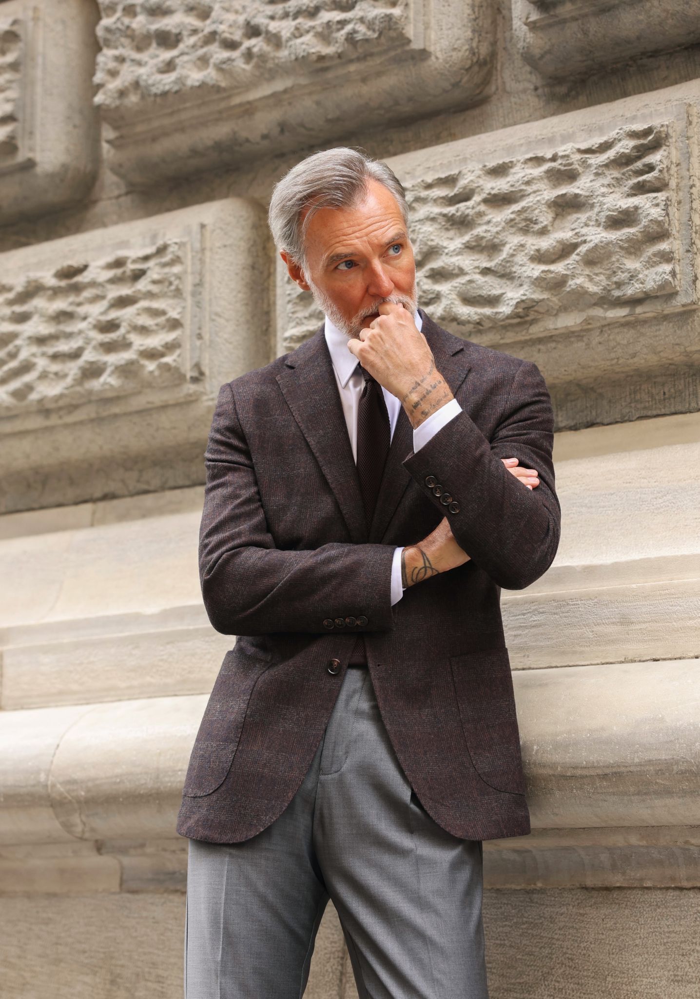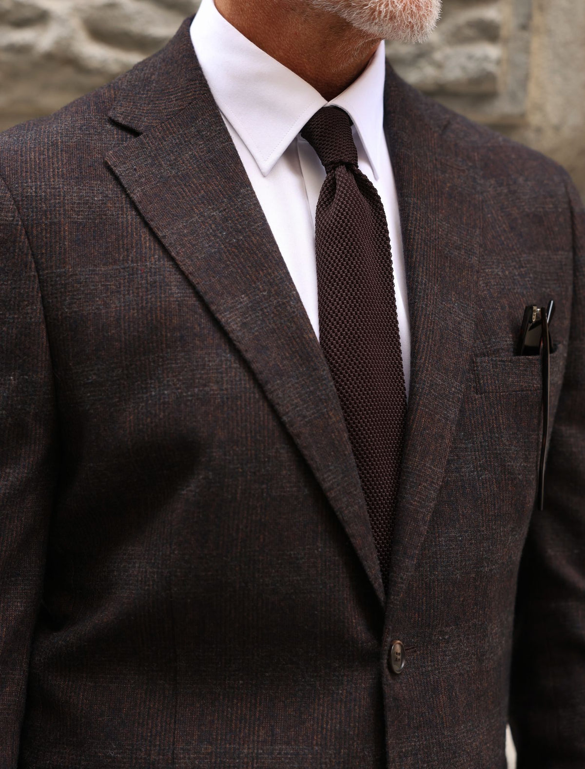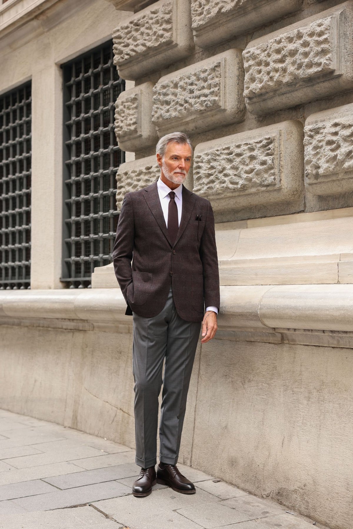 A brown checked blazer paired with grey trousers is a classic and stylish combination for any occasion. The brown checked blazer adds a touch of texture and pattern to the outfit, while the grey trousers provide a sleek and sophisticated base. This combination is perfect for both casual and formal occasions, and can be dressed up or down with the right accessories and shoes.