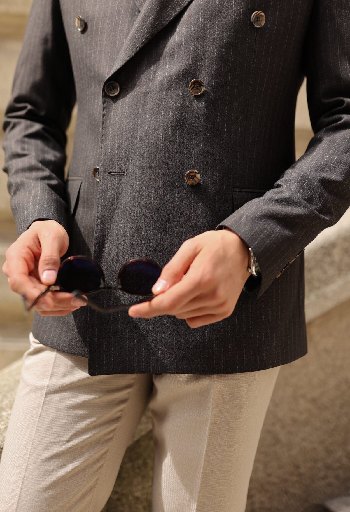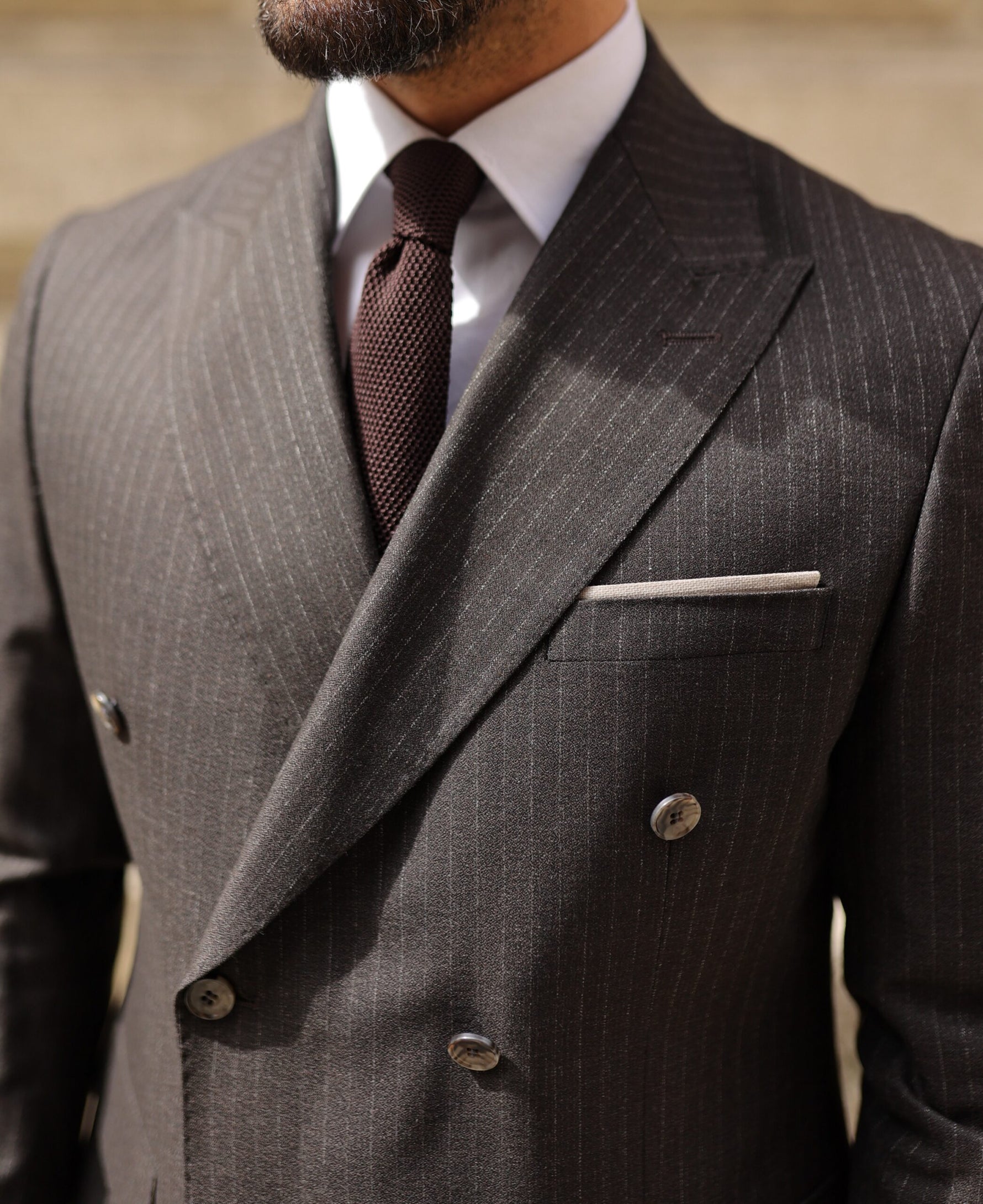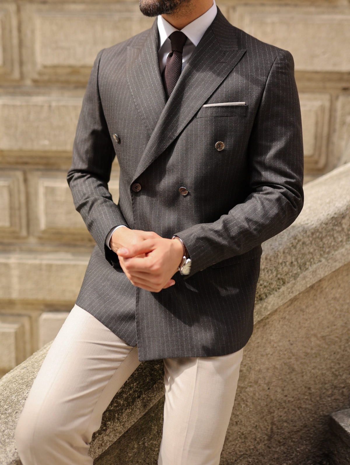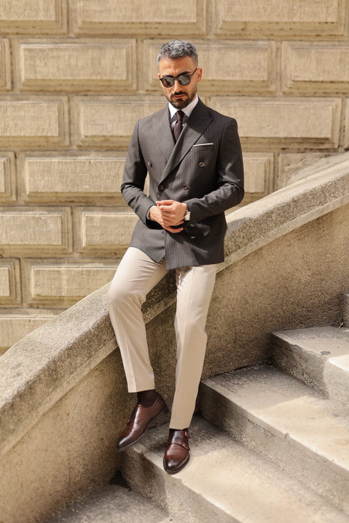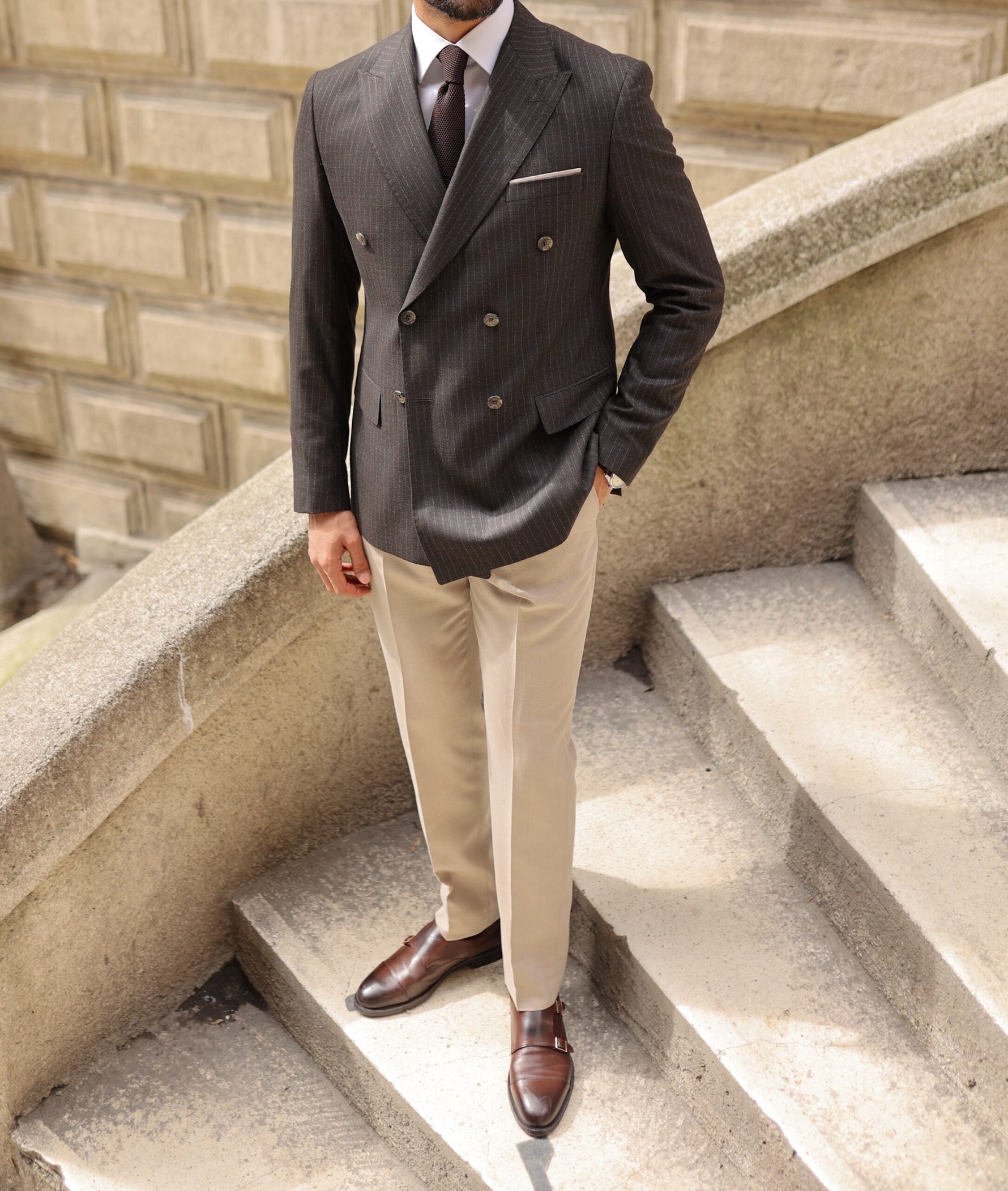 A brown pinstriped double breasted blazer paired with cream trousers can create a stylish and sophisticated look for formal or business attire. The double breasted style of the blazer, with its overlapping front flaps and two rows of buttons, adds a touch of formality and elegance to the outfit. The pinstripes give the blazer a classic and timeless look, while the creamtrousers provide a sleek and polished finish. You can choose to wear a white dress shirt and a dark tie for a more formal look, or opt for a light-coloured shirt and a patterned tie for a more casual occasion. This combination of a brown pinstriped double breasted blazer and cream trousers is versatile and can be dressed up or down depending on the occasion.