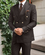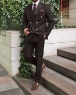 Slim fit dark brown double breasted two piece men’s suit with peak lapels with decorative gold buttons.