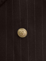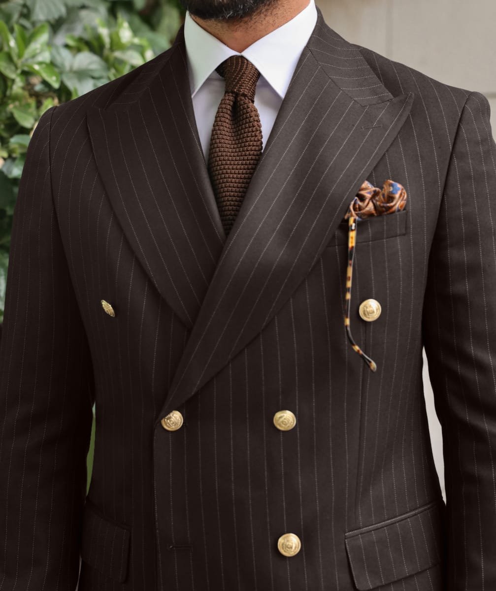 A brown double breasted pinstriped suit can be a stylish and sophisticated choice for formal occasions or business events. The brown colour is a warm, neutral shade that can be paired with a variety of dress shirts and ties. The pinstripes add a classic touch of visual interest to the suit. A double breasted suit has a more formal look, with overlapping front flaps and two rows of buttons. Adorned with decorative gold buttons, the suit exudes opulence and style To complete the look, you could pair the suit with a white dress shirt, a pair of brown dress shoes, and a matching belt. You could also accessorize with a tie in a complementary colour, such as beige or cream. This outfit would be suitable for a variety of formal events, such as a wedding or a business conference.