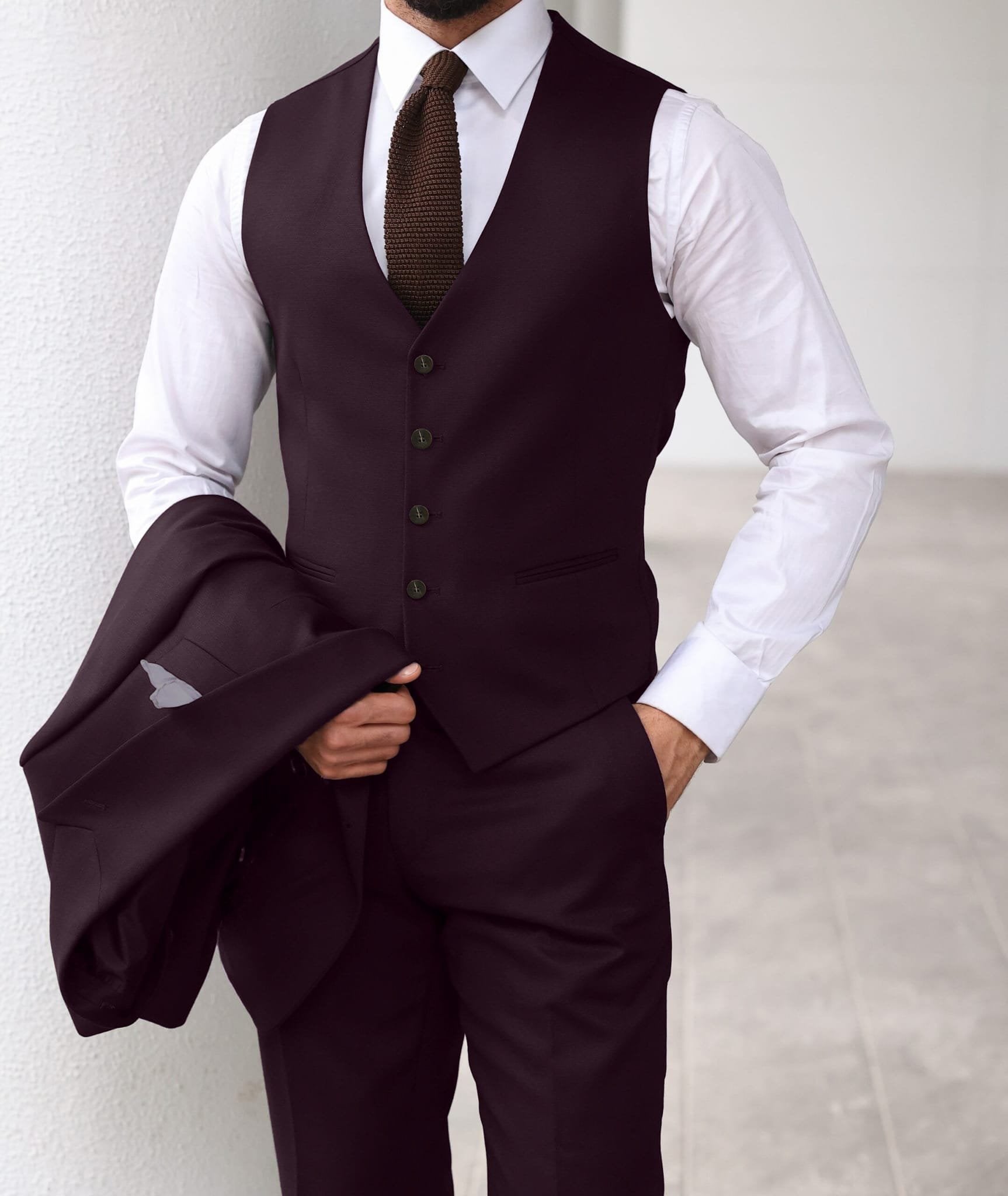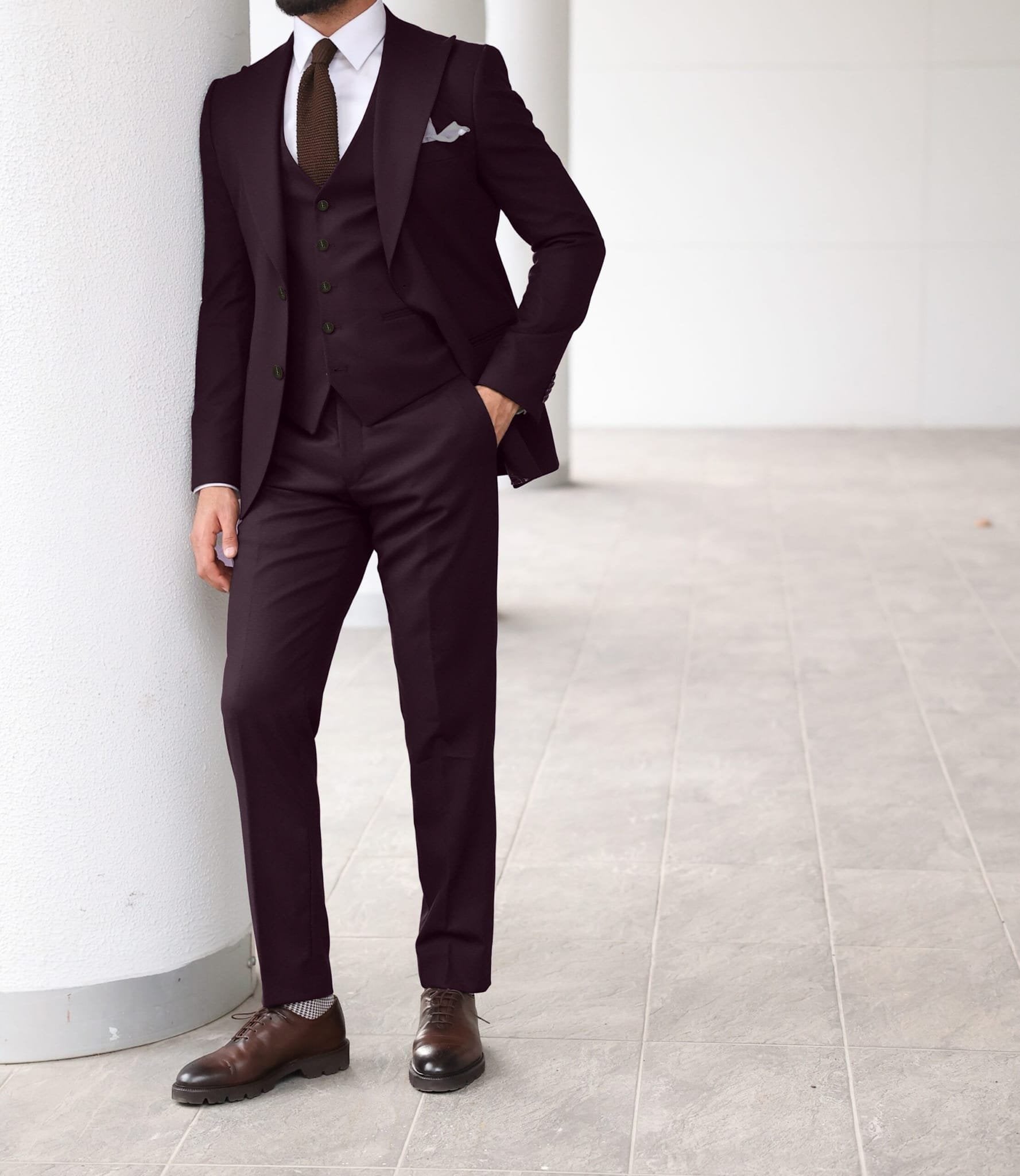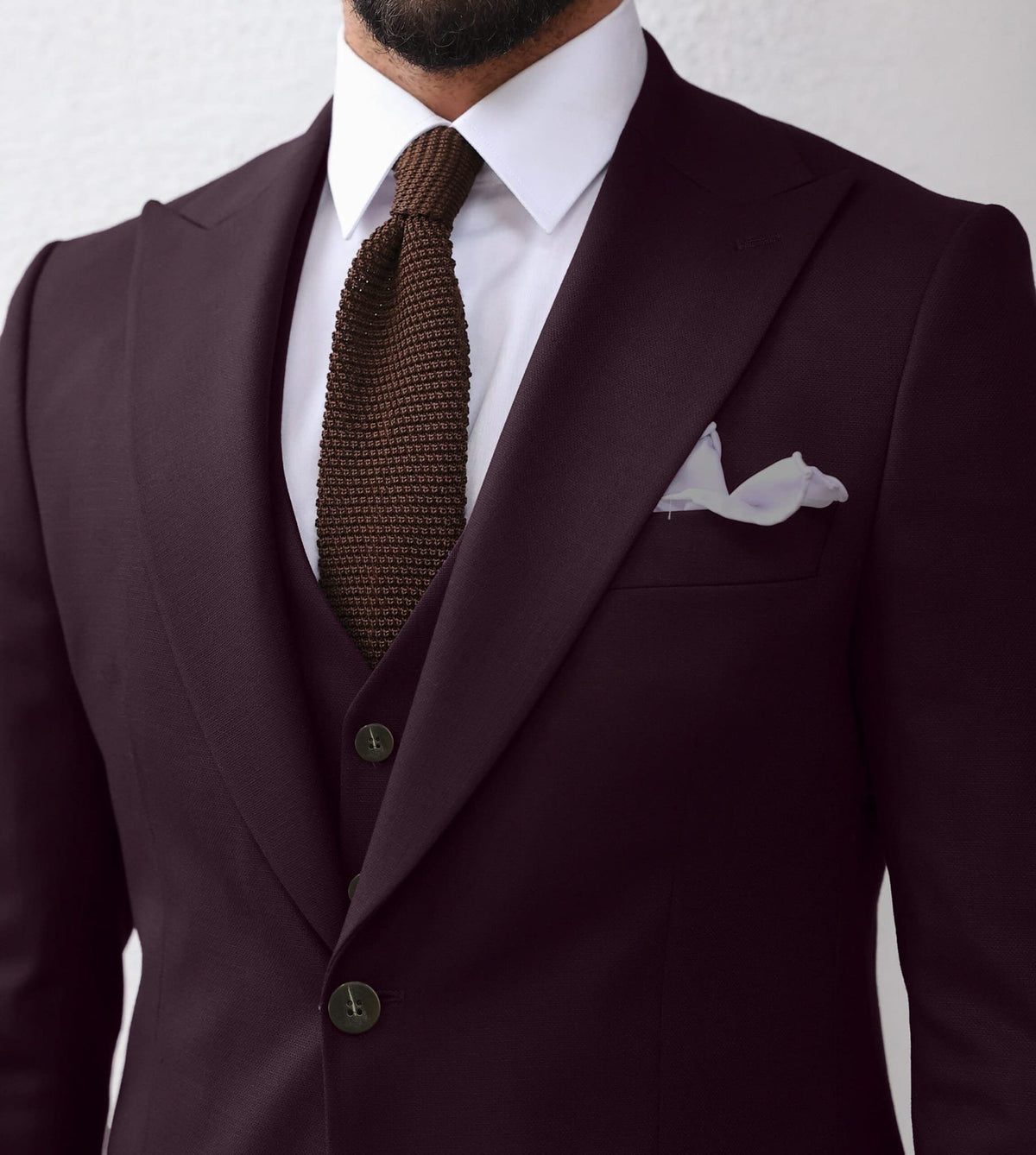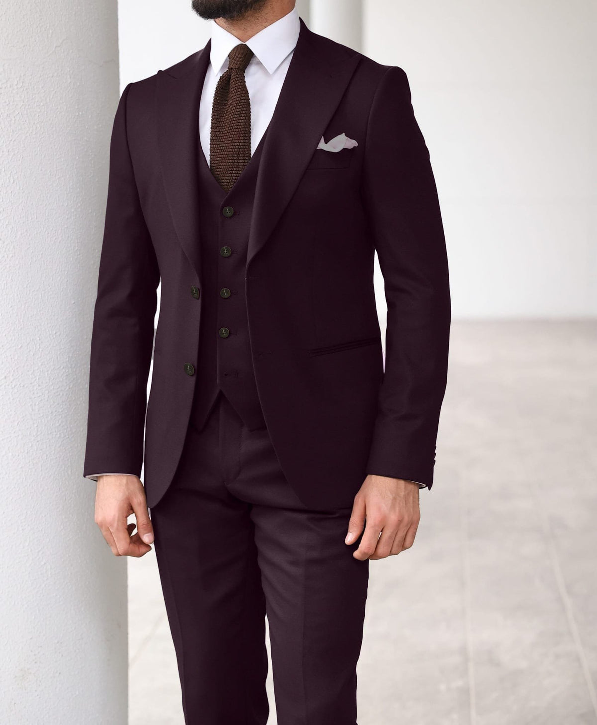 Slim fit burgundy plum men’s three piece suit with peak lapels