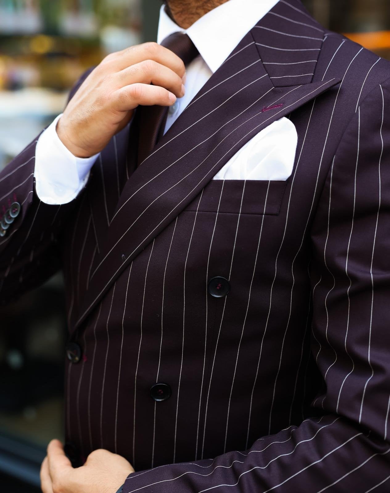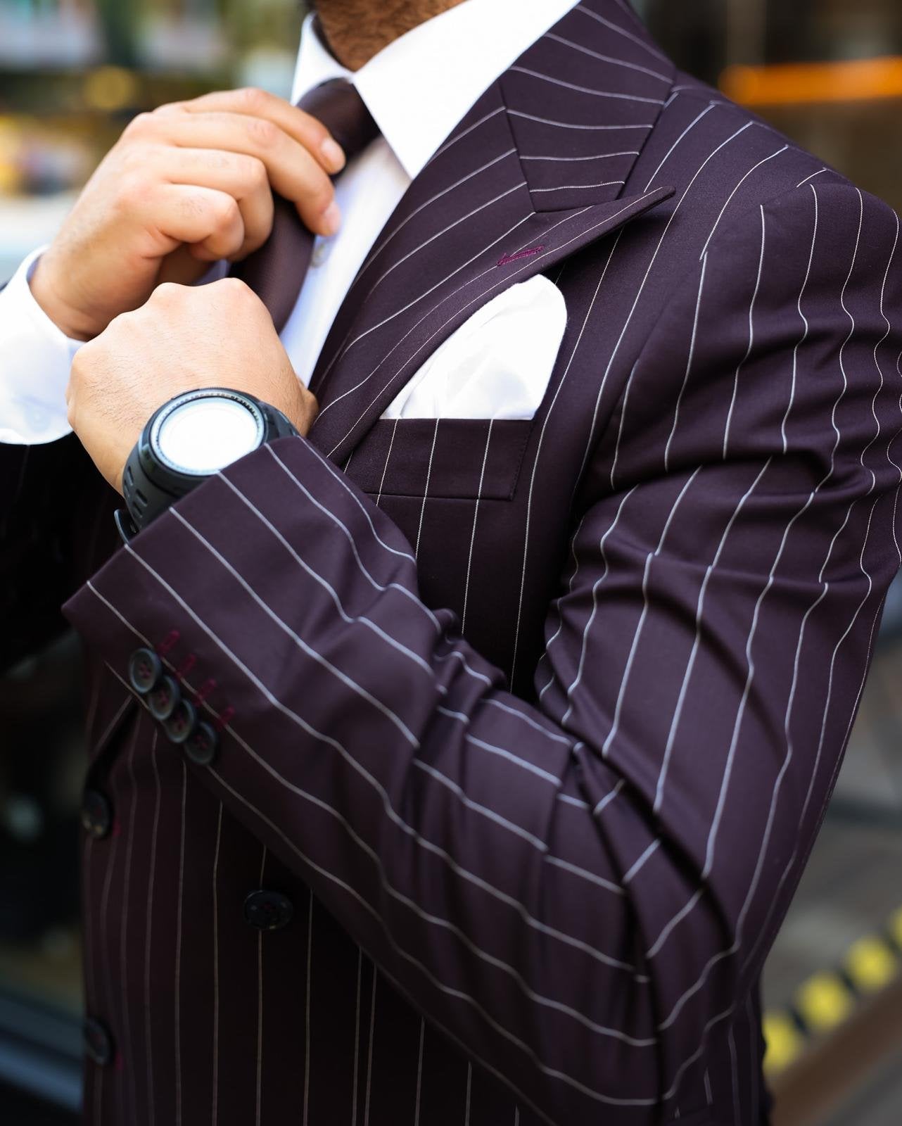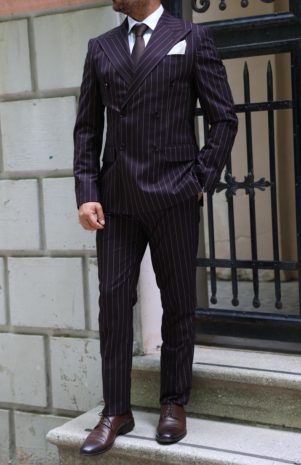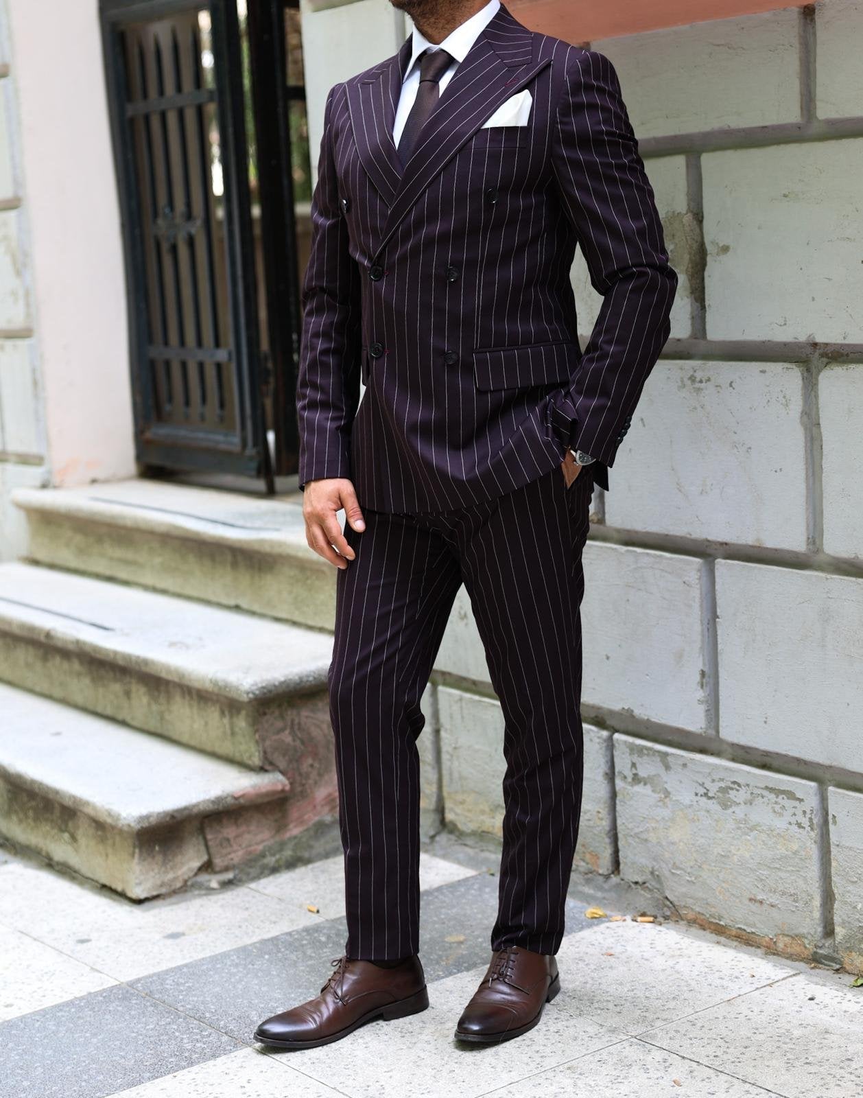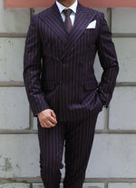 Tailored slim fit burgundy plum double breasted men’s suit with peak lapels