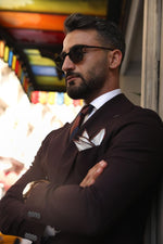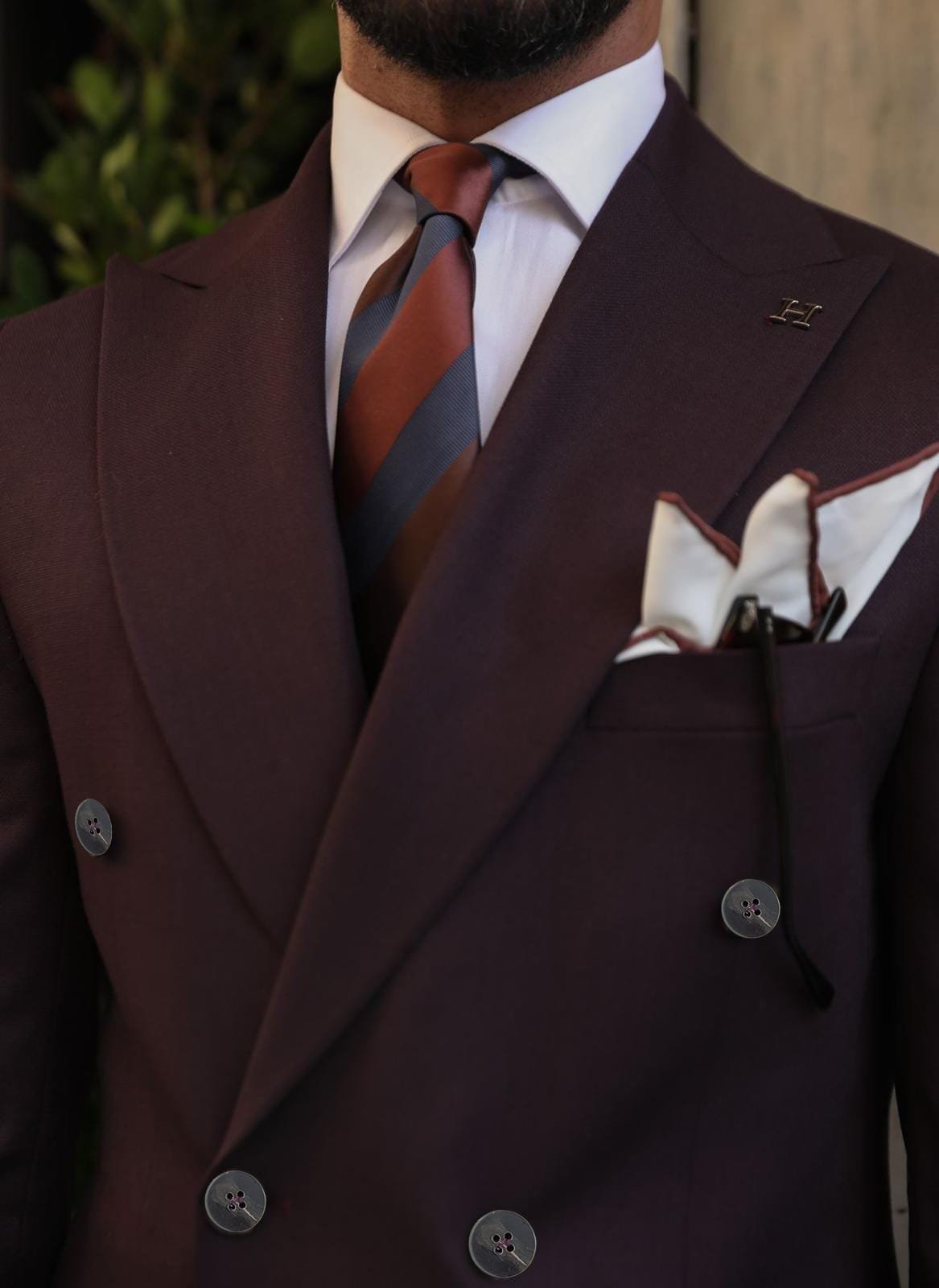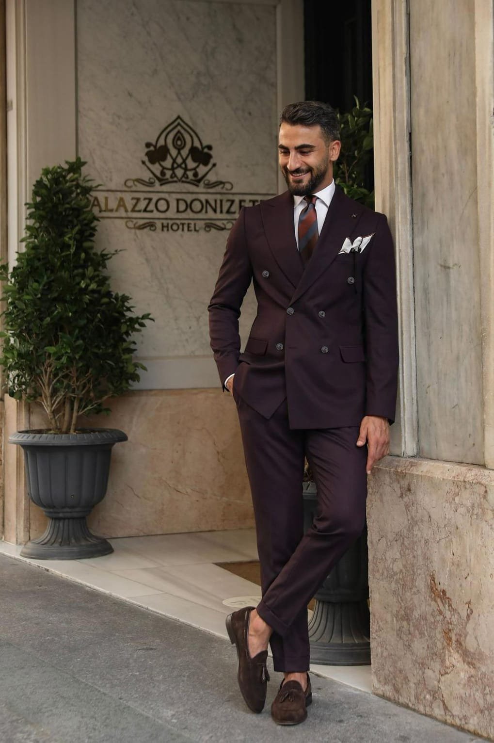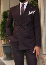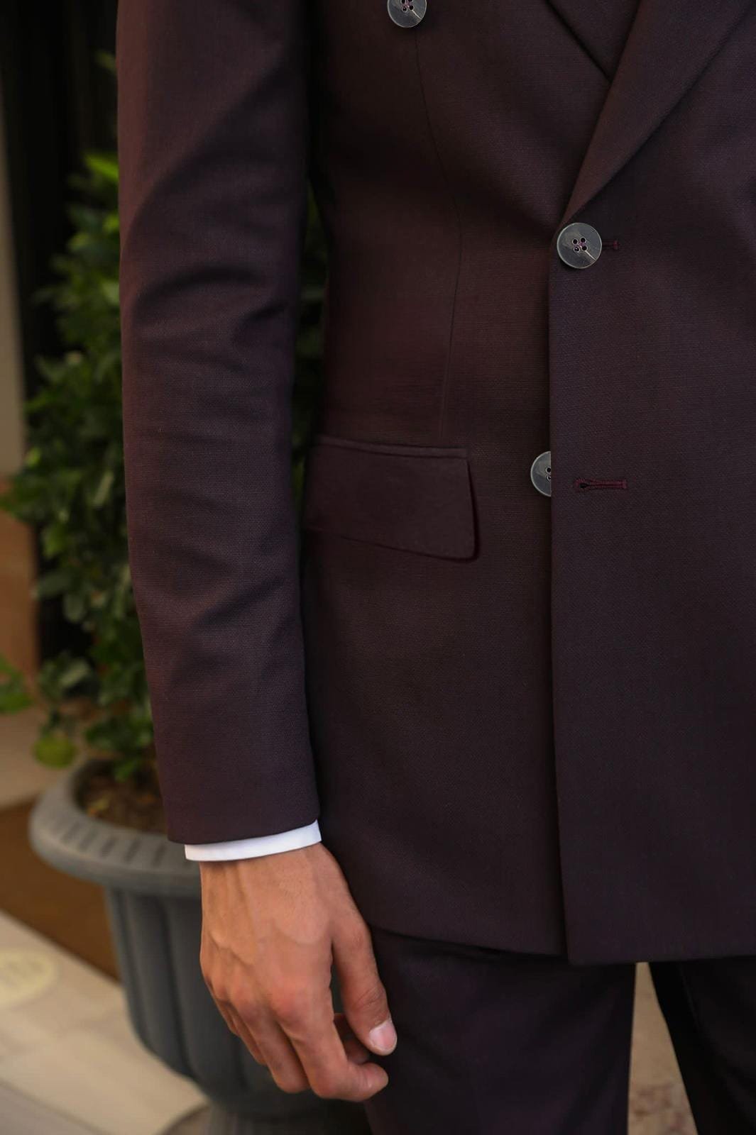 Tailored slim fit burgundy double breasted men’s suit with peak lapels