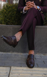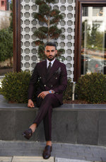 A tailored slim fit royal navy burgundy double breasted men’s suit with decorative gold buttons and shawl lapels is a classic and timeless option for a formal or semi-formal occasion. The deep navy burgundy colour is versatile and sophisticated, while the slim fit cut and double breasted style offer a sleek and modern look. The decorative gold buttons add a touch of luxury and elegance to the suit, making it a standout choice. Paired with a white dress shirt and black leather dress shoes, this suit is sure to impress.