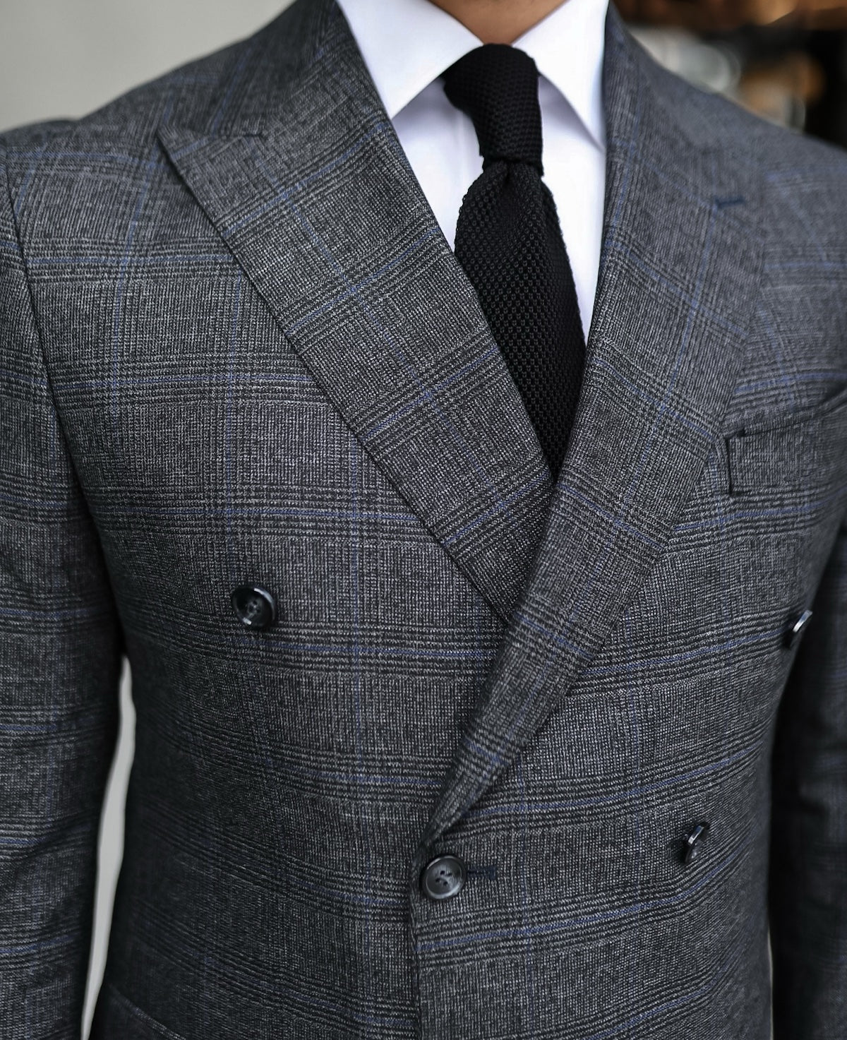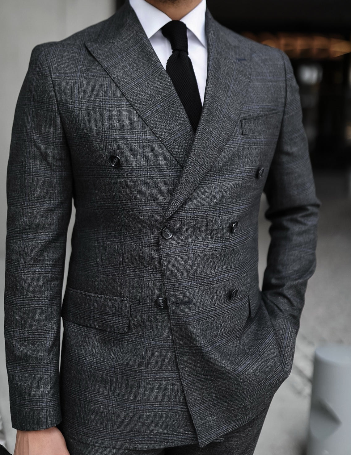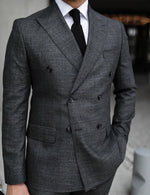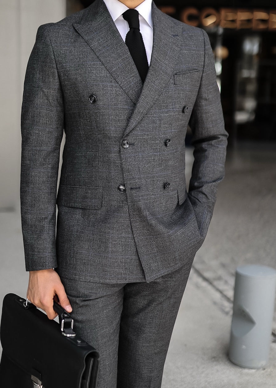 The men’s grey base with blue fine lines double-breasted suit exudes timeless sophistication with a modern twist. Crafted from premium lightweight wool fabric, its subtle checked add a touch of classic charm. The double-breasted jacket features sharp peak lapels, elevating your style game to new heights. Its tailored silhouette provides a sleek and commanding presence, while the six-button front closure adds a touch of vintage flair. The suit’s light grey hue strikes the perfect balance between traditional and contemporary, making it suitable for a range of occasions, from formal business meetings to upscale social gatherings. This ensemble effortlessly combines elegance and confidence, setting you apart in any setting.