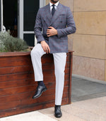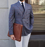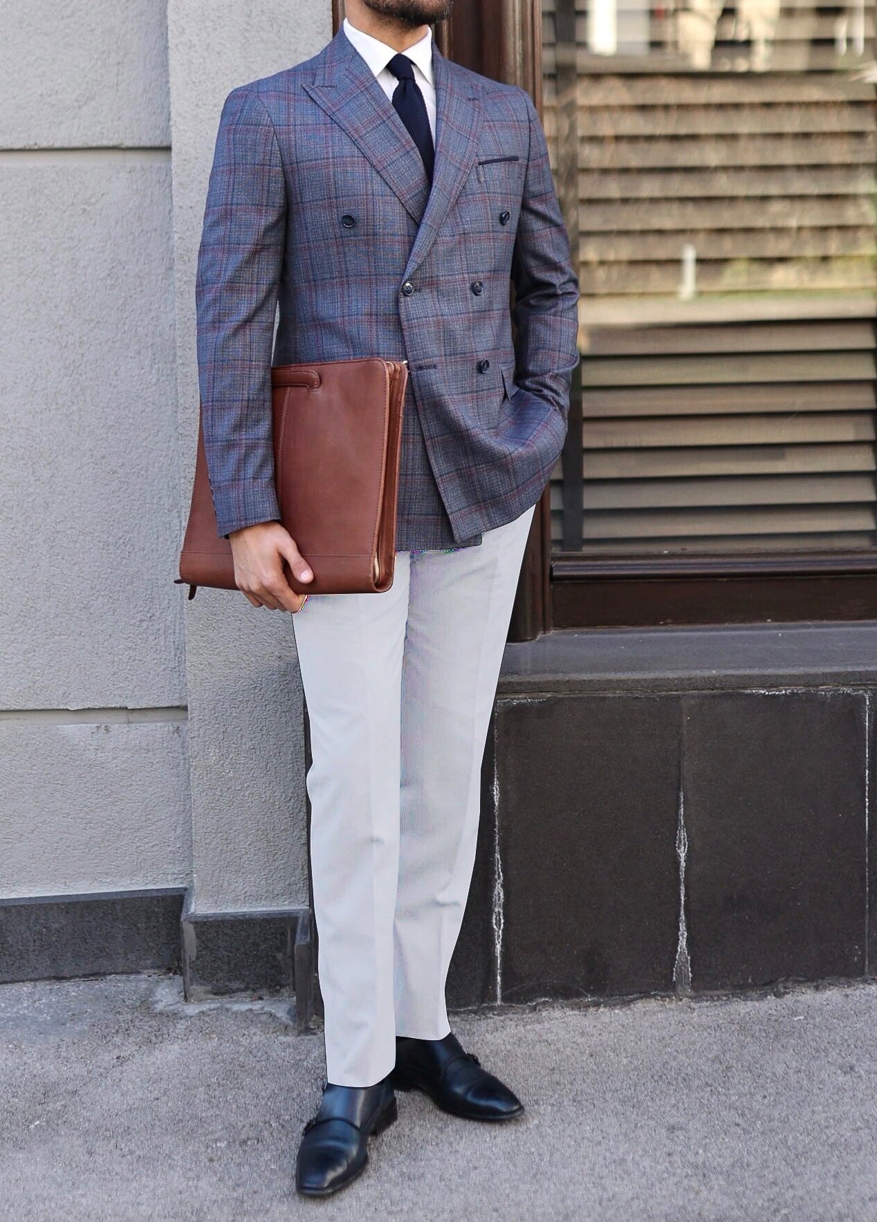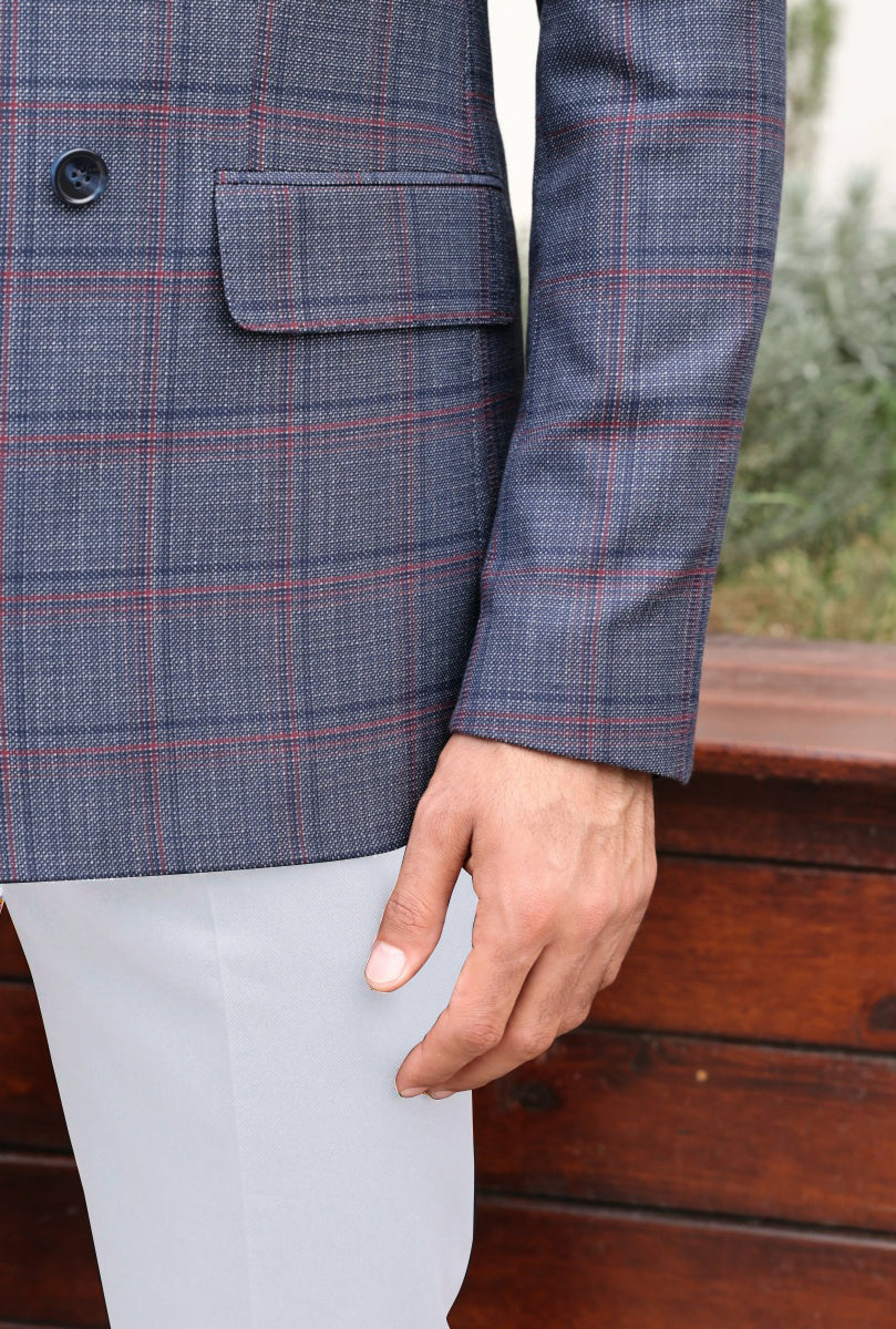 A steel blue checked with red fine lines double breasted blazer with plain white trousers is a stylish and sophisticated outfit that is perfect for a variety of occasions. The steel blue colour is a deep, muted shade that is both classic and contemporary, and pairs well with a variety of other colours.