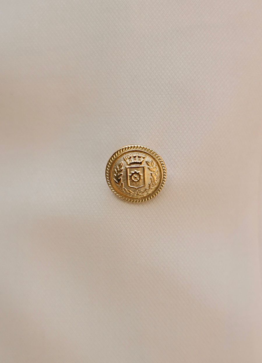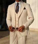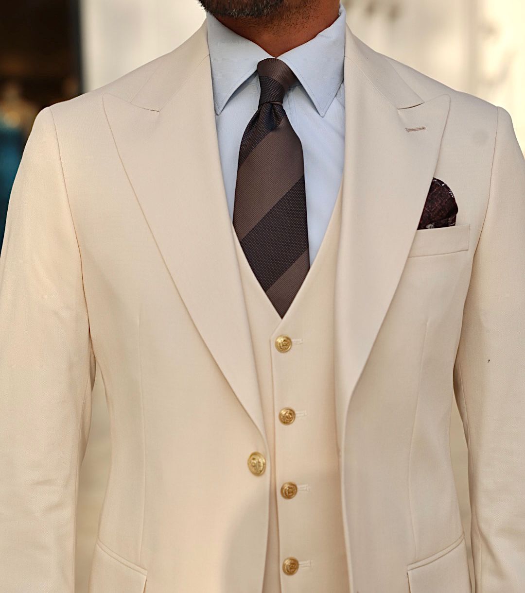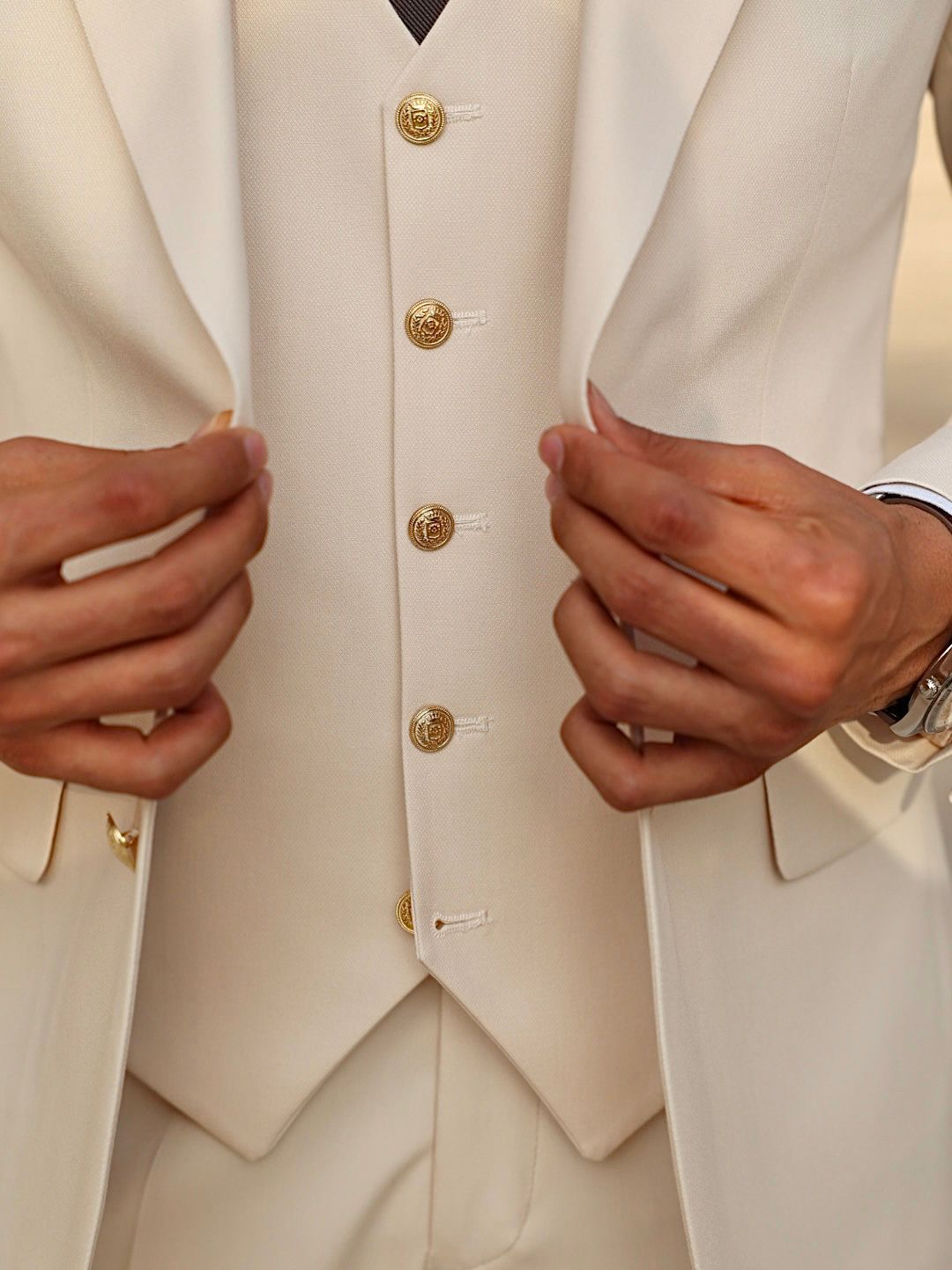 SLIM FIT CREAM MEN’S THREE PIECE SUIT WITH DECORATIVE GOLD BUTTONS