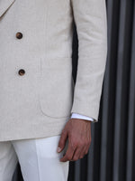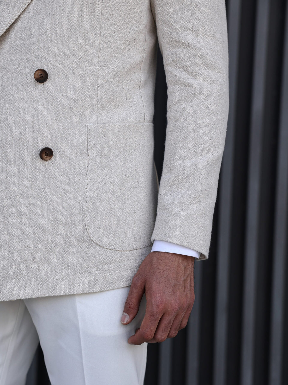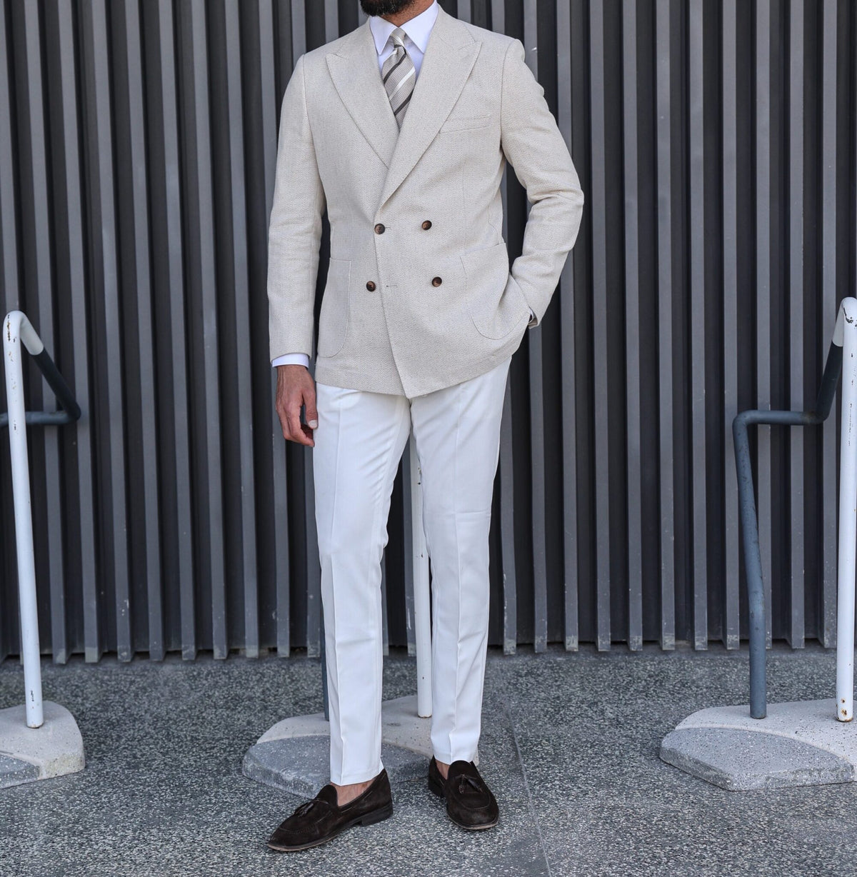 This tailored slim fit cream double breasted blazer paired with white tailor fit trousers is a classic combination for a sophisticated and refined look. The blazer features peak lapels, double-breasted buttons, and flap pockets. The trousers are tailored to fit perfectly with a straight leg design and a flat front. Together, this suit is perfect for formal occasions, weddings, or any event that requires a touch of elegance.
