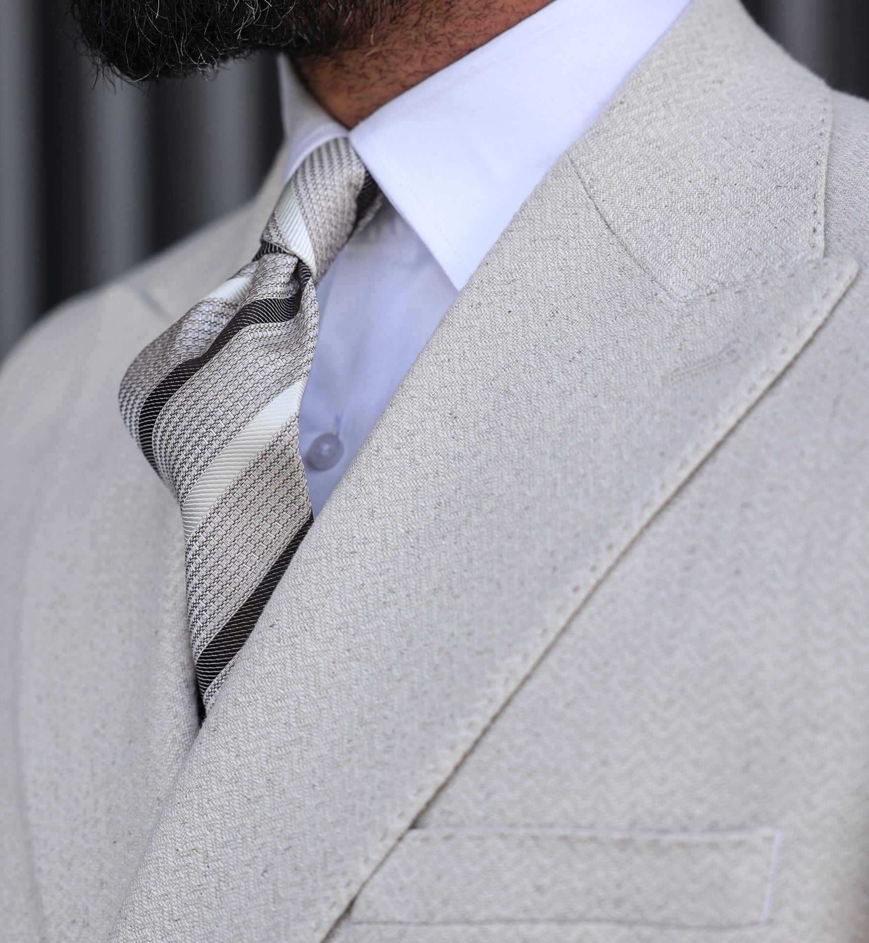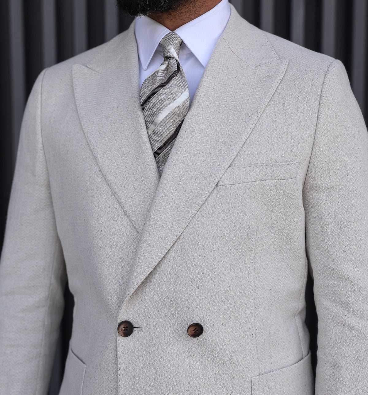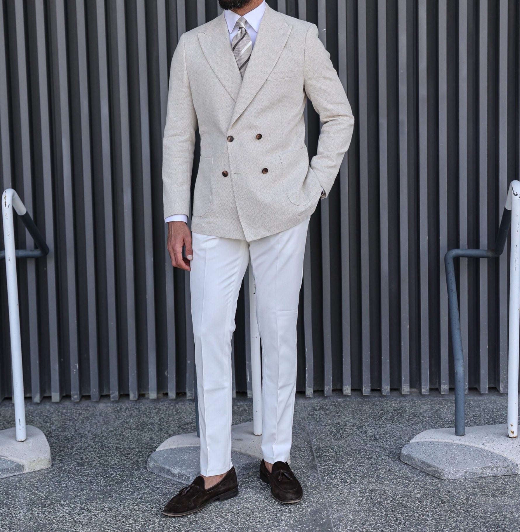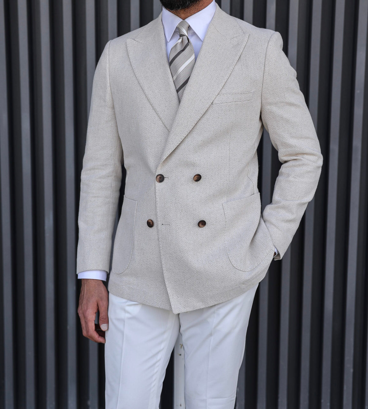 Tailored slim fit cream and white double breasted mixed combine men’s suit with peak lapels