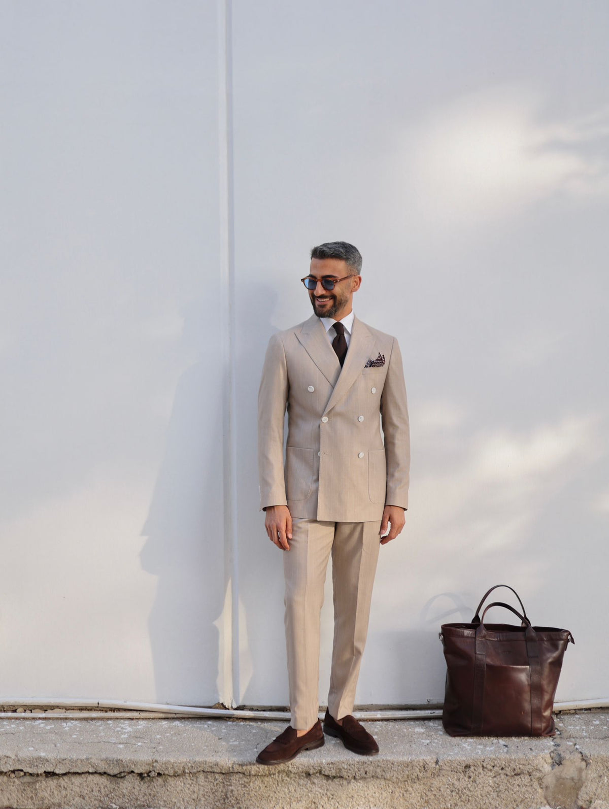 The tailored slim fit cream double-breasted men’s suit exudes refined sophistication. The cream colour adds a touch of elegance and versatility to the suit, making it suitable for various occasions. The double-breasted design and peak lapels elevate the overall aesthetic, creating a sleek and stylish look. This suit is a perfect choice for those seeking a timeless and polished ensemble that exudes confidence and class.