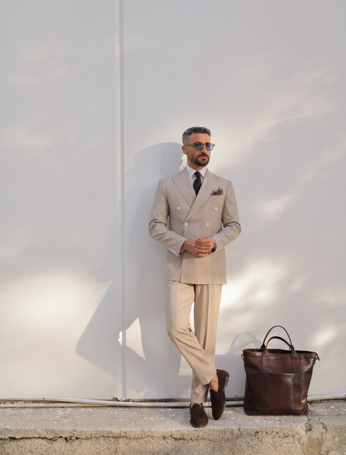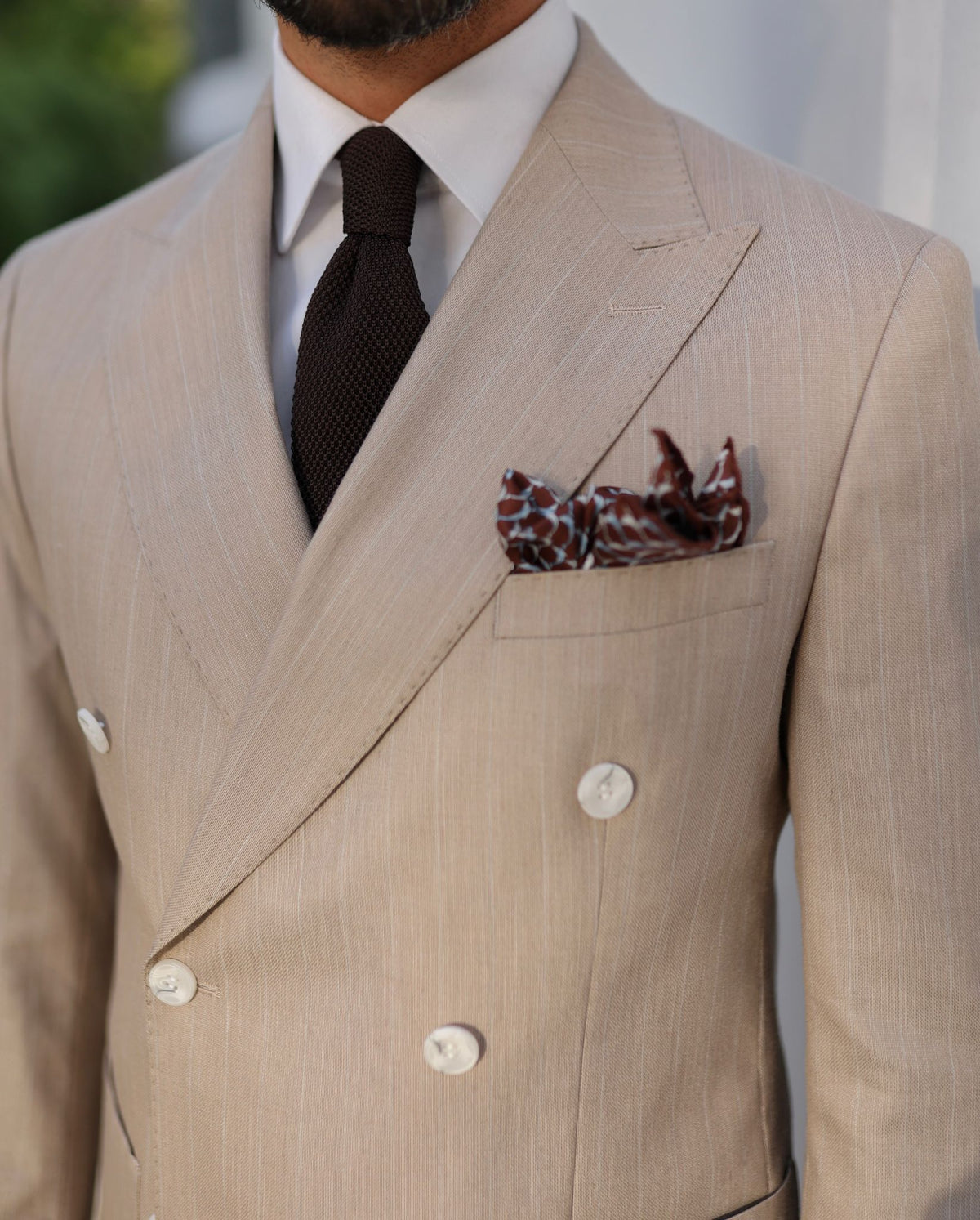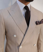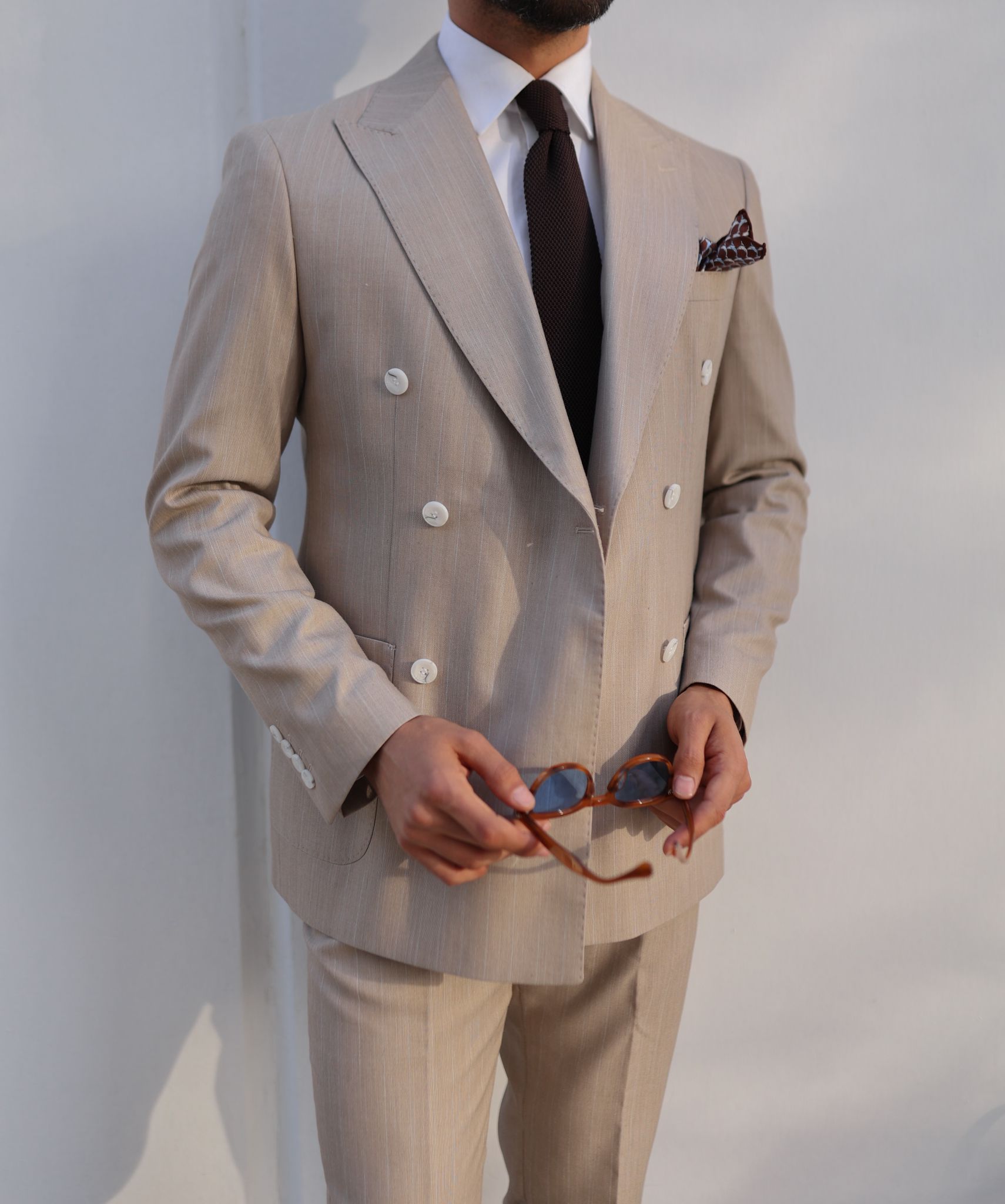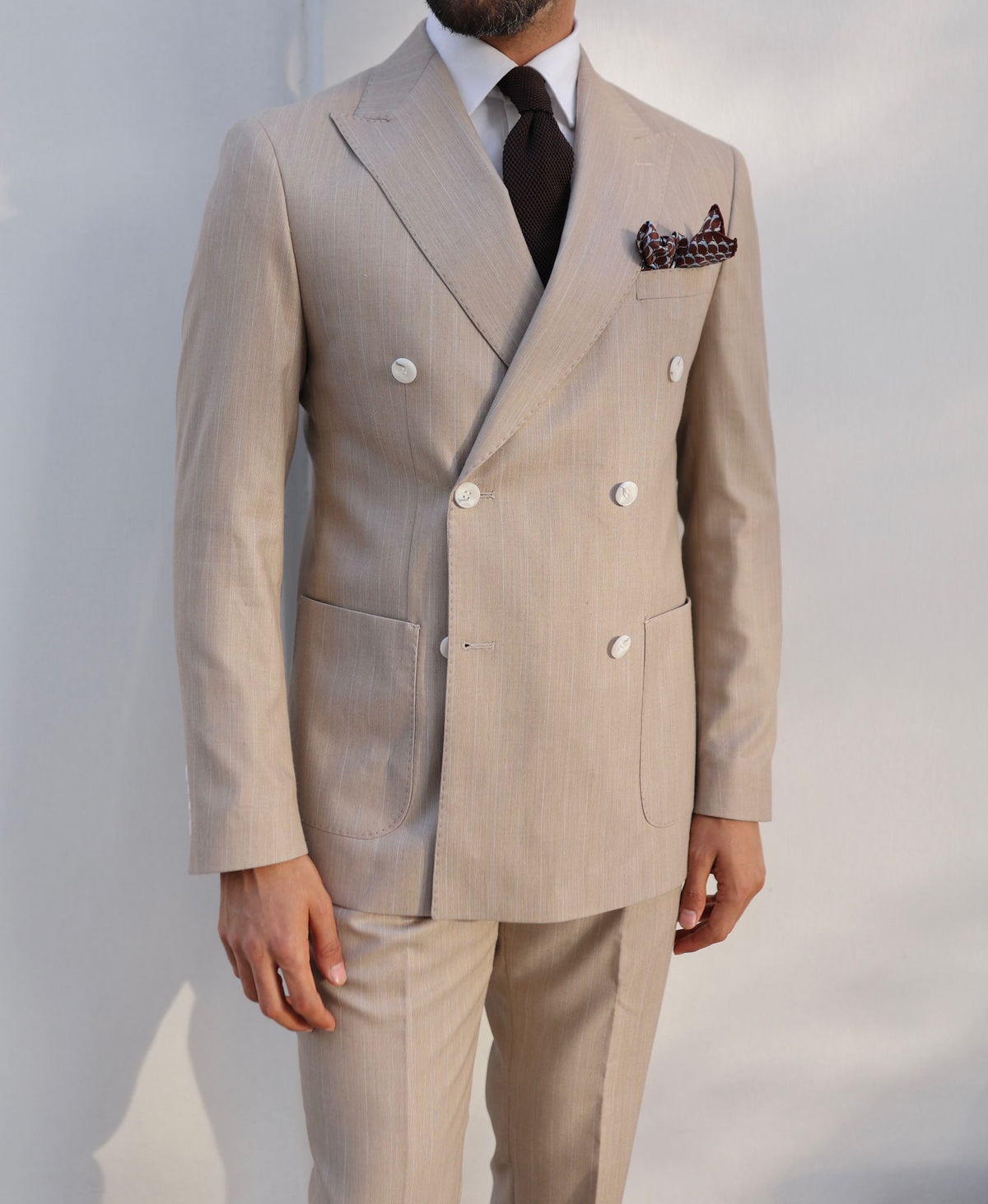 Tailored slim fit cream double breasted pin striped men’s suit with peak lapels