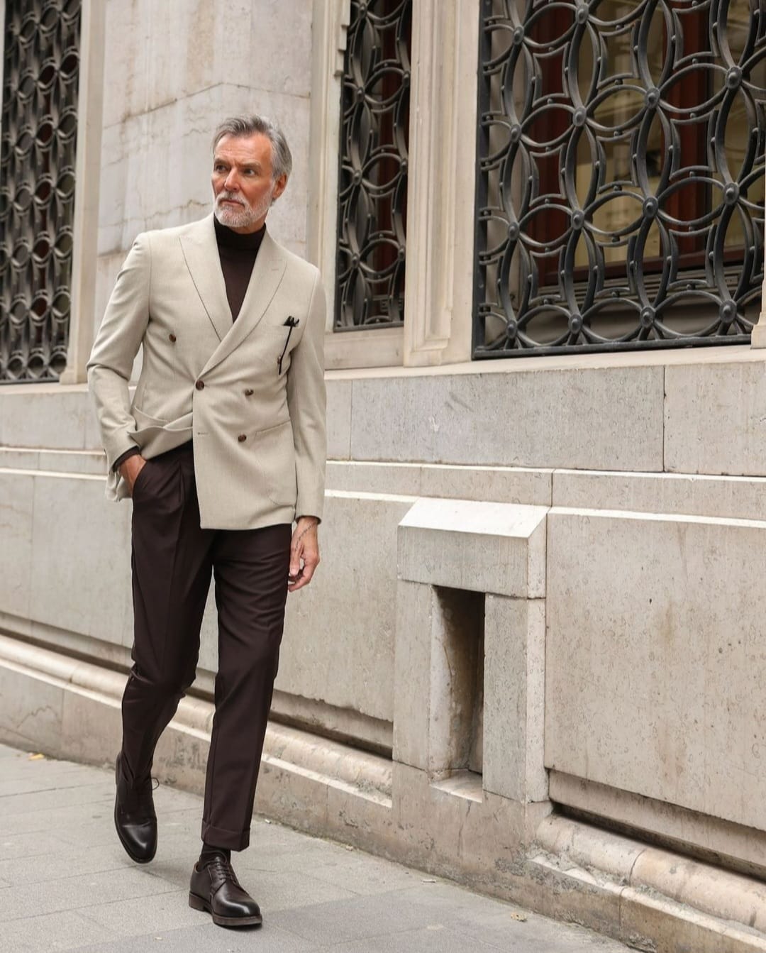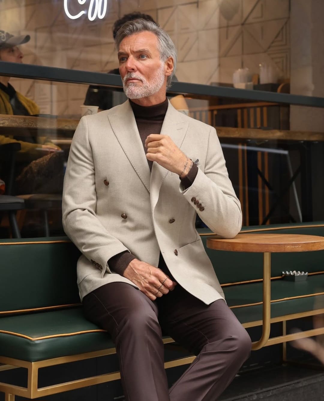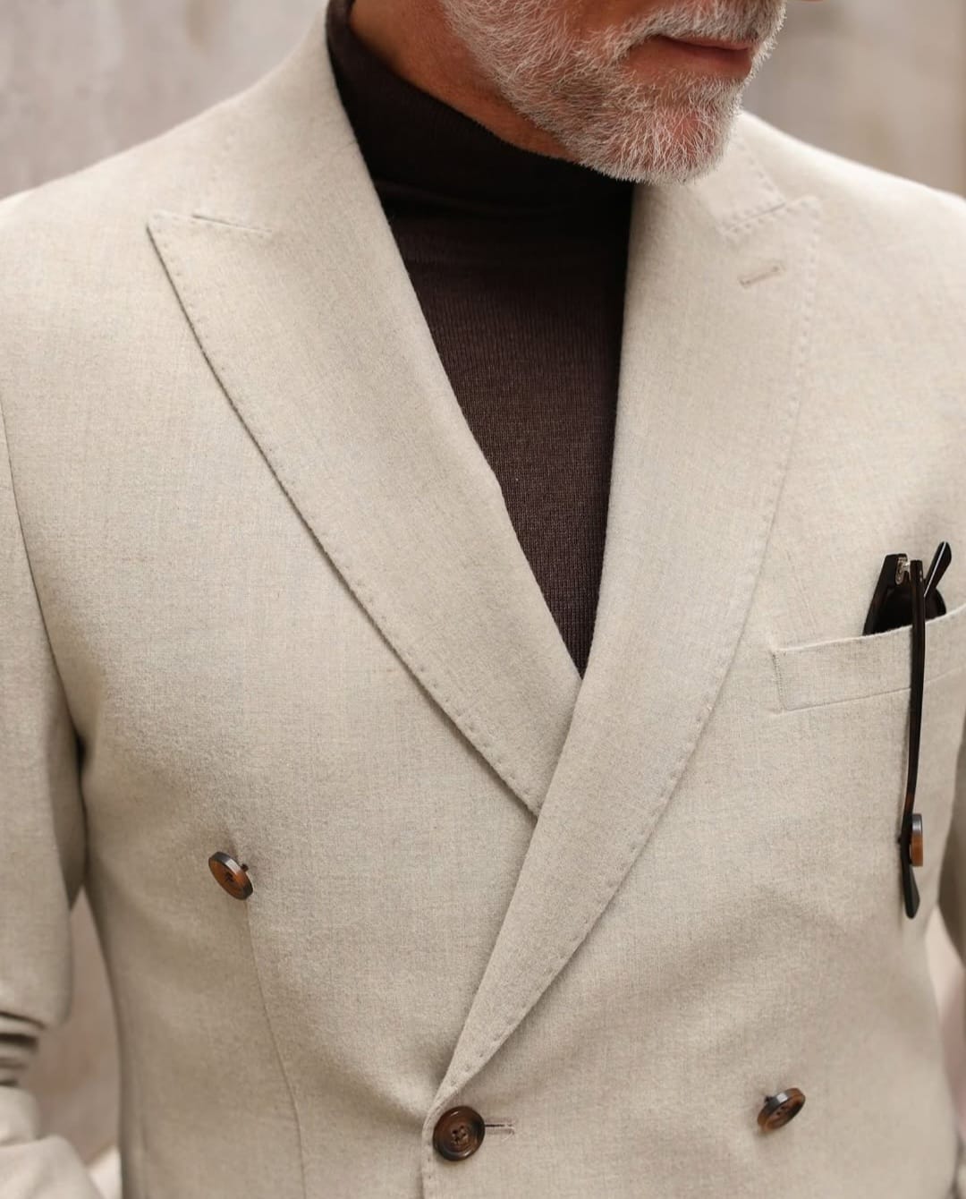 This tailored slim fit beige double breasted blazer paired with mocca brown tailor fit trousers is a classic combination for a sophisticated and refined look. The blazer features peak lapels, double-breasted buttons, and patch pockets. The trousers are tailored to fit perfectly with a straight leg design and a flat front. Together, this suit is perfect for formal occasions, weddings, or any event that requires a touch of elegance.