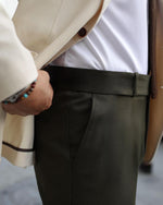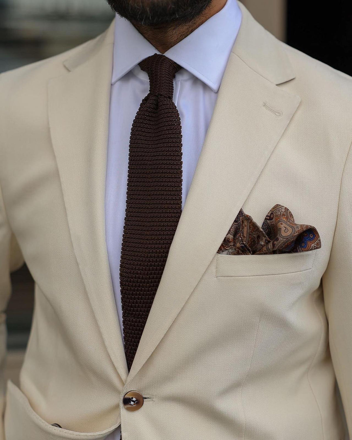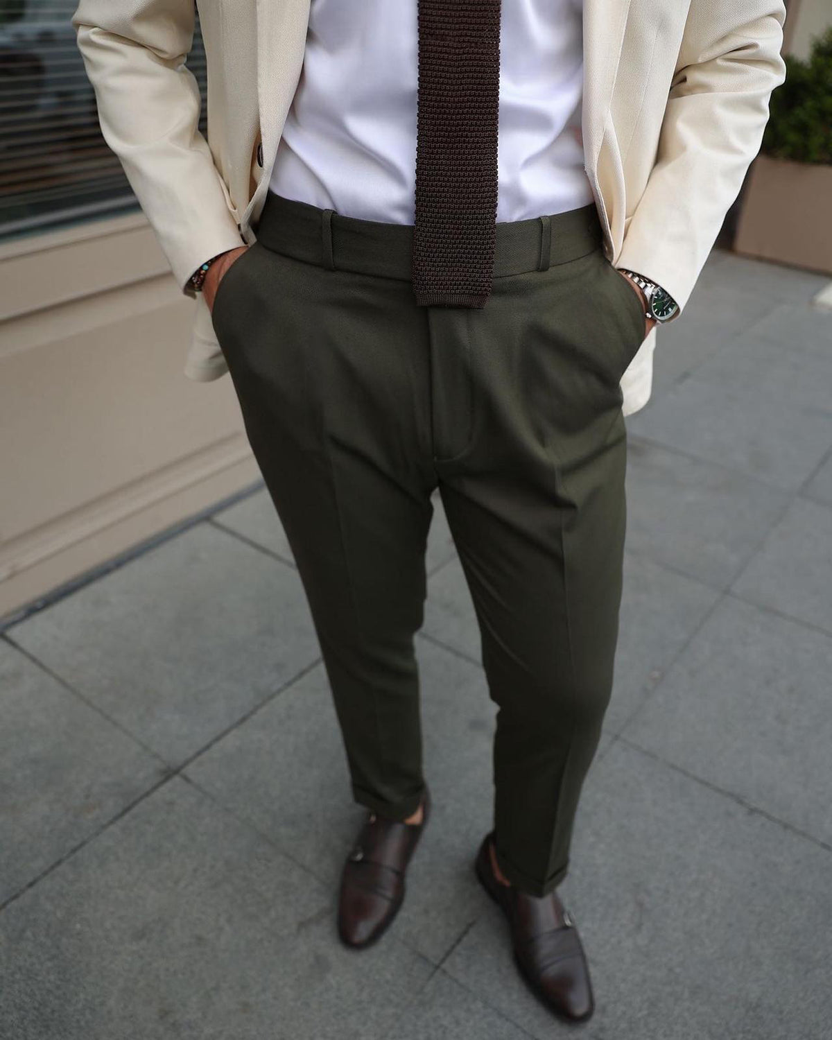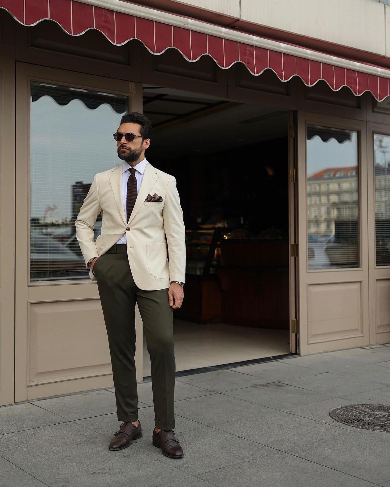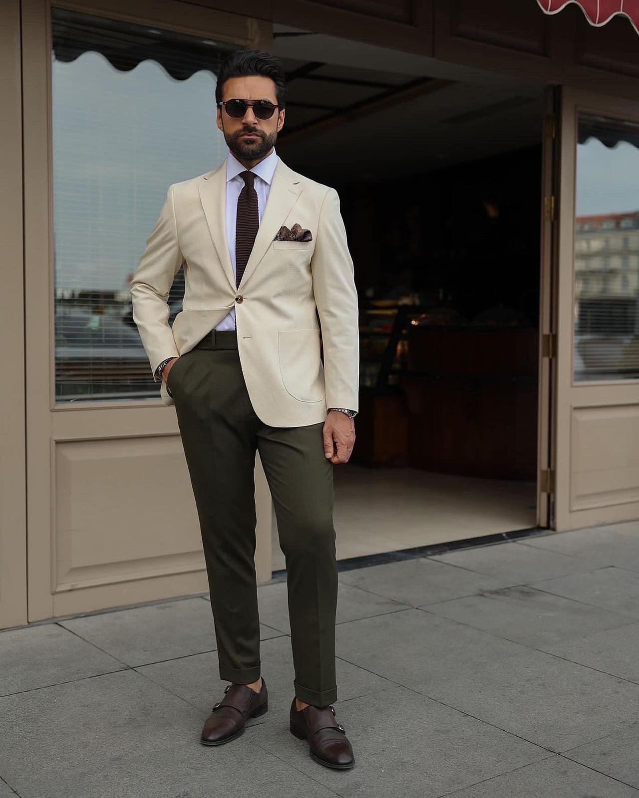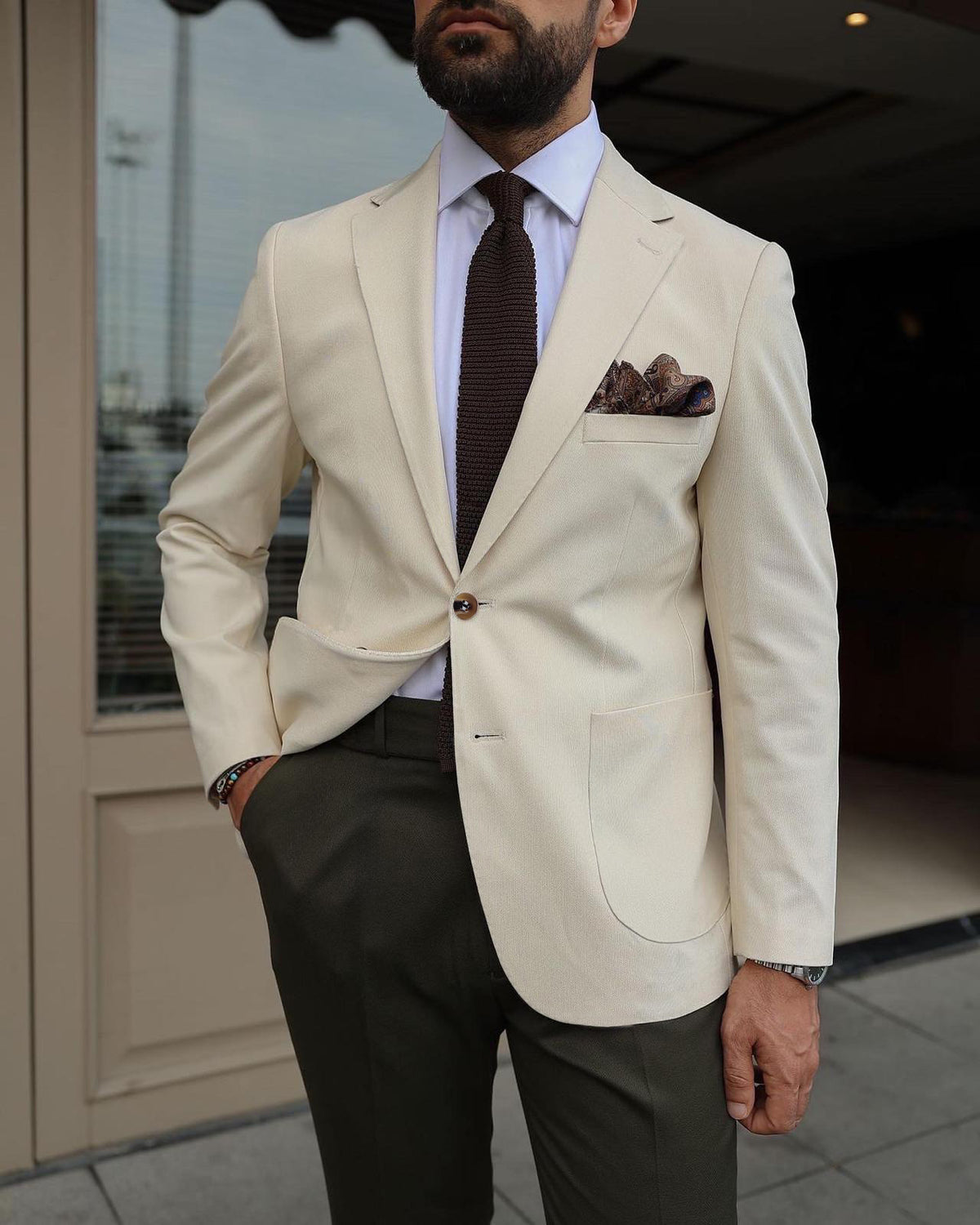 Slim fit cream and hunter green mixed two piece men’s suit with notch lapels