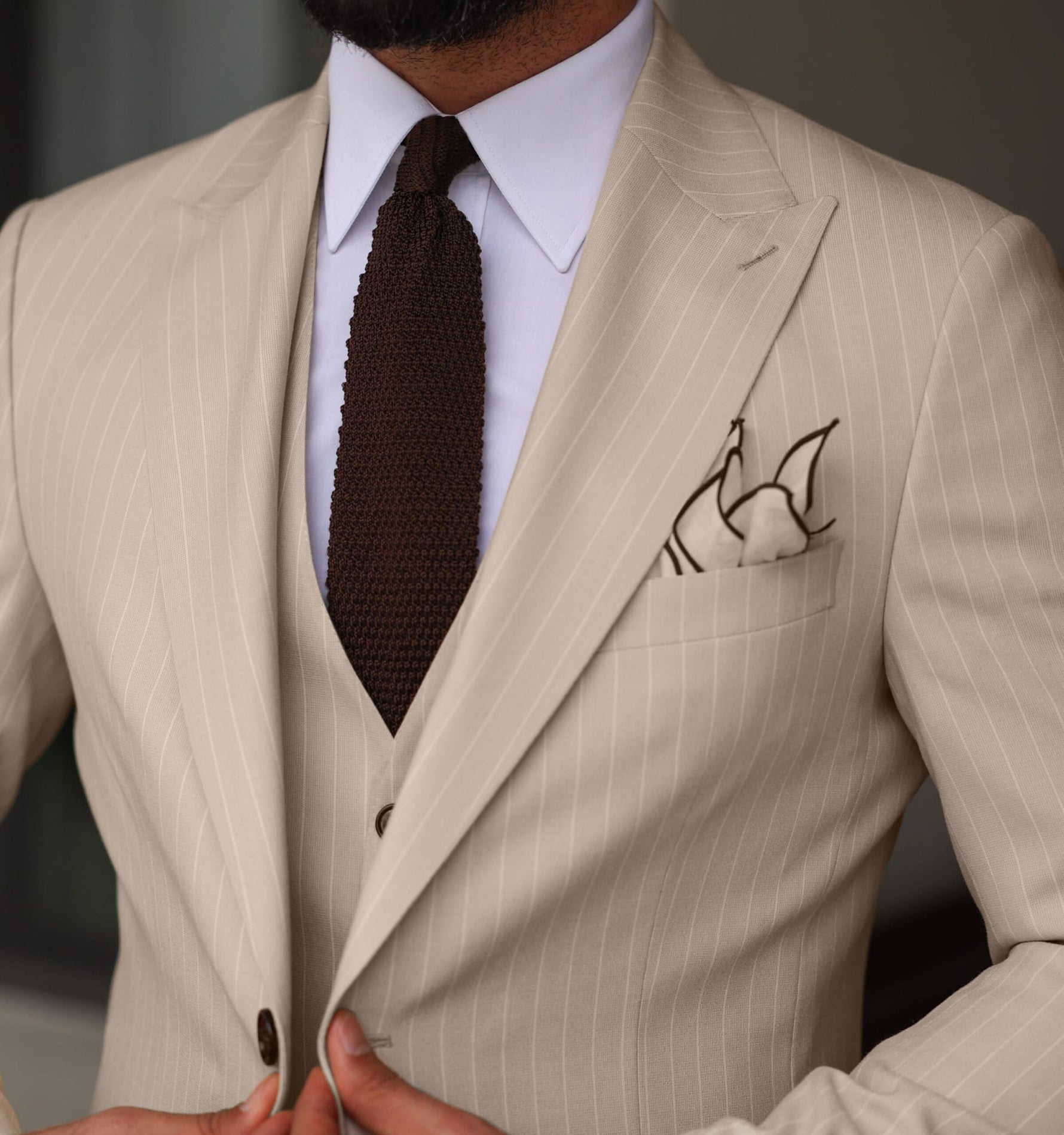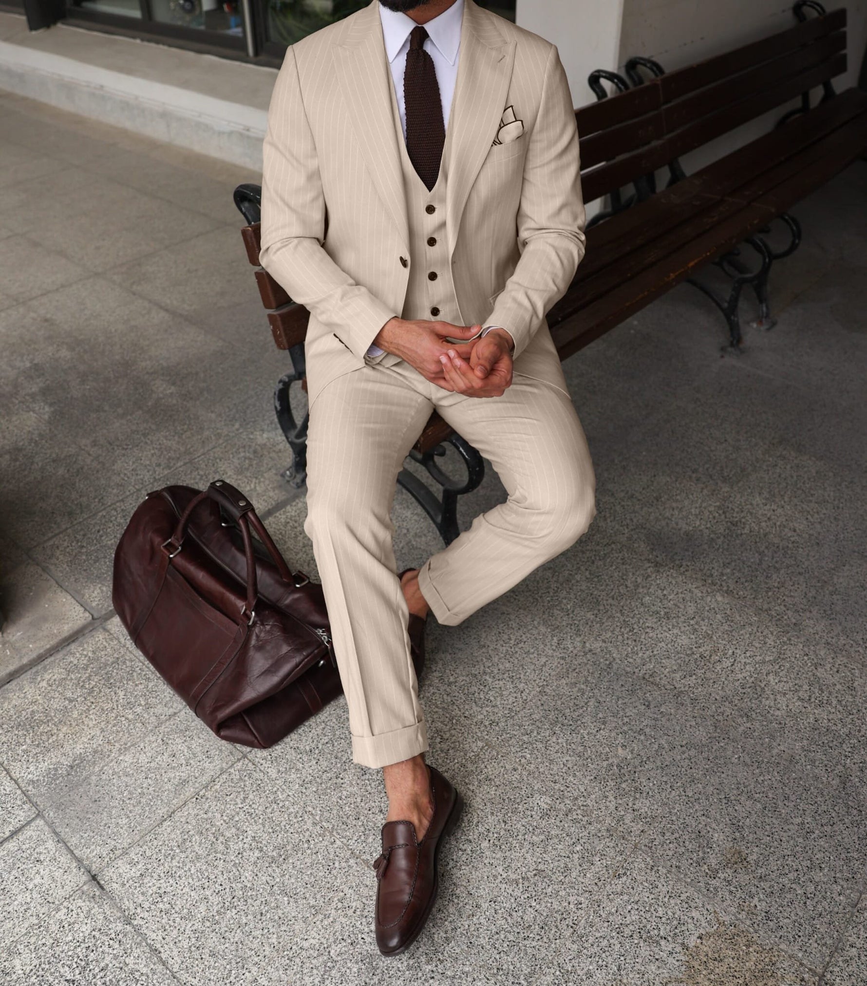 Sophisticated and effortlessly elegant, the Beige Pinstripe Three-Piece Suit is a timeless expression of modern tailoring. Crafted from a premium wool-blend fabric, this suit offers a refined texture and a lightweight, breathable feel — ideal for both formal and semi-formal occasions.