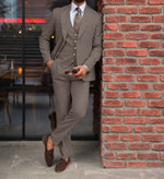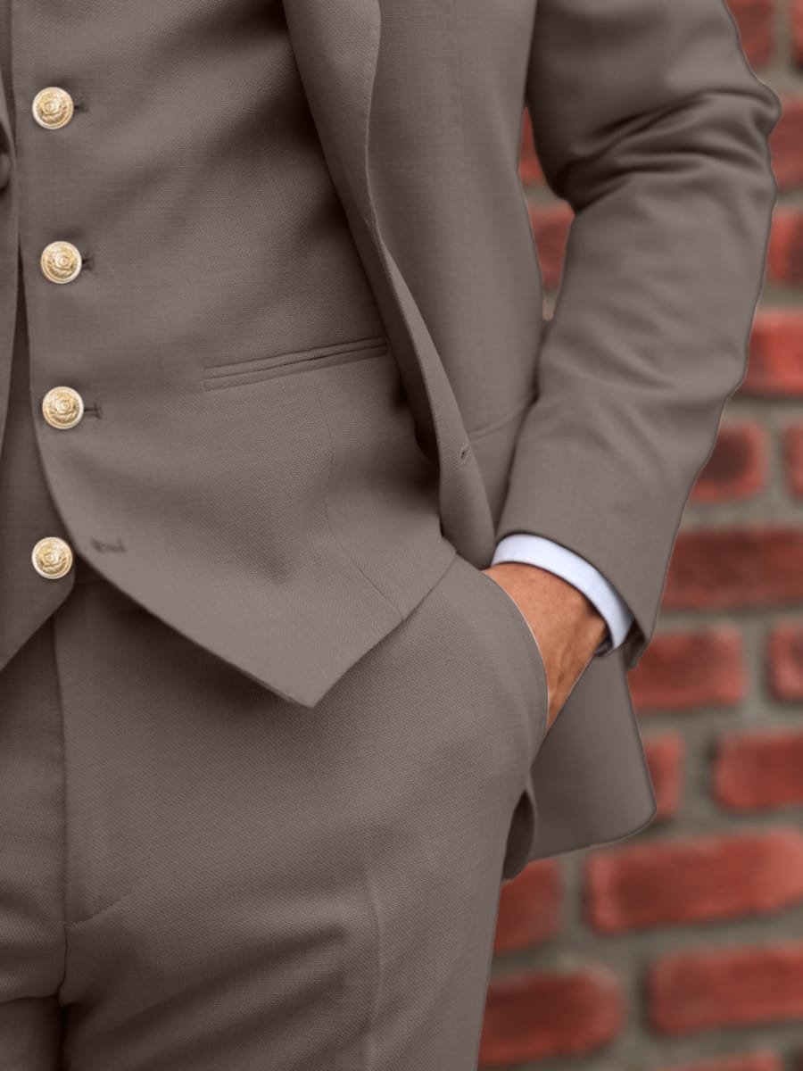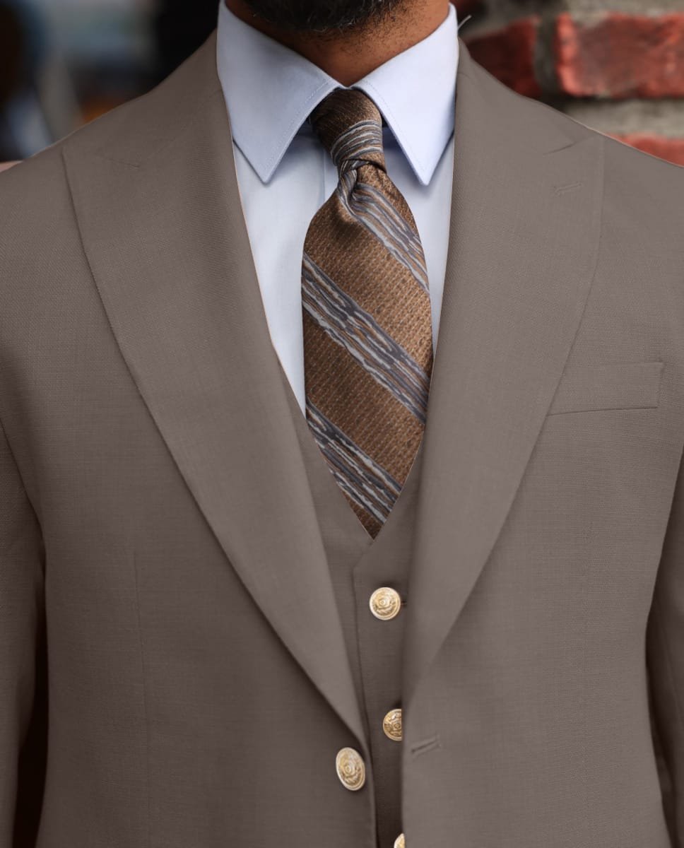 A taupe three piece suit with gold buttons can be a stylish and sophisticated choice for formal or business attire. The three piece style, with its matching waistcoat and trousers, adds an extra touch of formality and sophistication. The taupe colour is light and neutral, making it suitable for a wide range of occasions, and the gold buttons add a touch of glamour and elegance to the suit. Depending on the occasion, you can choose to dress the suit up or down by pairing it with different shirt and tie combinations. For a more formal look, you might pair the suit with a white dress shirt and a dark tie, while for a more casual look, you might opt for a light-colored shirt and a patterned tie. No matter how you choose to style it, a taupe three piece suit with gold buttons is sure to make a fashionable and polished statement.