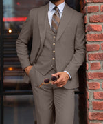 Slim fit light taupe men’s three piece suit with peak lapels