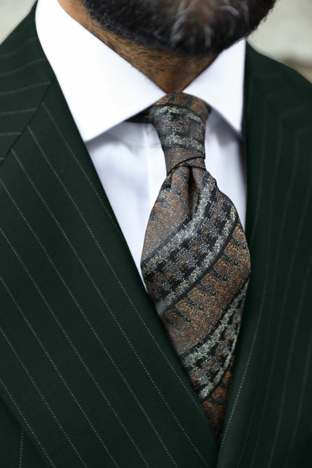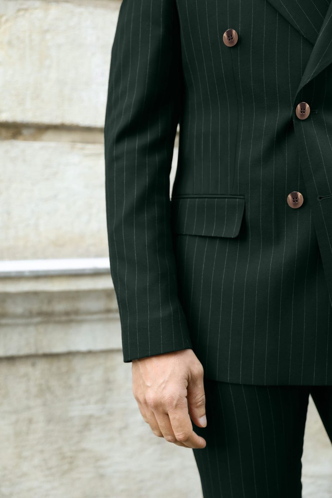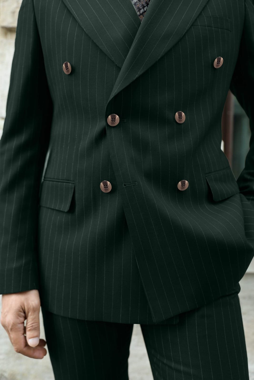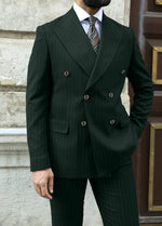 Tailored slim fit forest green double breasted pinstripe men’s suit with peak lapels