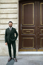 Elevate your style with a tailored slim fit forest green double-breasted pinstripe men’s suit. The pinstripe pattern adds a touch of sophistication to the rich forest green hue, creating a harmonious blend of modern and classic. The peak lapels enhance its timeless appeal, making it ideal for formal events. This ensemble exudes confidence and refinement, allowing you to stand out with a distinctive and sophisticated look. Whether for upscale gatherings or special occasions, this suit showcases your impeccable taste and individuality