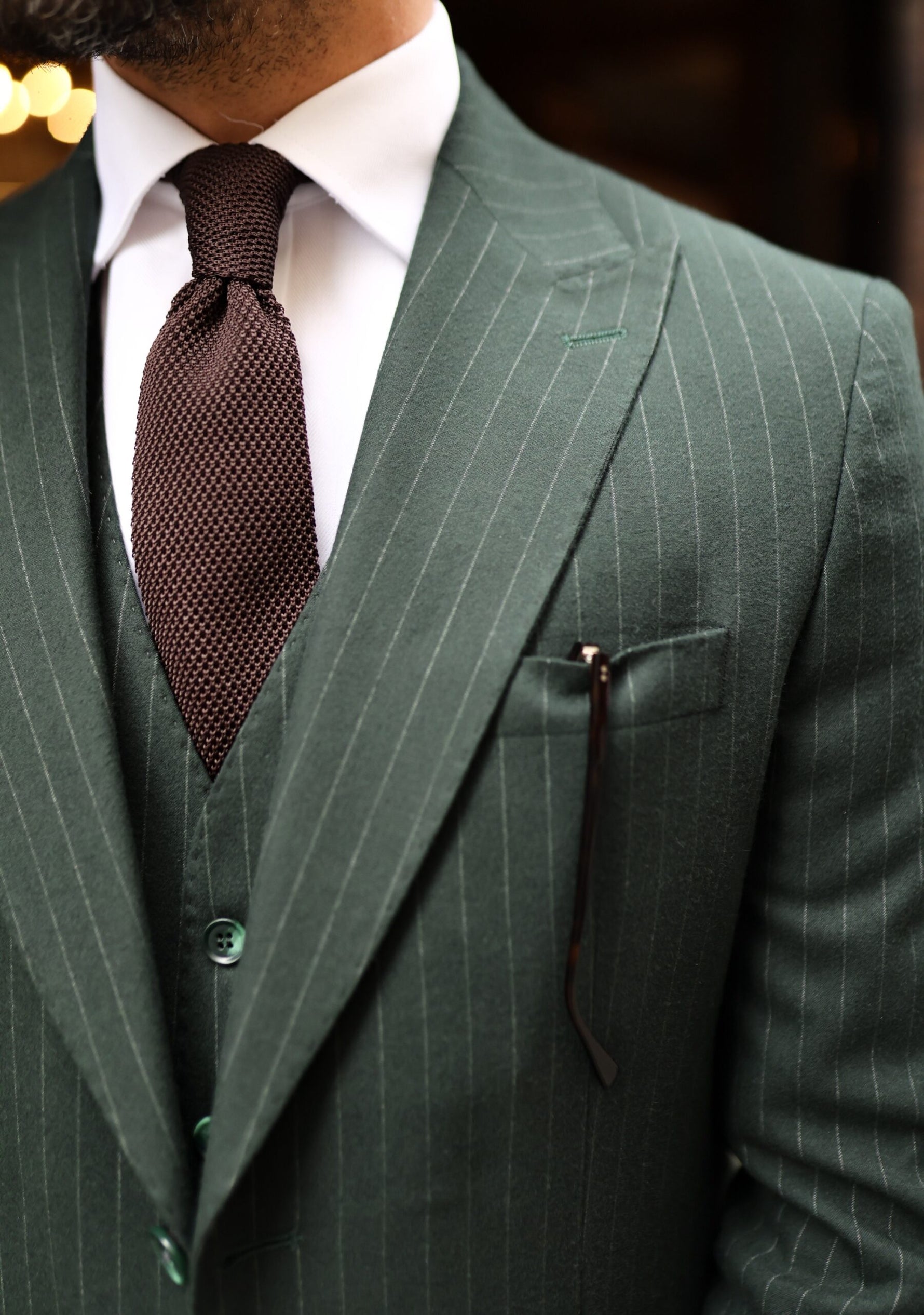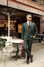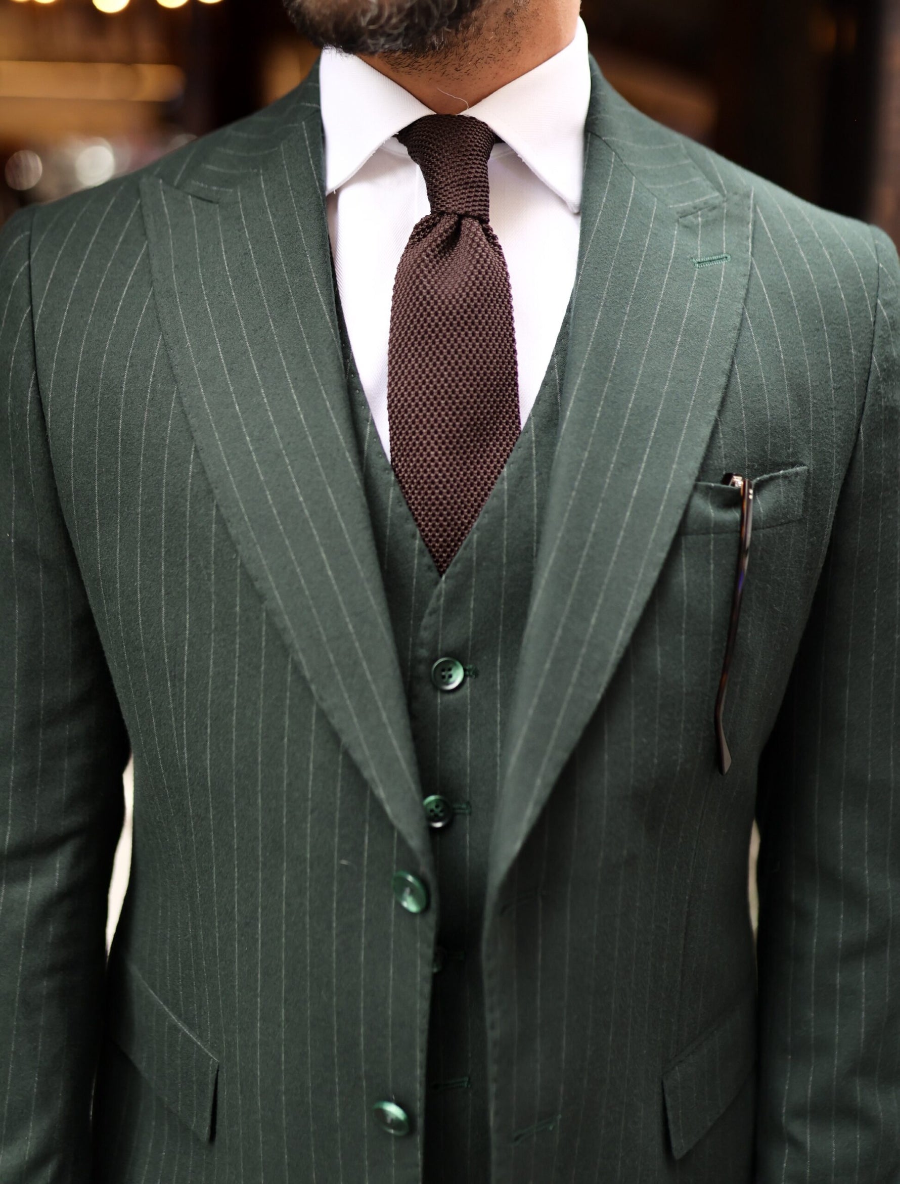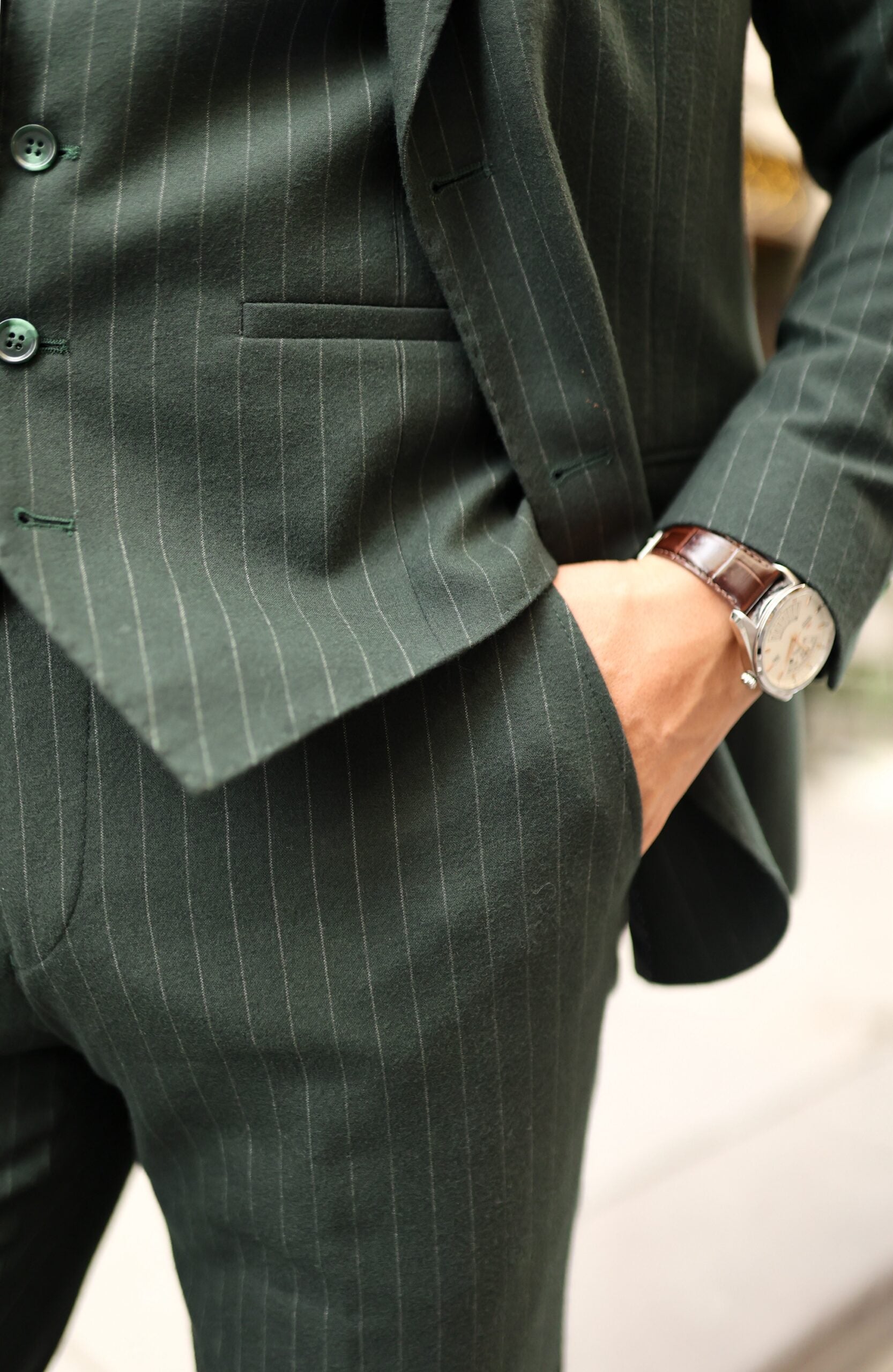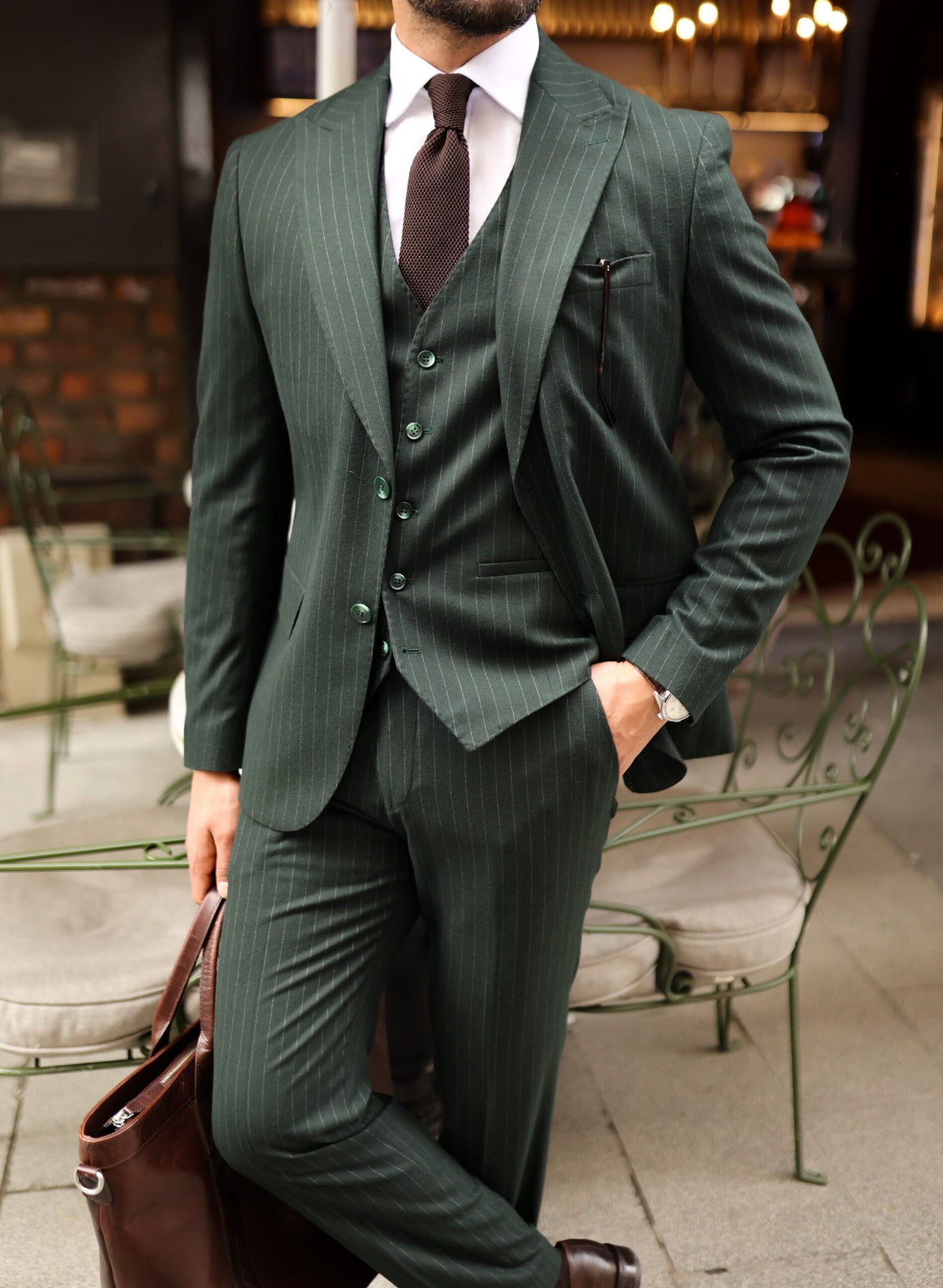 Tailored slim fit forest green three piece pinstripe men’s suit with peak lapels