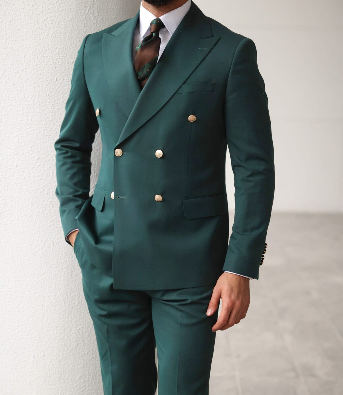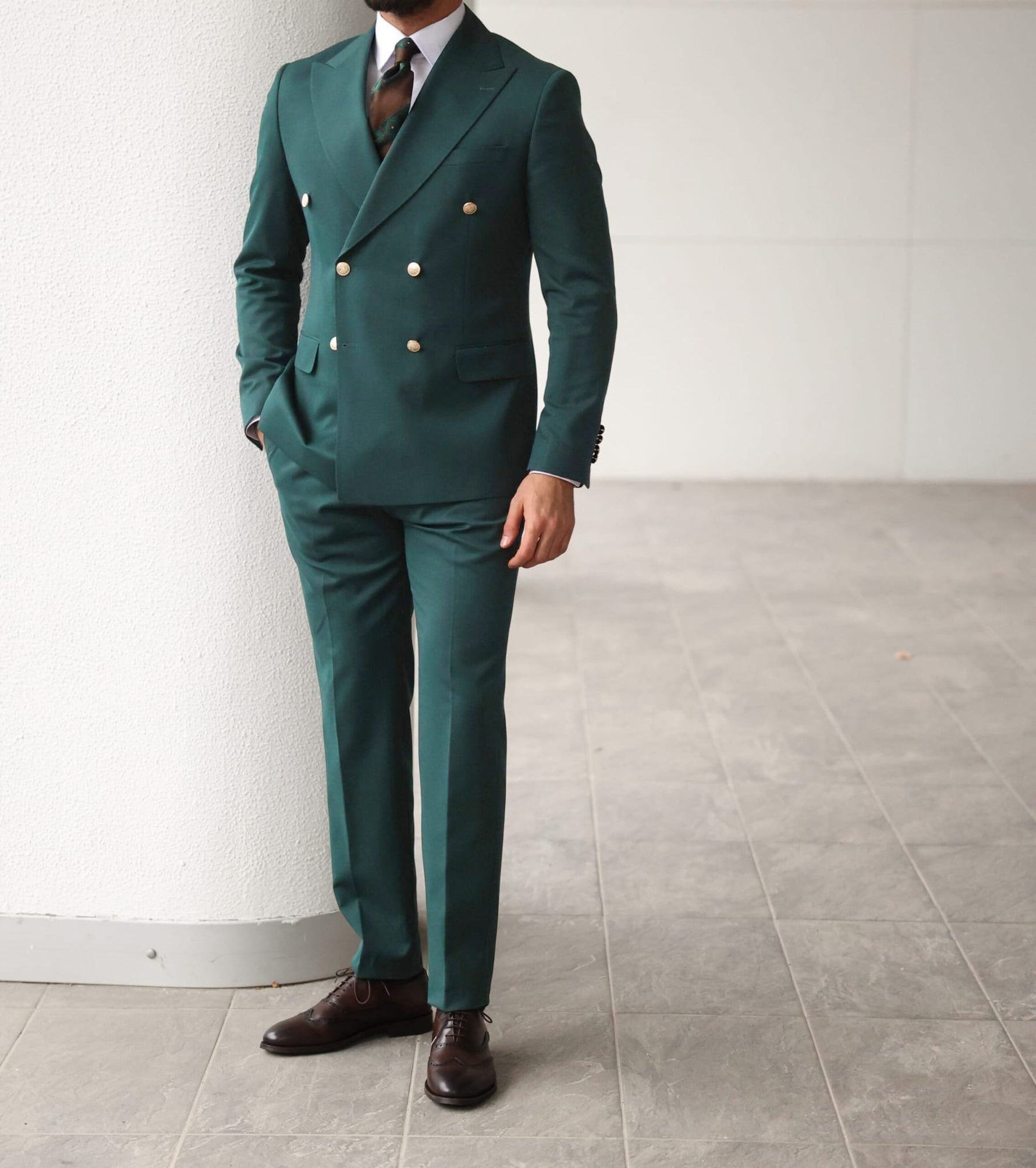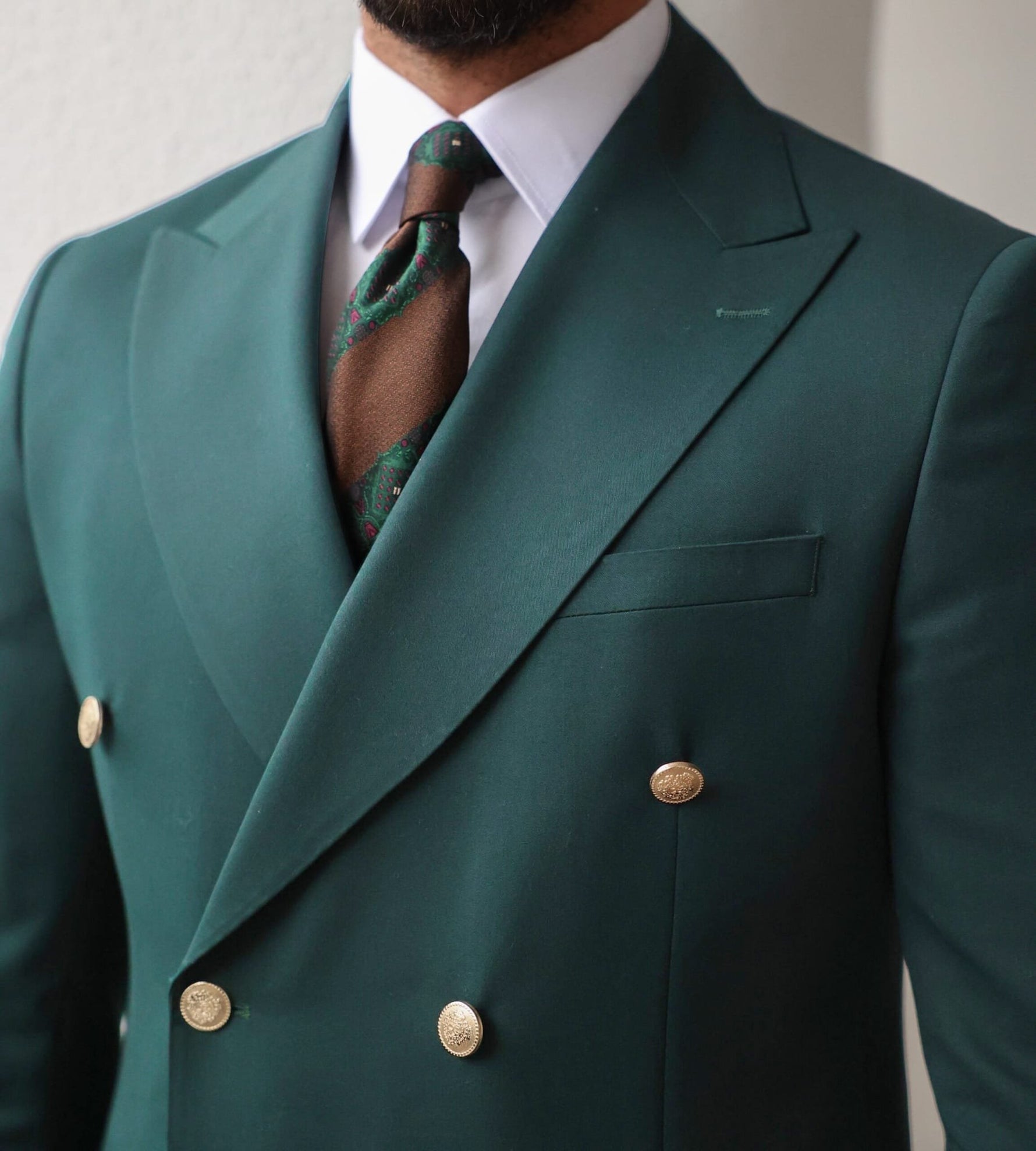 The jacket features broad peak lapels, a powerful six-button double-breasted closure, and sharp, sculpted shoulders that define a strong masculine silhouette. Its standout detail — premium gold metal buttons — adds a luxurious touch, enhancing the richness of the green fabric while delivering a subtle statement of elegance and character.