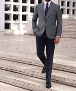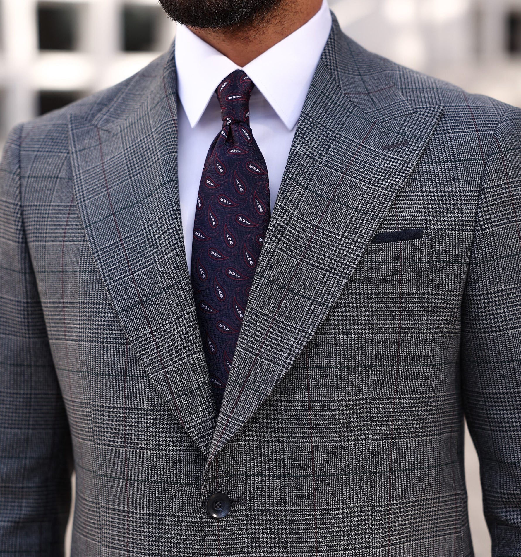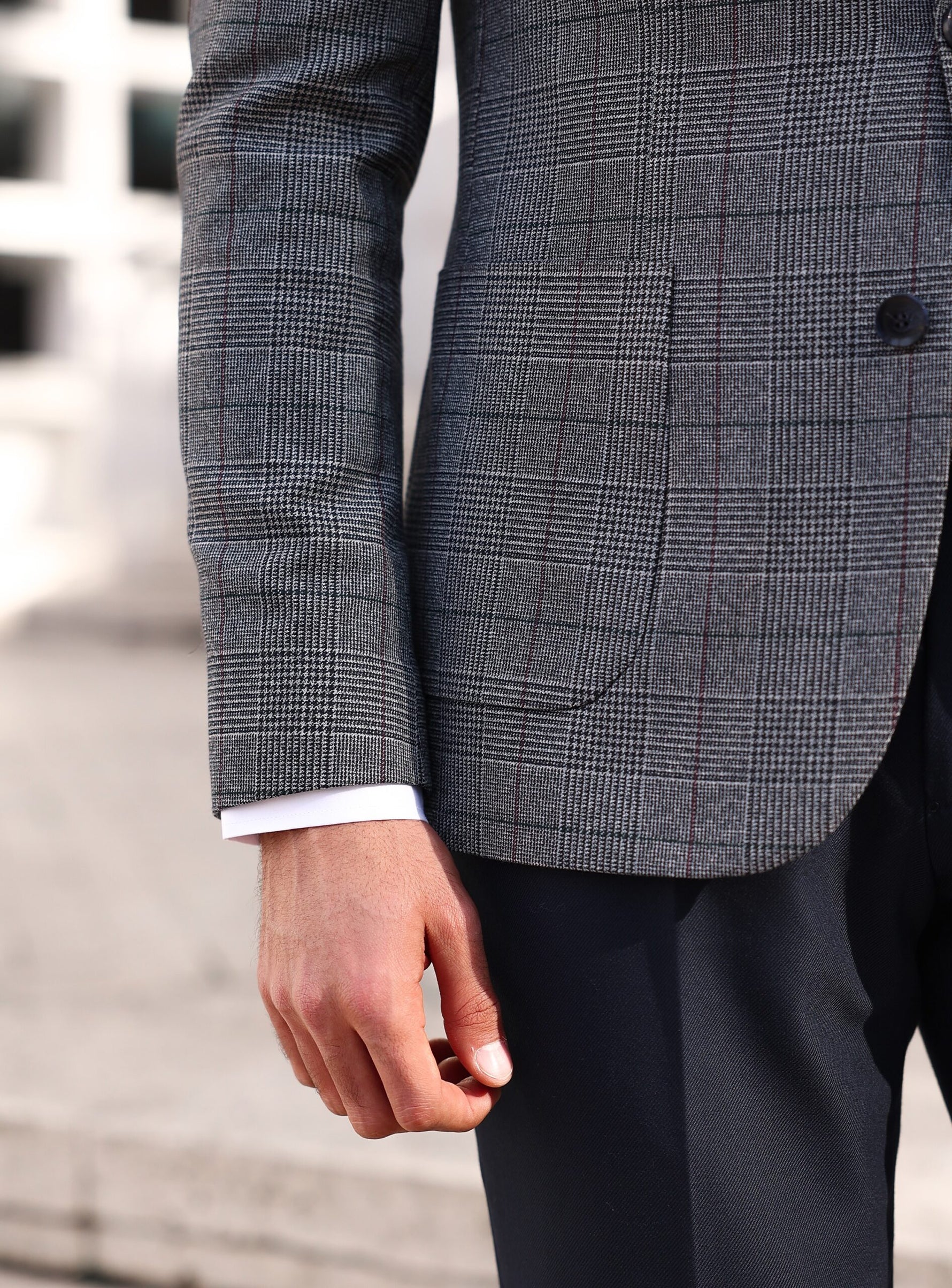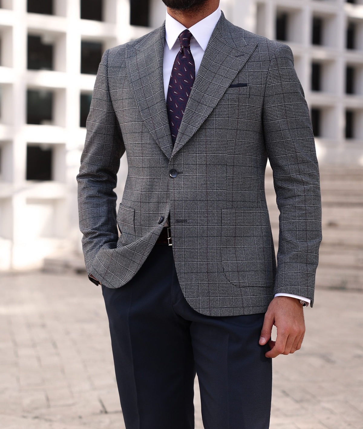 Slim fit light grey and black chequered mixed two piece men’s suit with peak lapels